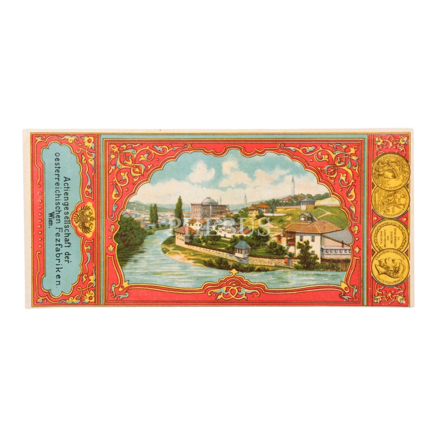 Bir Türk şehri görselli fes etiketi, "Actiengesellschaft der oesterreichischen Fezfabriken - Wien", 22x10 cm...