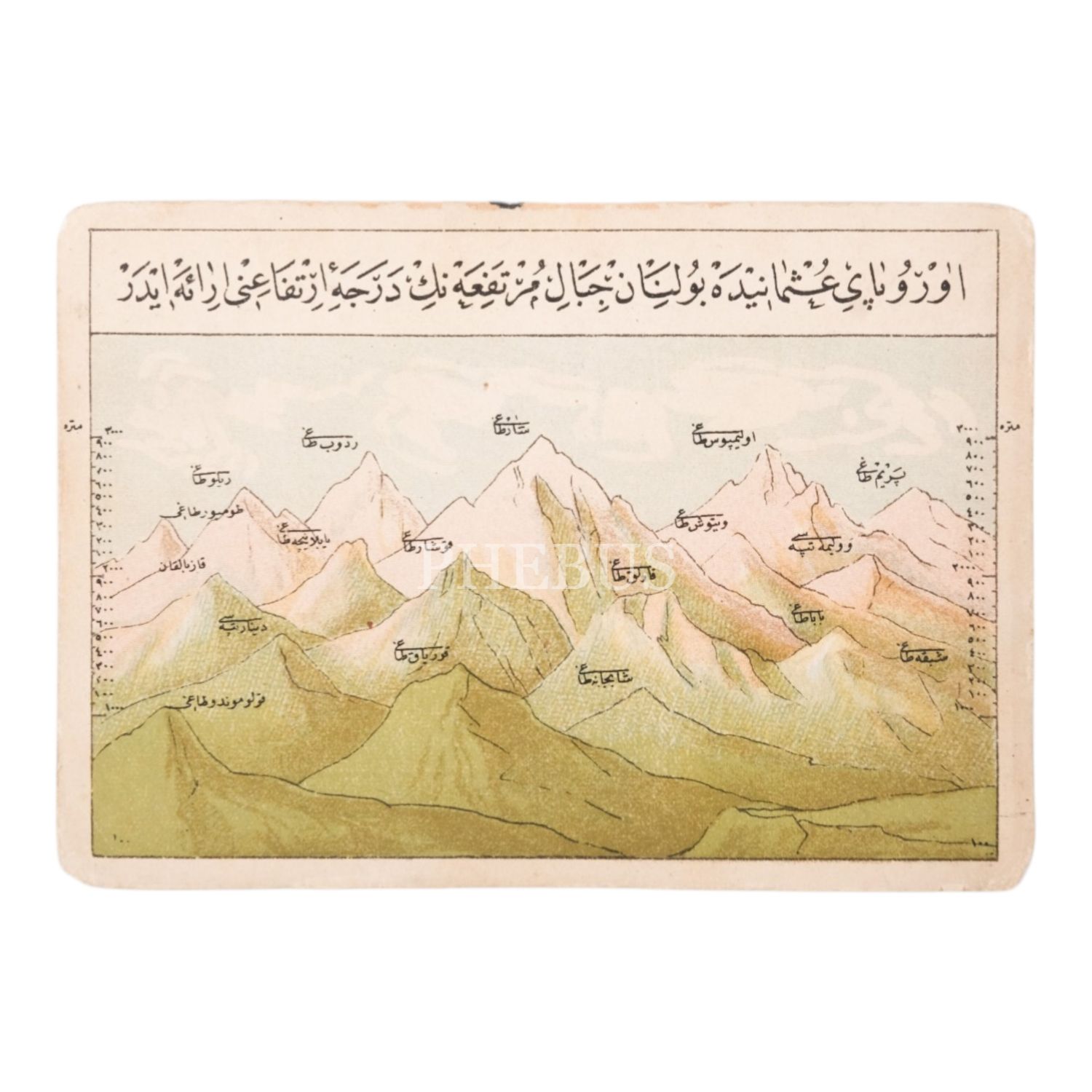 "Avrupa-yı Osmani´de bulunan cebel-i mürtefeanın derece-i irtifaını izae eder" başlıklı, Osmanlı topraklarındaki dağların yüksekliklerinin gösterildiği kartpostal, 14x9 cm...