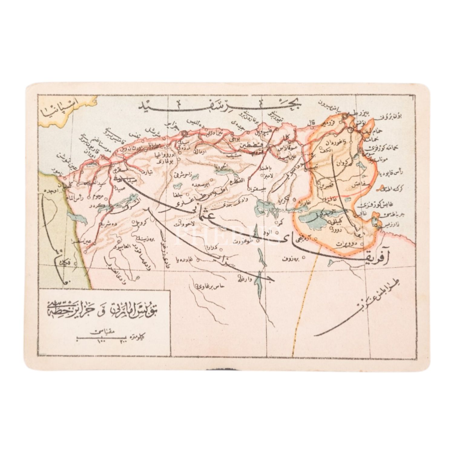 "Umumi Cep Atlası" serisinden, "Tunus İmareti ve Cezayir" başlıklı harita görselli kartpostal, 14x9 cm...
