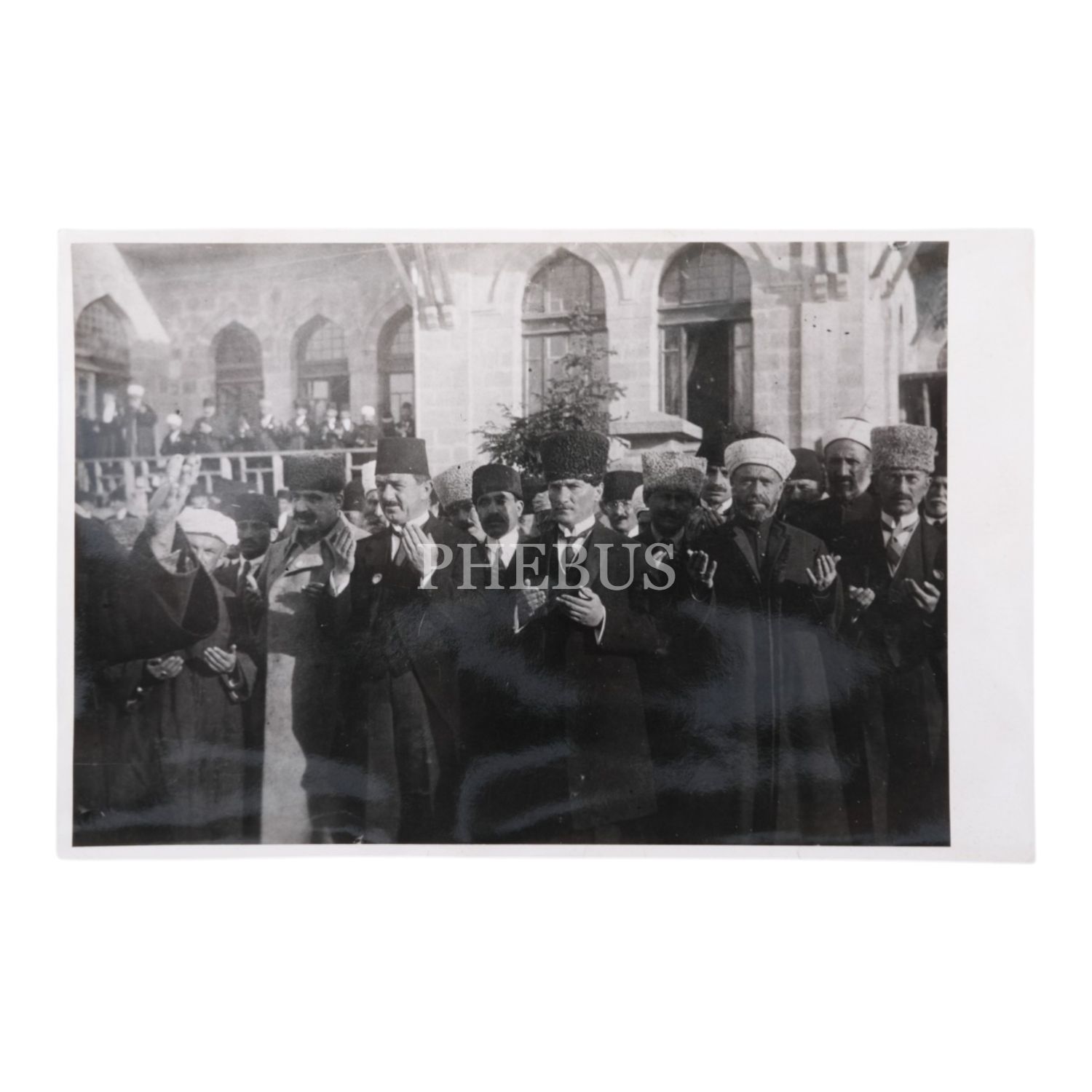 Mustafa Kemal Atatürk, Ramazan Bayramı´nda, TBMM önünde; Rauf Orbay, Fevzi Çakmak, Abdullah Azmi Efendi, İbrahim Bey ve 1. Dönem milletvekilleri ile dua okuyor, 28 Mayıs 1922, 18x12 cm...