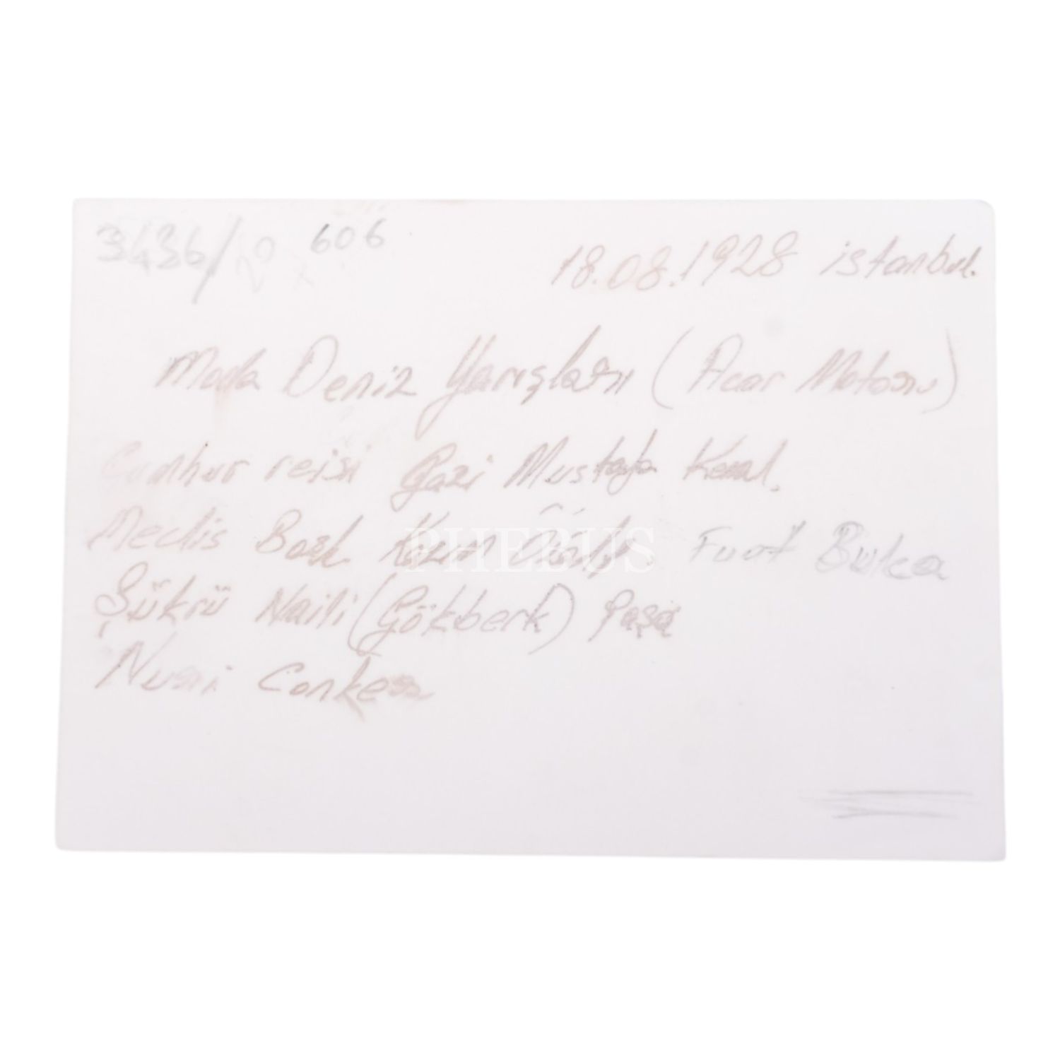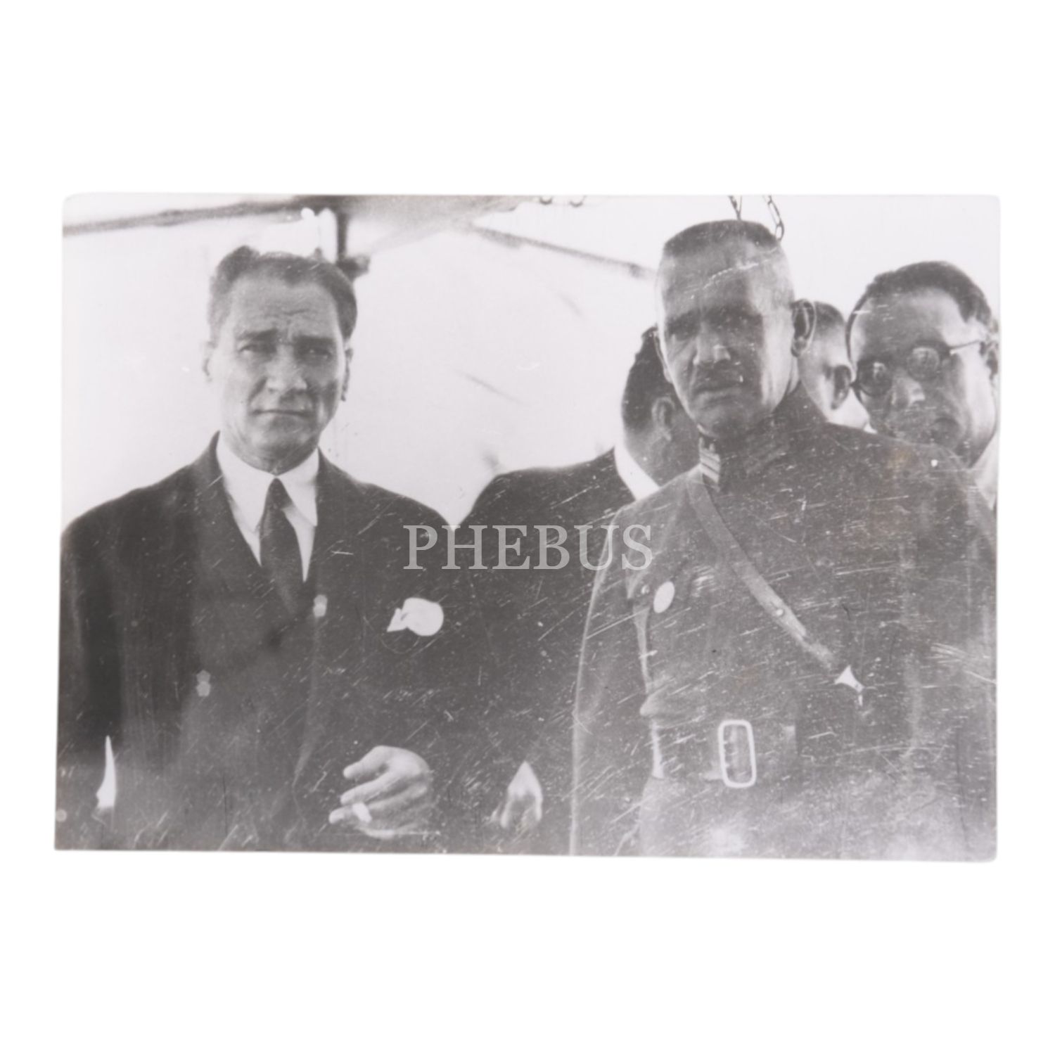 Mustafa Kemal Atatürk, İşgal kuvvetlerinin çekilmesinden sonra Türk ordusuyla İstanbul´a giren ilk kumandan olan Şükrü Naili Paşa ve çocukluk arkadaşı Nuri Conker ile birlikte Moda Deniz Yarışları´nı seyrediyor, 18 Ağustos 1928, 13x9 cm...