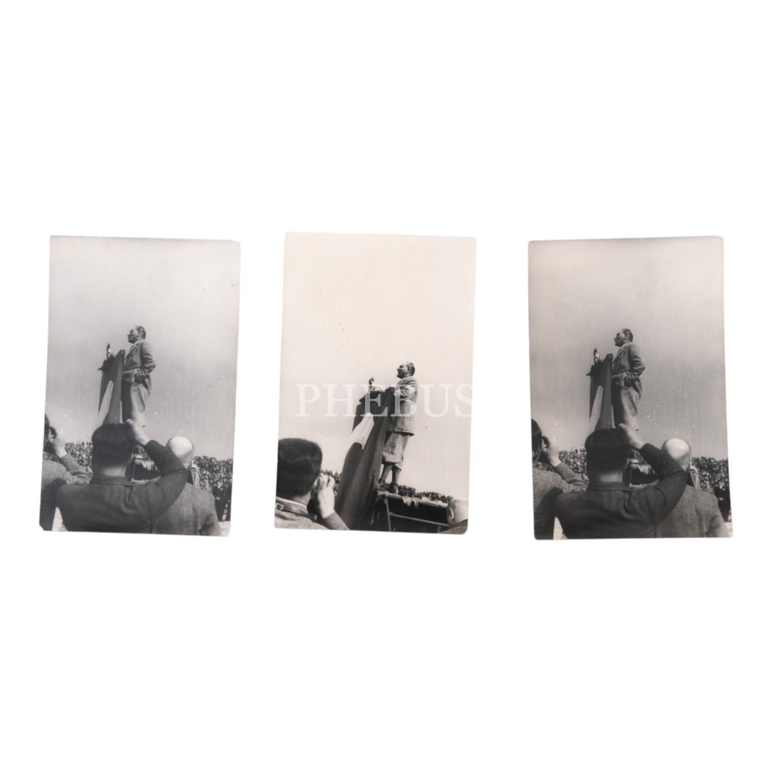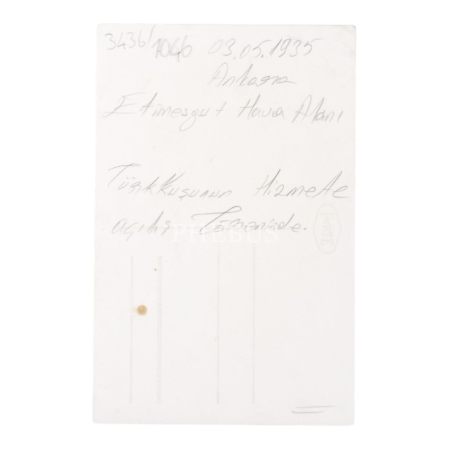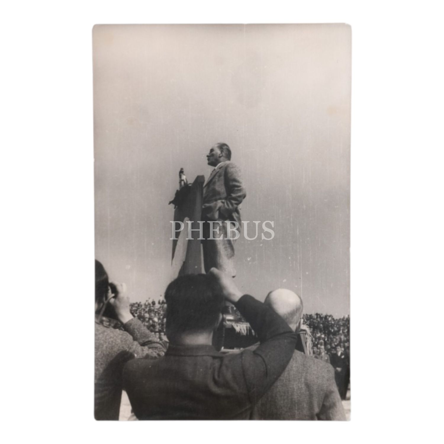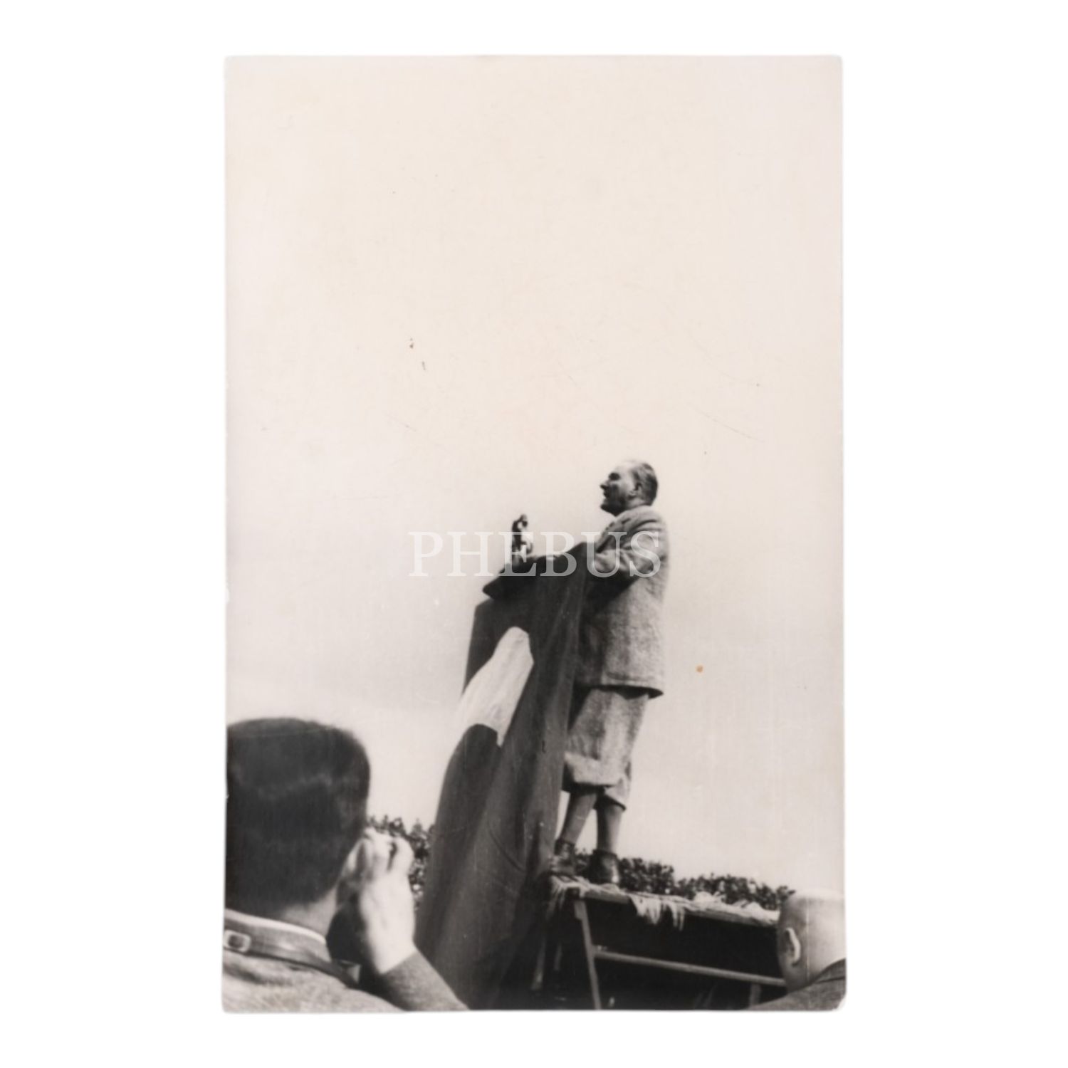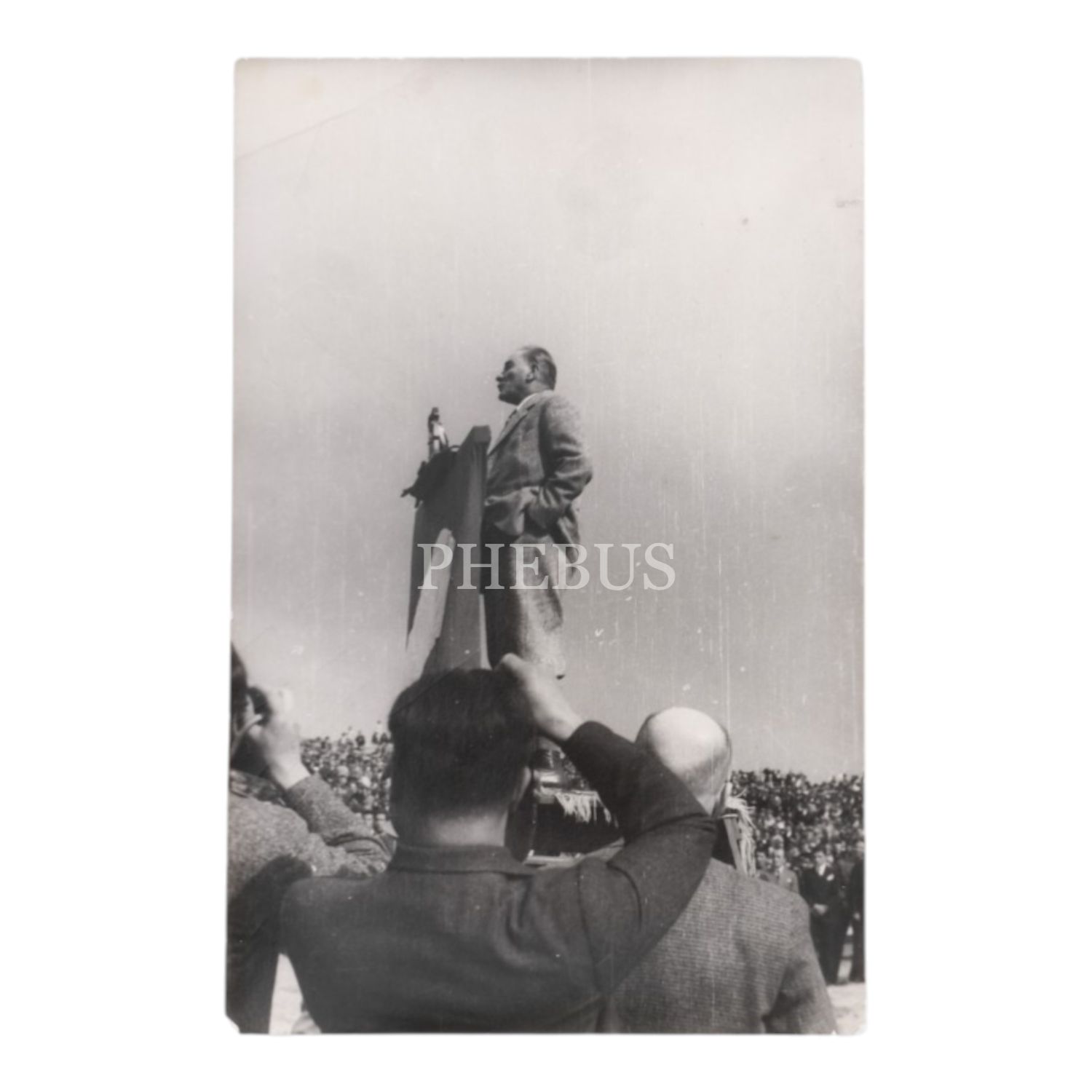 Mustafa Kemal Atatürk, Etimesgut "Türkkuşu" Tesislerinin açılışında, kürsü üzerinden konuşma yaparken, 3 Mayıs 1935, 9x14 cm boyutunda üç adet fotoğraf...