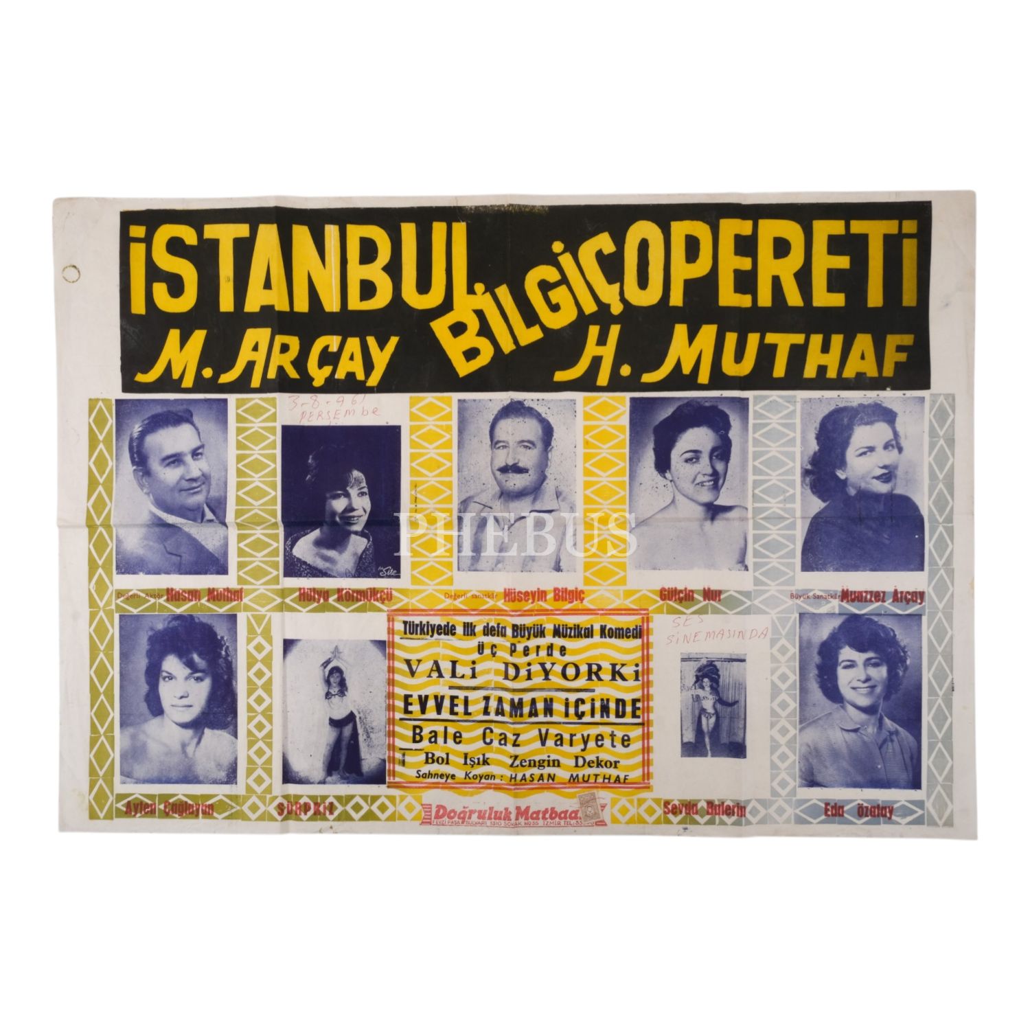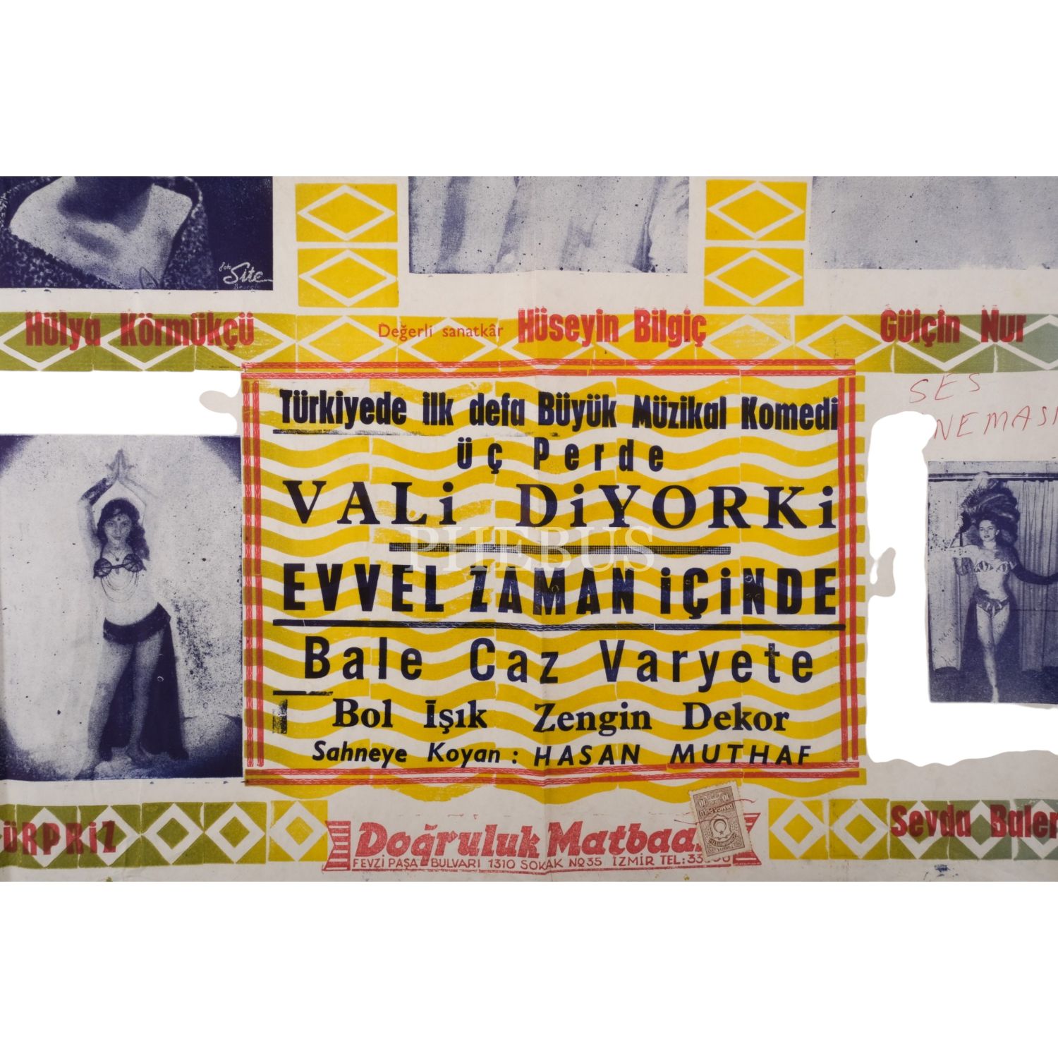 İstanbul Bilgiç Opereti (M. Arçay - H. Muthaf): "Türkiyede ilk defa Büyük Müzikal Komedi" (Üç Perde) / Vali Diyorki - Evvel Zaman İçinde - Bale / Caz / Varyete, sahneye koyan: Hasan Muthaf, Doğruluk Matbaası (İzmir), 1961, 100x70 cm...