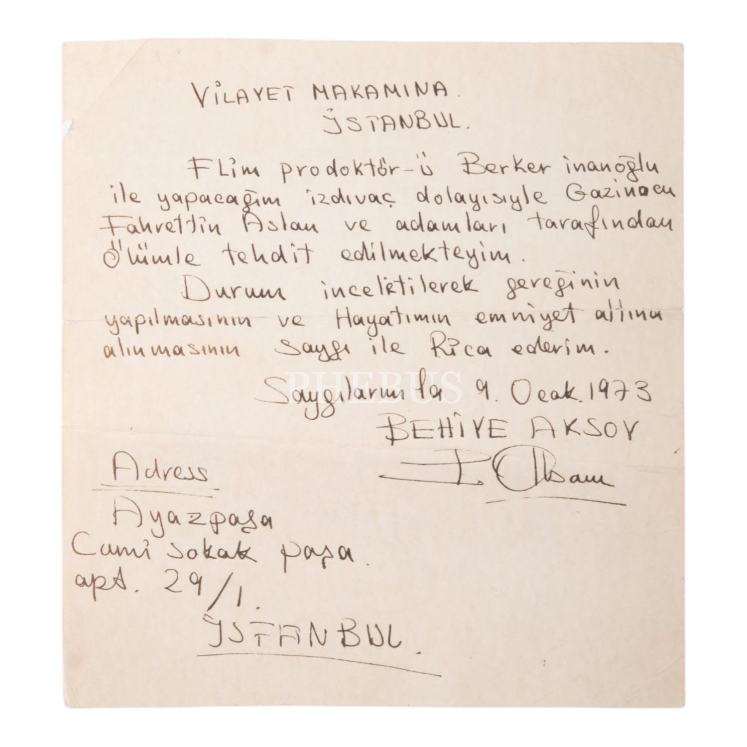 Şarkıcı Behiye Aksoy´un, "Vilayet Makamına" hitaben kaleme aldığı, film prodüktörü Berker İnanoğlu ile yapacağı evlilik dolayısıyla gazinocu Fahrettin Aslan ve adamları tarafından tehdit edildiğini bildirerek gereğinin yapılmasını rica ettiği el yazısı mektubu, 9 Ocak 1973, 21x22,5 cm...