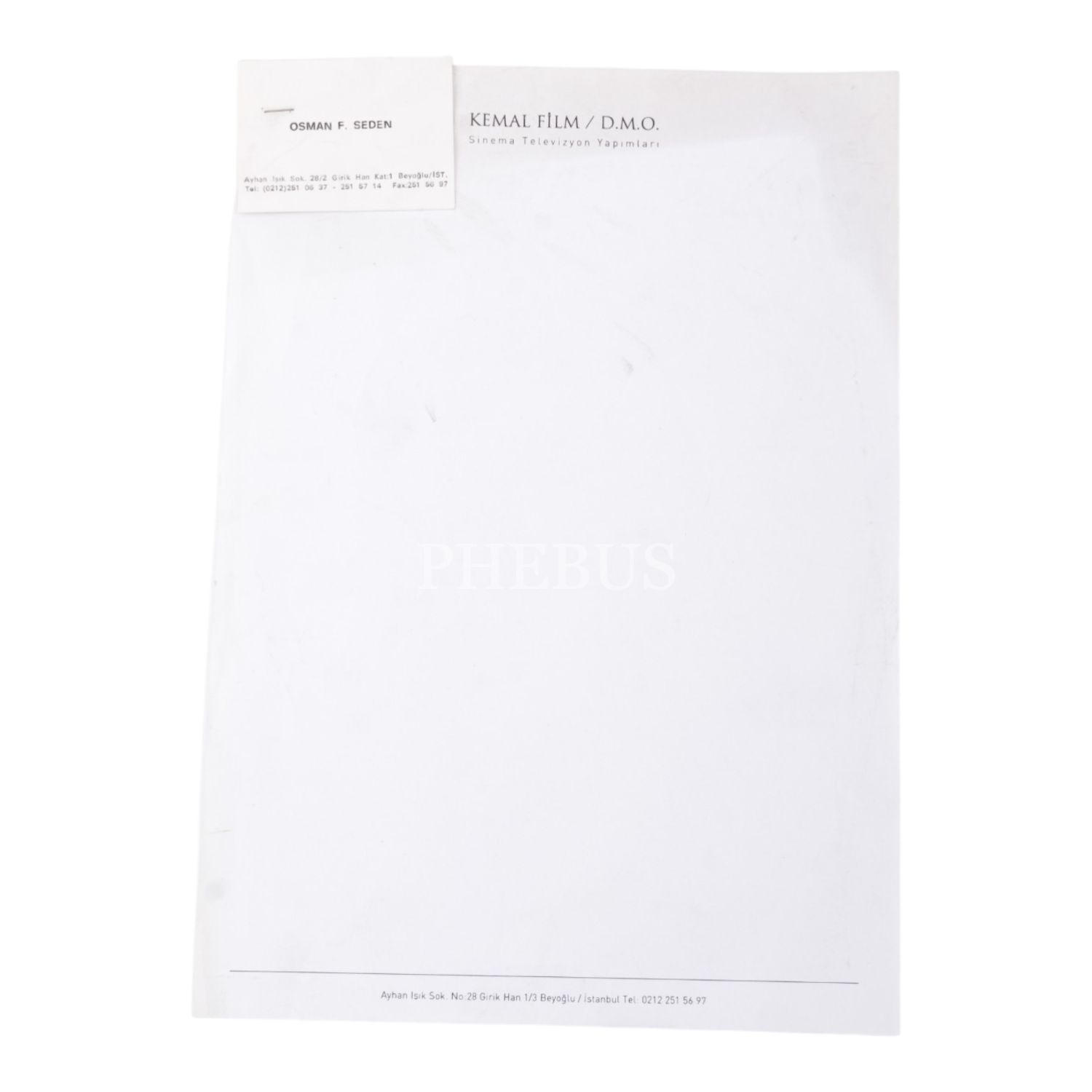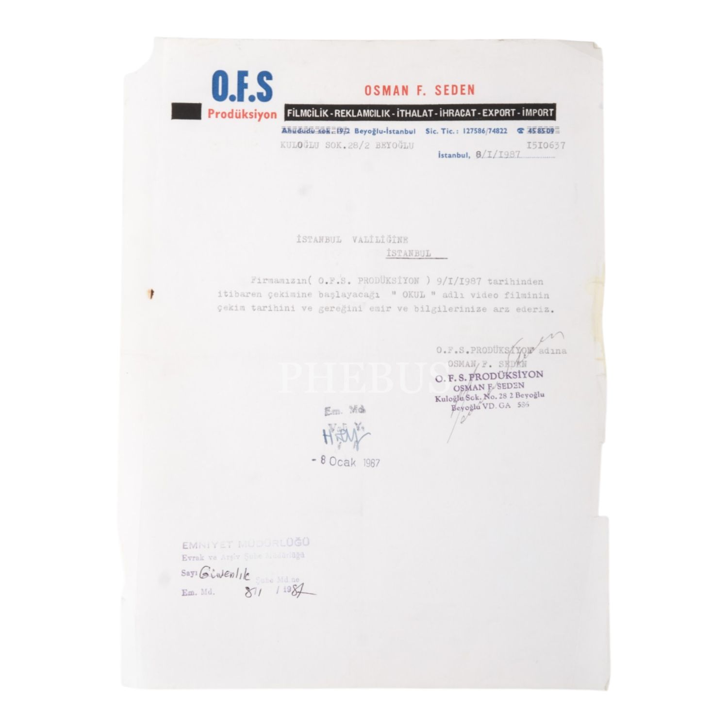 Osman F. Seden´in, İstanbul Valiliği´ne gönderdiği, firmasının (O.F.S. Prodüksiyon) 9 Ocak 1987 tarihinden itibaren çekimine başlayacağı "Okul" filminin çekim tarihini ve gereğini bildirdiği, ıslak imzalı daktilo mektubu ve kartvizitinin zımbalandığı, "Kemal Film / D.M.O." antetli boş kâğıt, 21x30 cm...