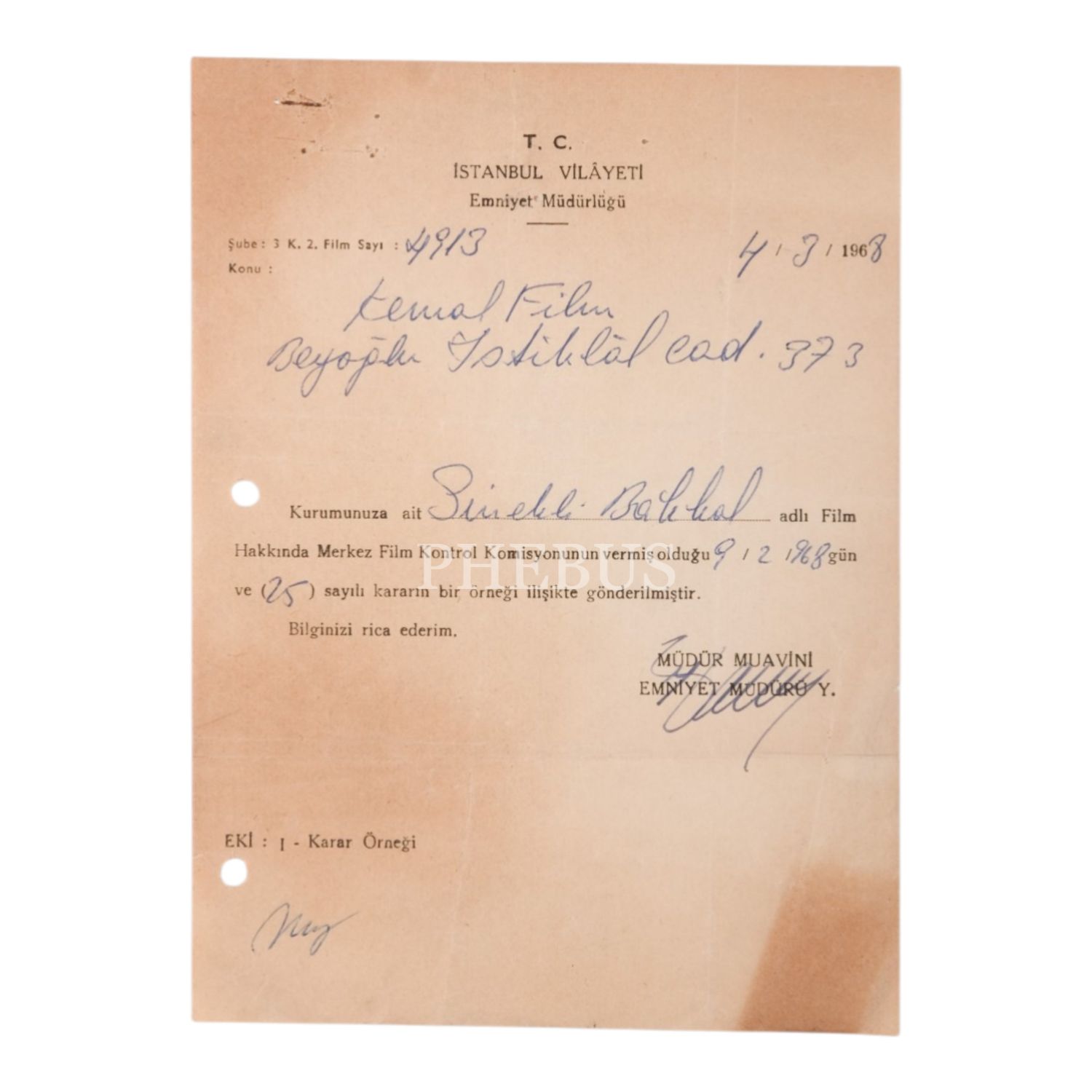 Sinekli Bakkal filmi için Merkez Film Kontrol Komisyonu´nun vermiş olduğu karar örneğinin ekte sunulduğunu bildiren, T.C. İstanbul Vilâyeti Emniyet Müdürlüğü tarafından Kemal Film´e gönderilmiş daktilo mektup, 4 Mart 1968, "Müdür Muavini Emniyet Müdür Y." ıslak imzalı, 15x20,5 cm...