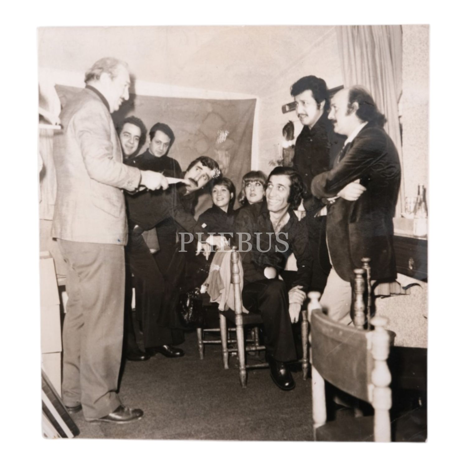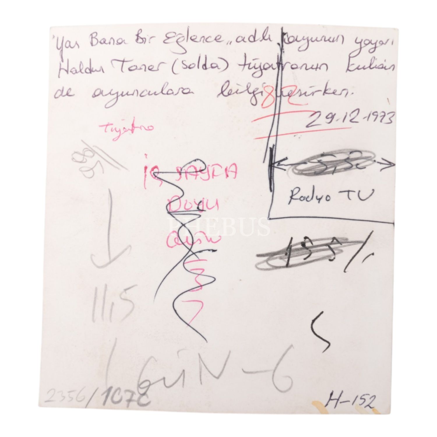 "Yar Bana Bir Eğlence" adlı oyunun yazarı Haldun Taner, tiyatronun kulisinde, aralarında Kemal Sunal, Zeki Alasya ve Metin Akpınar´ın da yer aldığı oyunculara bilgi verirken çekilmiş bir fotoğraf, 1973, 11x12 cm...