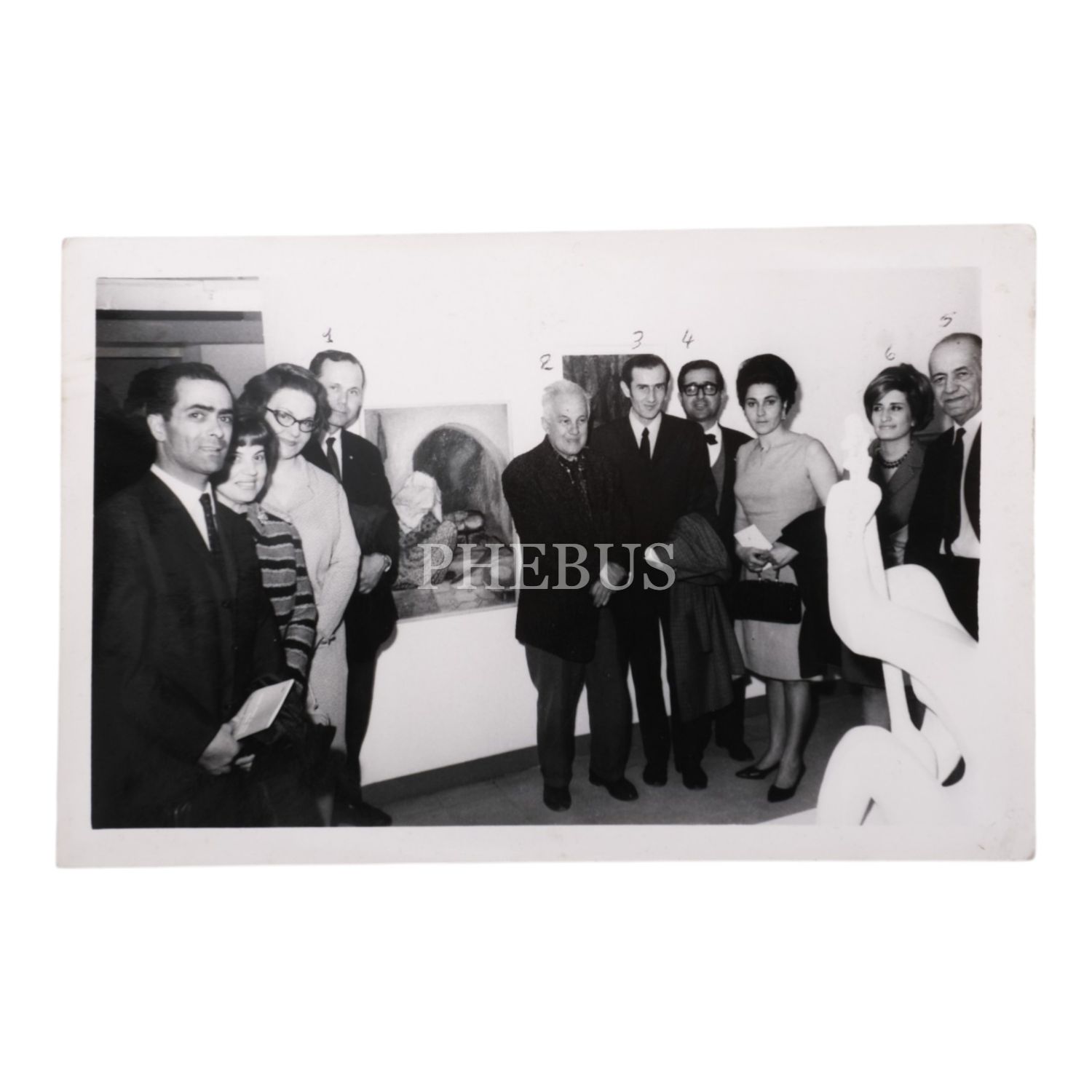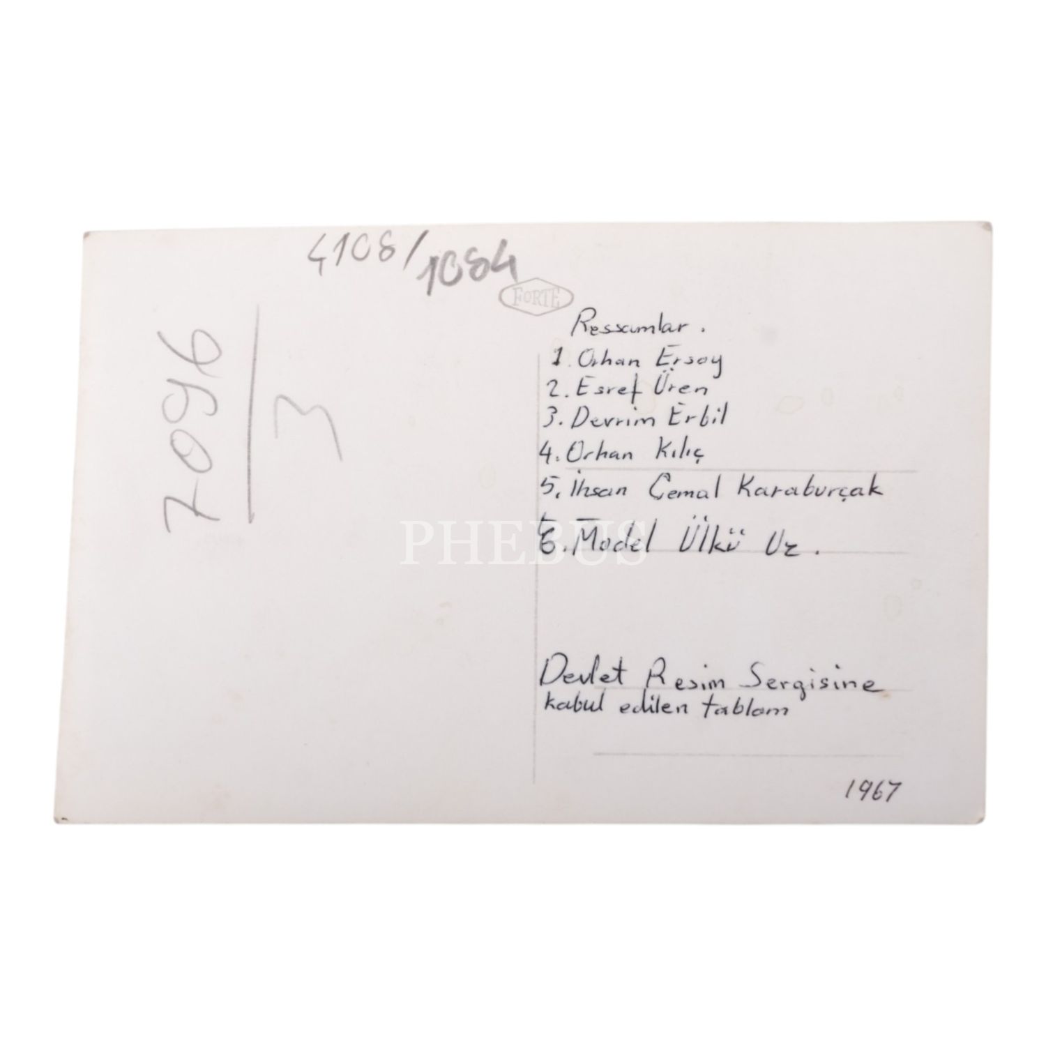 Ünlü ressamlarımız Devrim Erbil, Eşref Üren, Orhan Ersoy, Orhan Kılıç ve İhsan Cemal Karaburçak; model Ülkü Uz ile birlikte, bir ressamın Devlet Resim Sergisi´ne kabul edilen tablosunun önünde, 14x9 cm...
