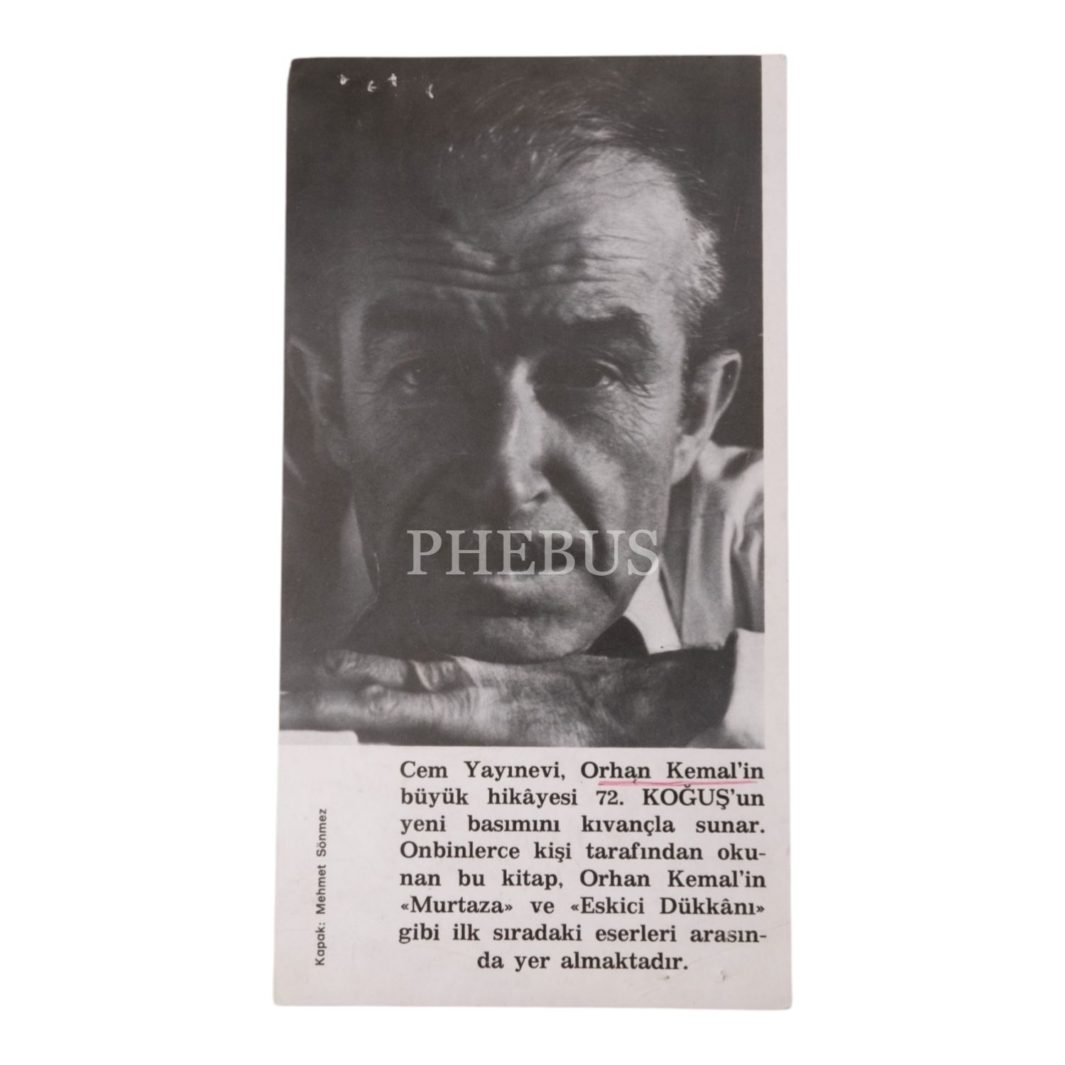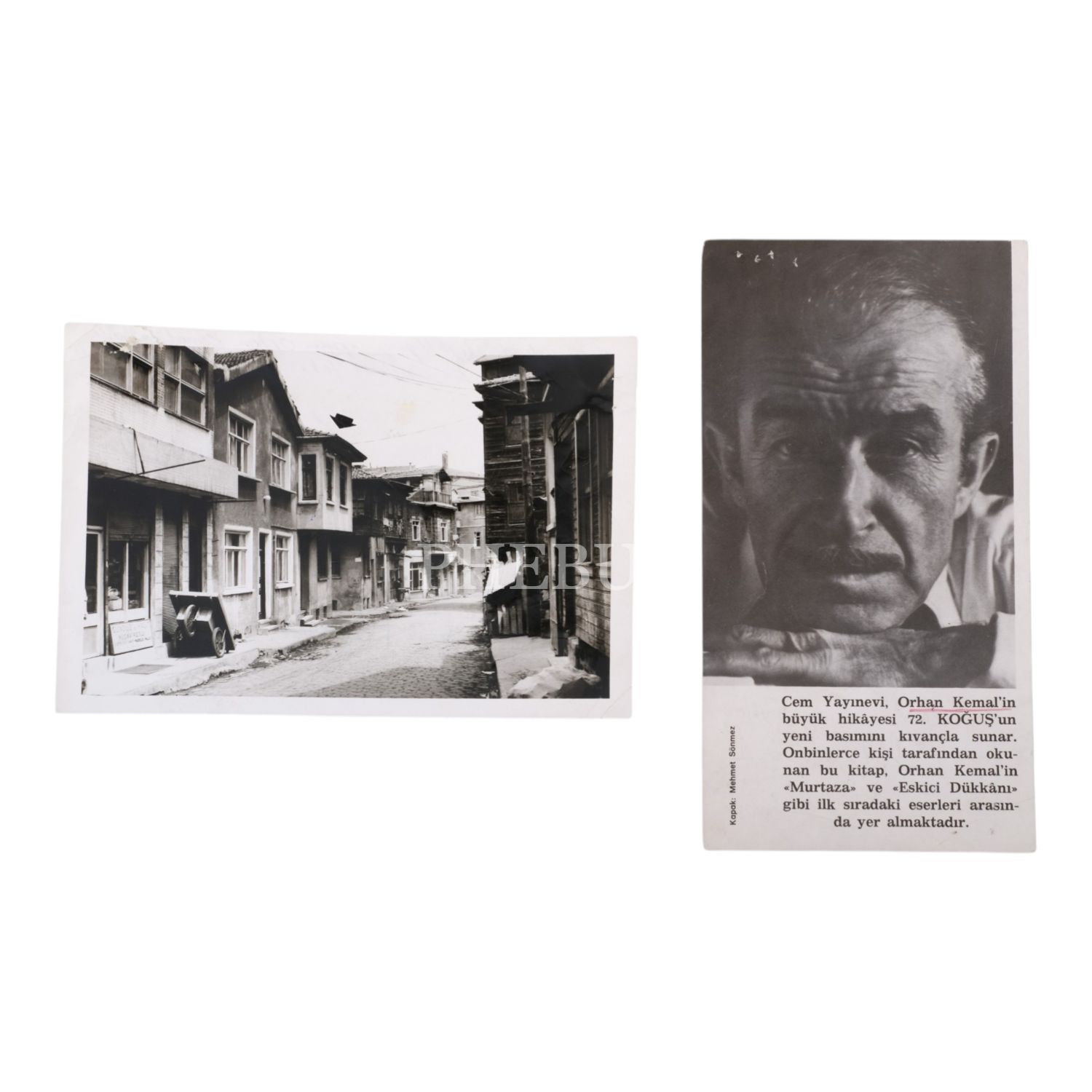 Orhan Kemal´in yaşadığı evin bulunduğu ve vefatının ardından adının verileceği sokağın fotoğrafı ile 72. Koğuş kitabının yeni basımının duyurulduğu bir ilanın fotoğrafı, 18x12 cm - 10x19 cm...