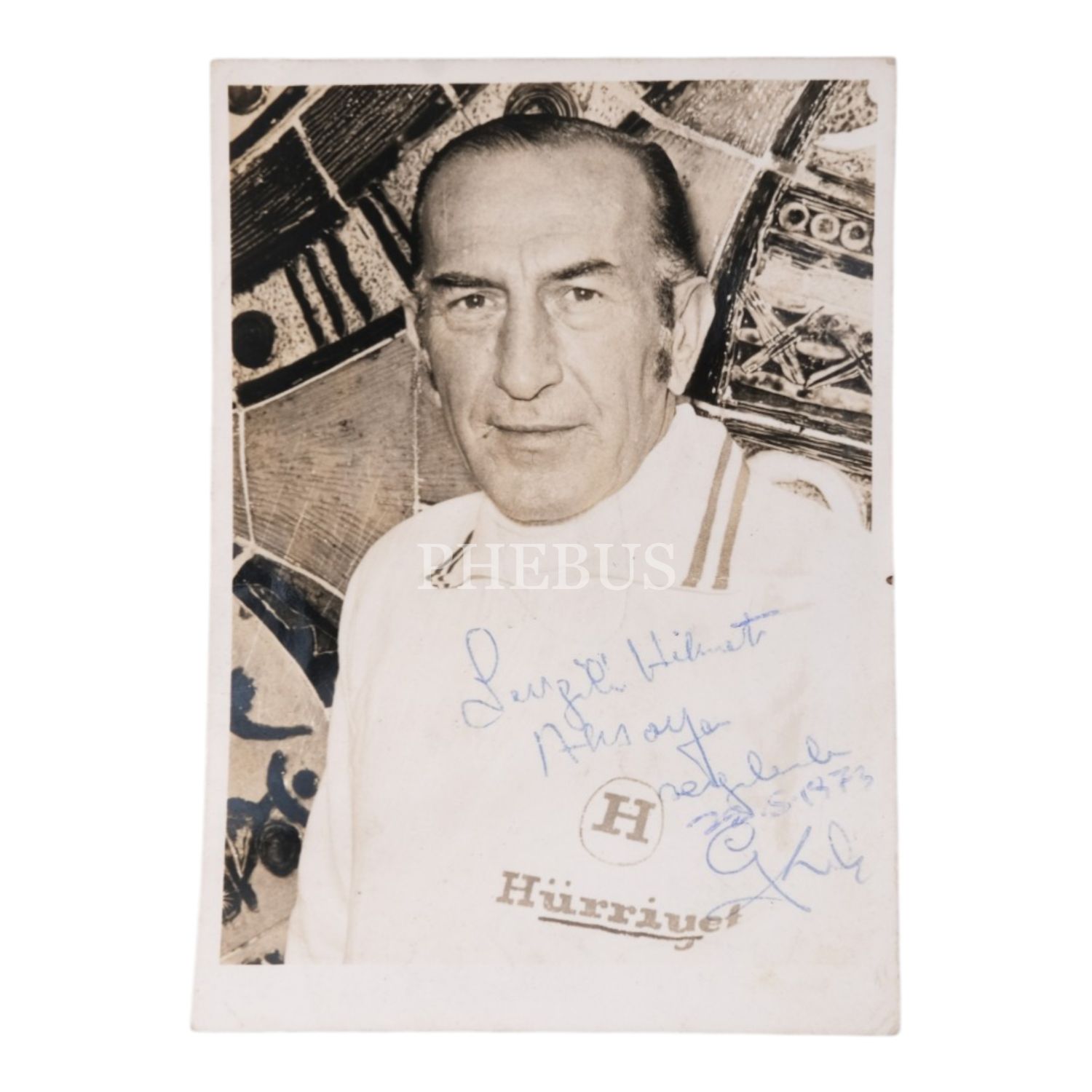 Bir sanatçının ithaflı ve imzalı portre fotoğrafı, 1973, 8,5x12 cm...