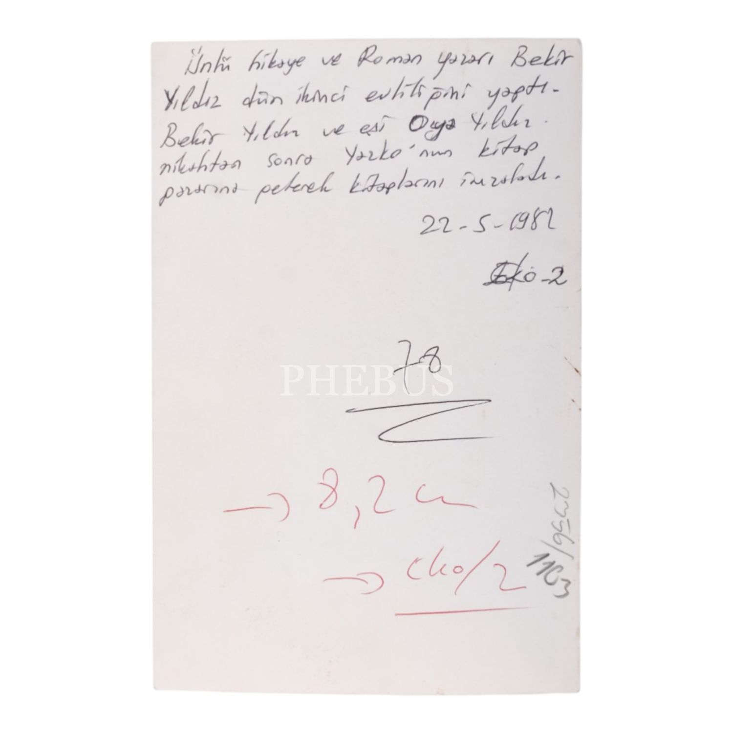 Bekir Yıldız ile eşi Oya Yıldız´ın, nikahlarının hemen akabinde geldikleri Yazko´nun kitap pazarında, kitaplarını imzalarken çekilmiş fotoğrafı, 1982, 12x18 cm...