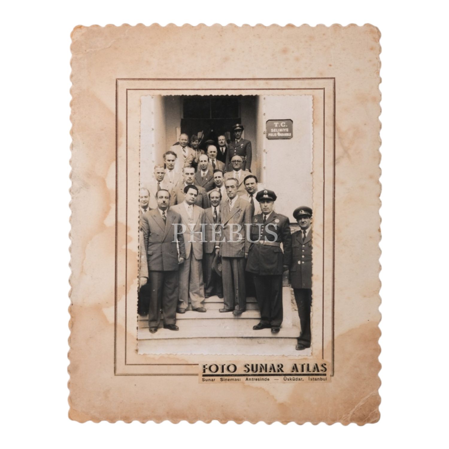 "T.C. Selimiye Polis Karakolu" girişinde çekilmiş toplu hatıra fotoğrafı, Foto Sunar Atlas (Üsküdar), fotoğraf 11,5x17 cm, paspartu 20,5x26 cm...