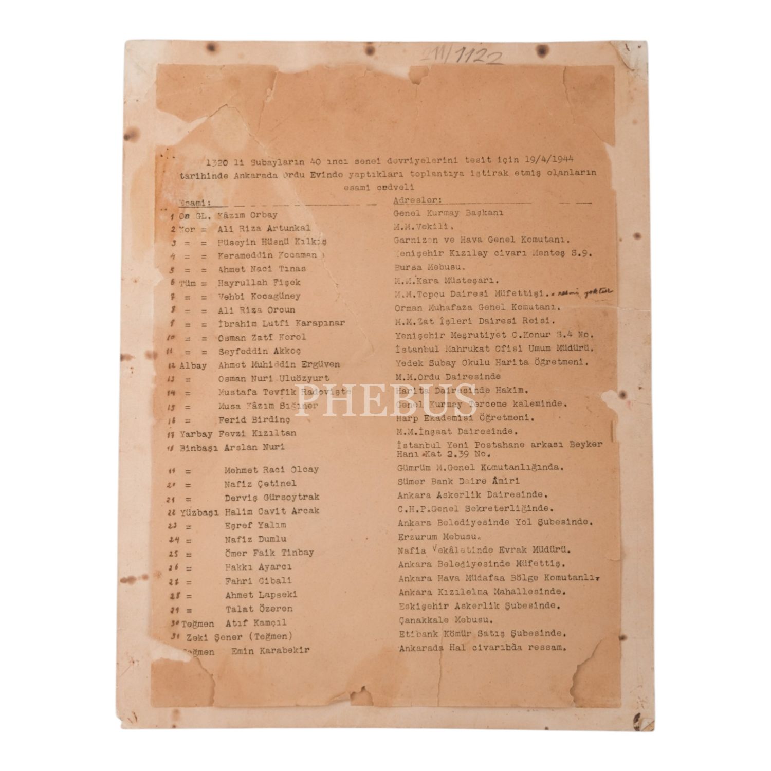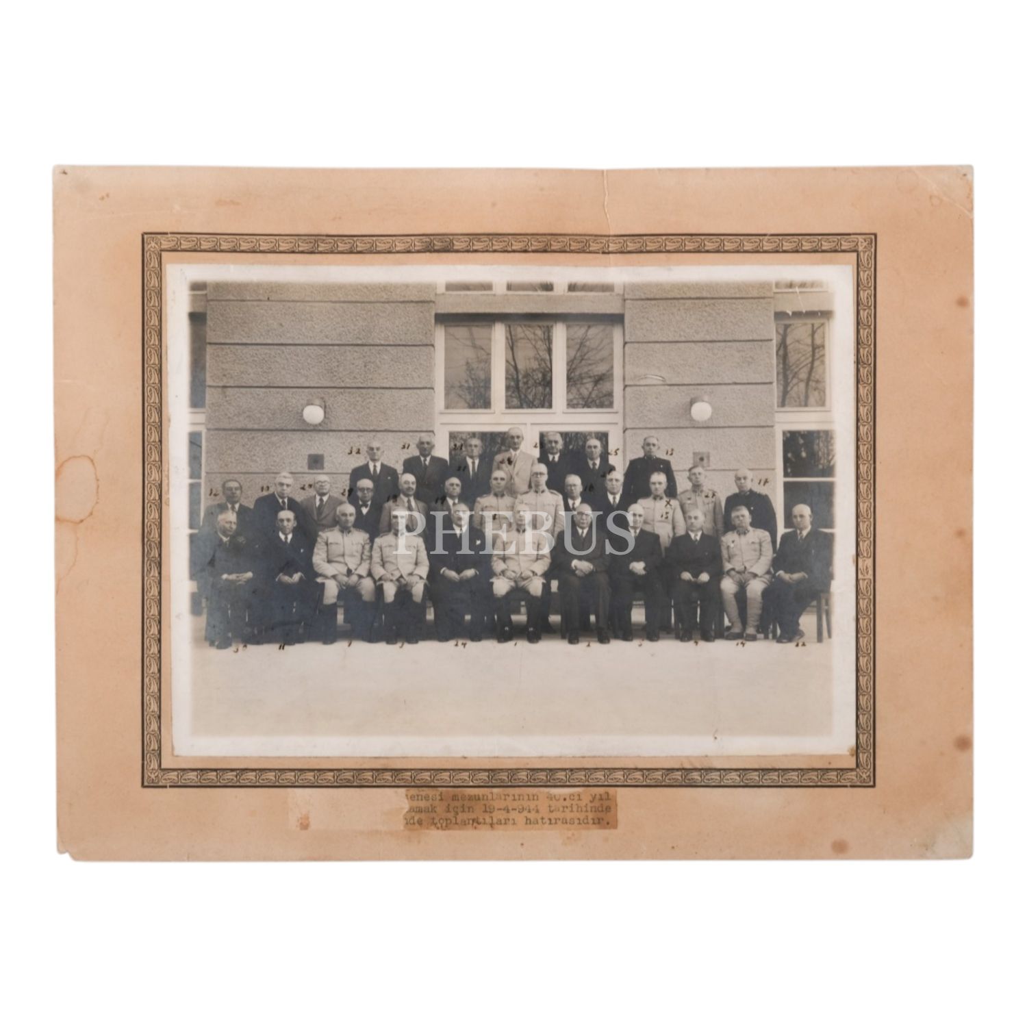 Aralarında dönemin Genelkurmay Başkanı Kazım Orbay´ın da bulunduğu 1320´li subayların, 40. yıldönümlerini kutlamak amacıyla bir araya geldikleri Ankara Orduevi´nde çekilmiş toplu hatıra fotoğrafı, 19 Nisan 1944, fotoğraf 24x17 cm, paspartu 32x24,5 cm...