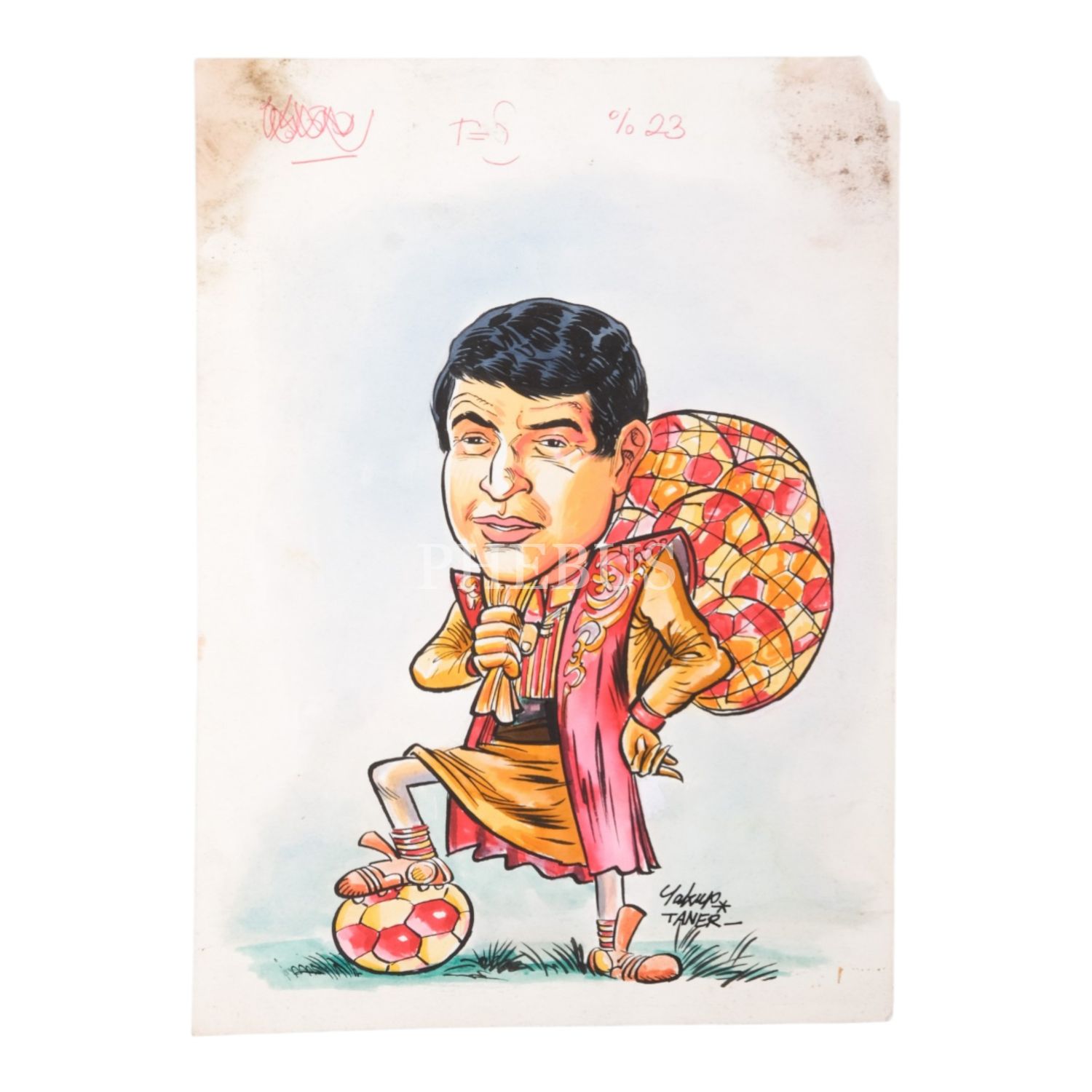 Yakup Taner imzalı, Galatasaraylı Tanju Çolak konulu karikatür, kâğıt üzerine çini mürekkebi ve sulu boya, 18x25 cm...