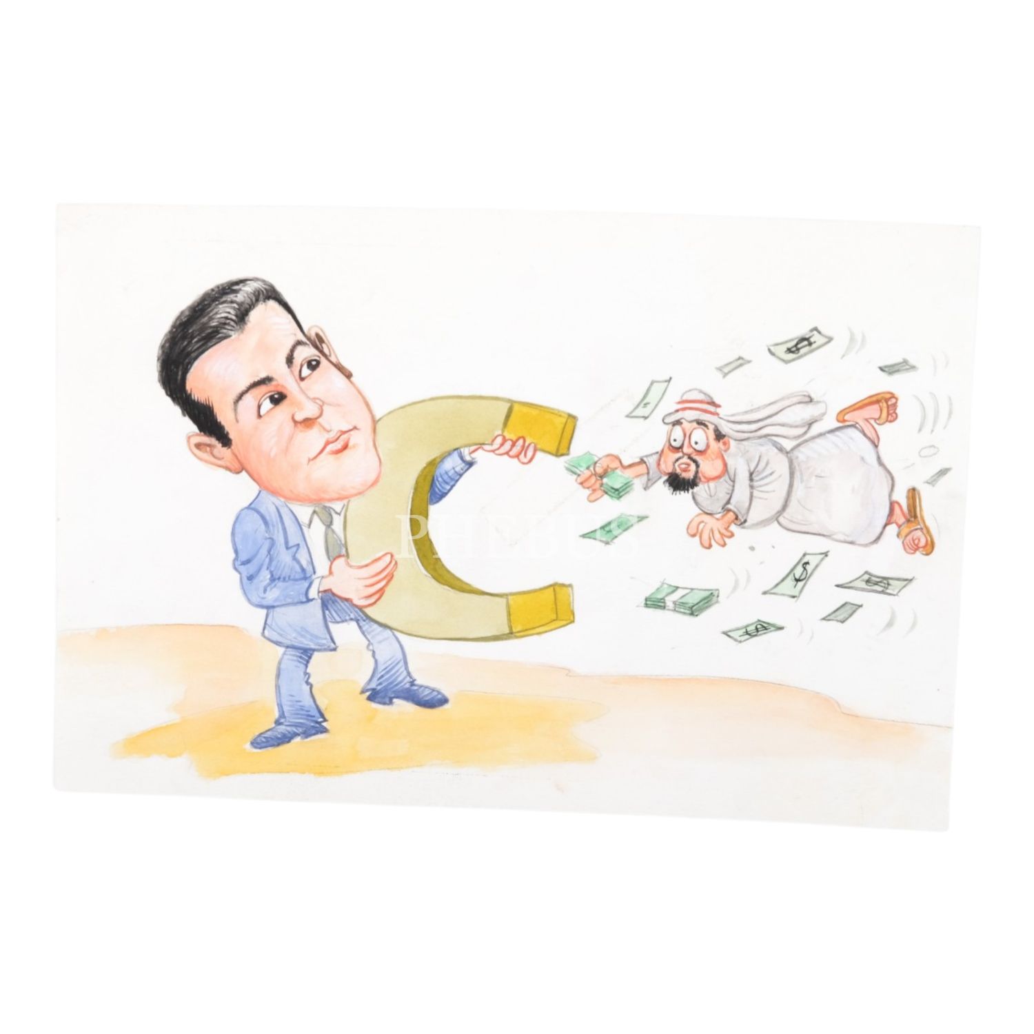 Cem Boyner konulu karikatür, imzasız, kâğıt üzerine sulu boya, 23x15 cm...