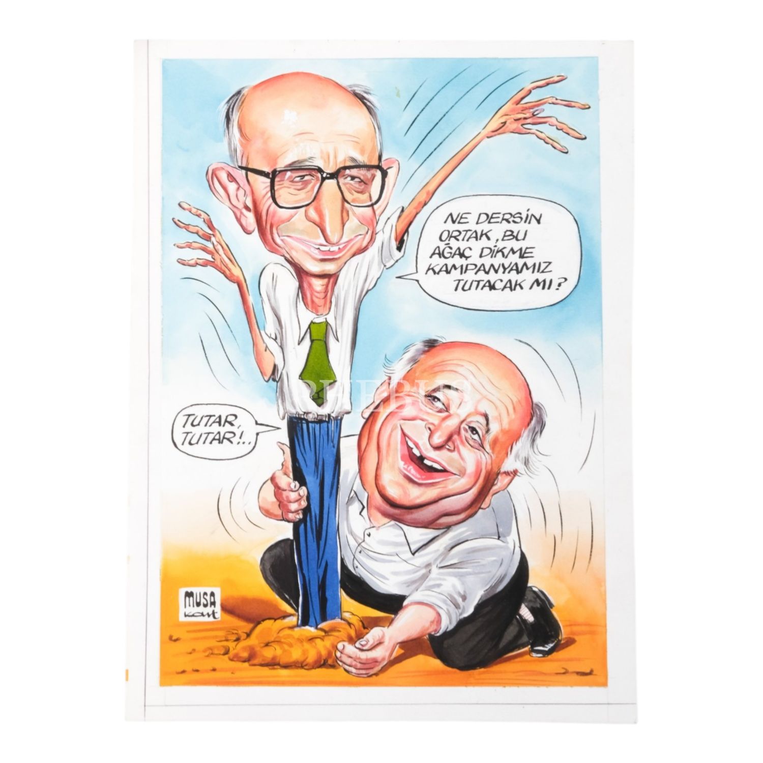 Musa Kart imzalı, Erdal İnönü ve Süleyman Demirel konulu karikatür, kâğıt üzerine çini mürekkebi ve sulu boya, 20x26,5 cm...