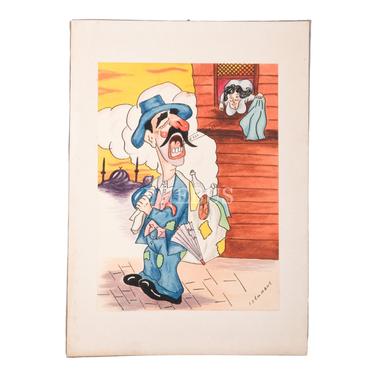 "İstanbul - 1910" konulu seriden, eskici konulu resim, kâğıt üzerine çini mürekkebi ve sulu boya, kartona yapışık, imzasız, resim 19x26 cm, karton 25x35 cm...