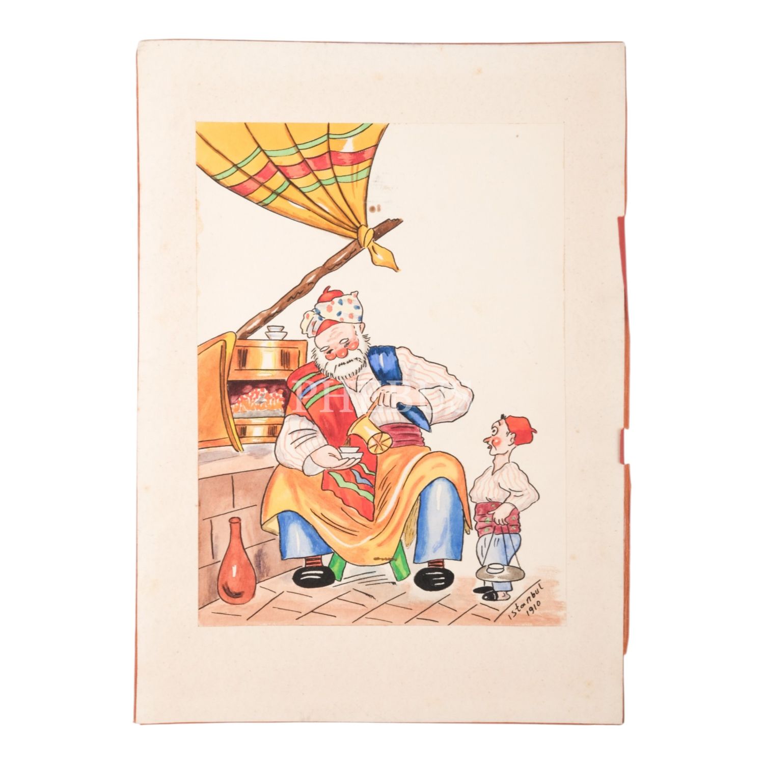 "İstanbul - 1910" konulu seriden, yaşlı kahveci ve çırağı konulu resim, kâğıt üzerine çini mürekkebi ve sulu boya, kartona yapışık, imzasız, resim 19x26 cm, karton 25x35 cm...