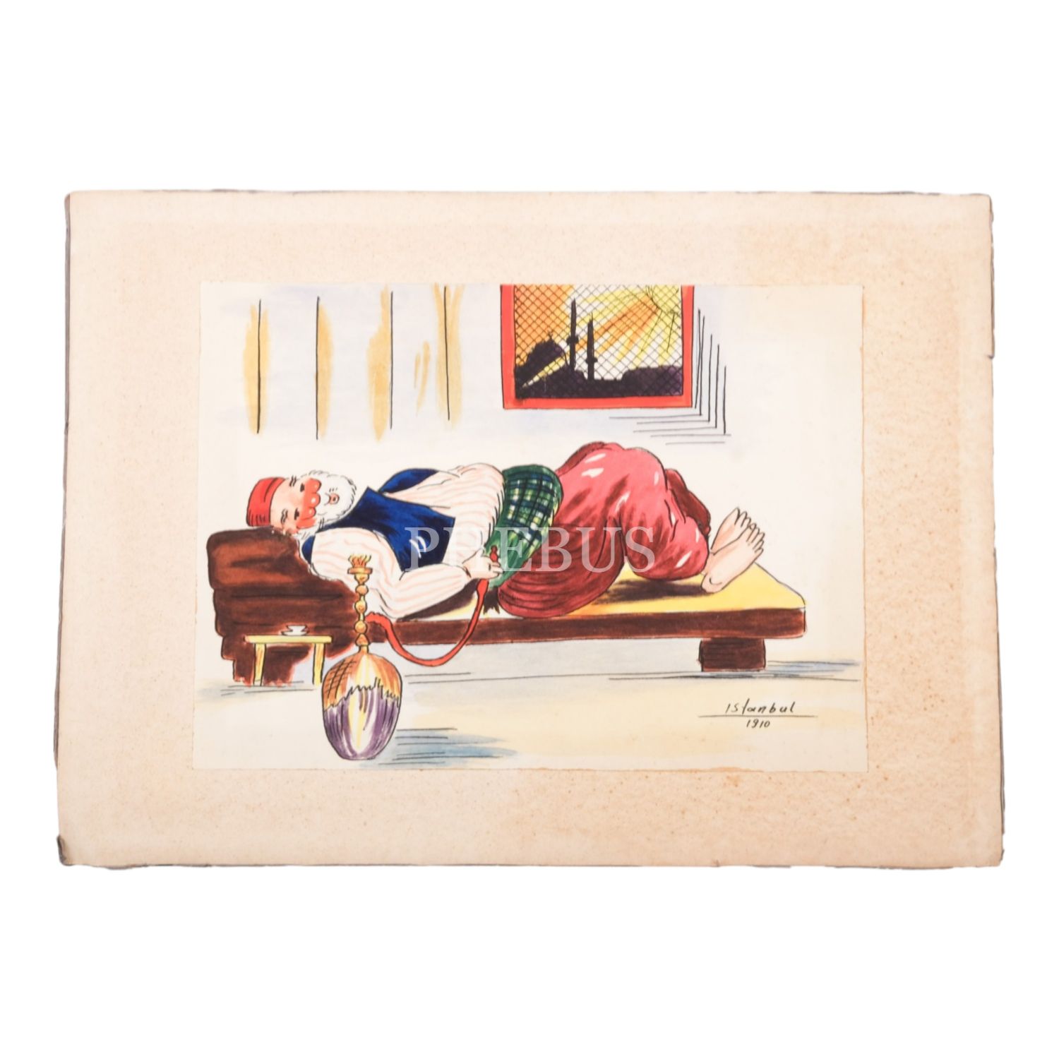 "İstanbul - 1910" konulu seriden, sedirde uzanarak nargile keyfi yapan yaşlı adam konulu resim, kâğıt üzerine çini mürekkebi ve sulu boya, kartona yapışık, imzasız, resim 26x19 cm, karton 25x35 cm...