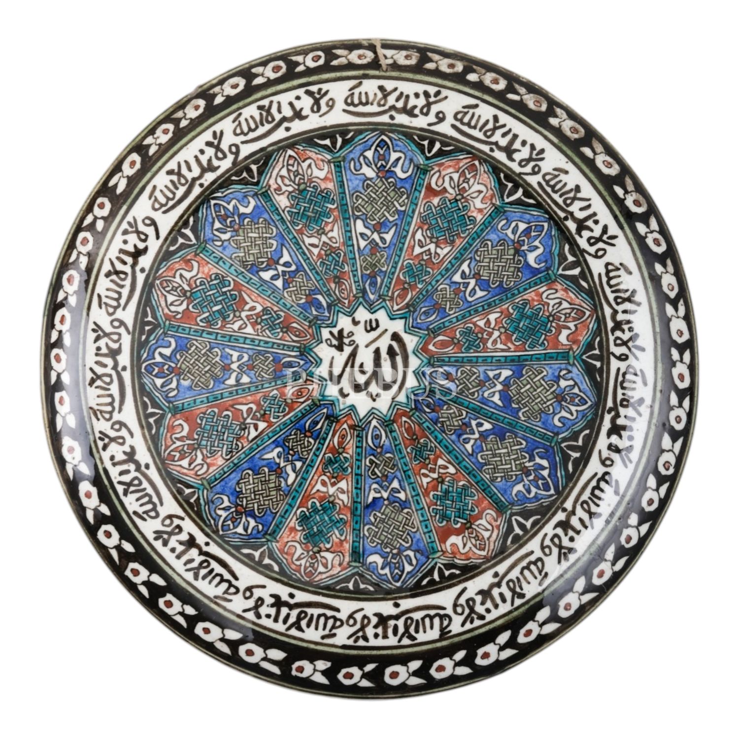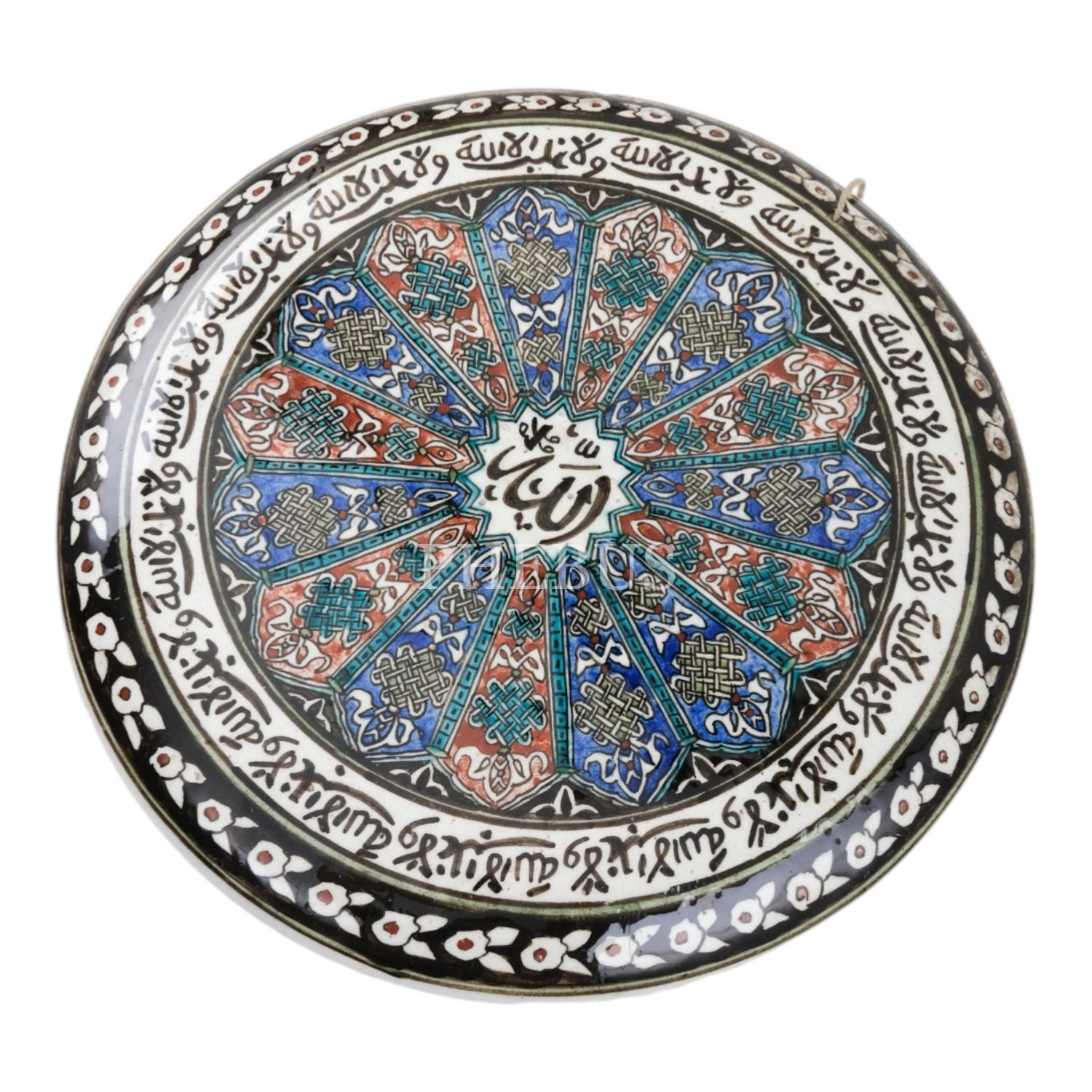 Erken Cumhuriyet döneminden, merkezinde "Allah", kenarında "Ve lâ gâlibe illallah" yazılı, geleneksel ve floral desenlerle bezeli, kalp şeklindeki porselen tabak, el boyama, çap 32 cm...