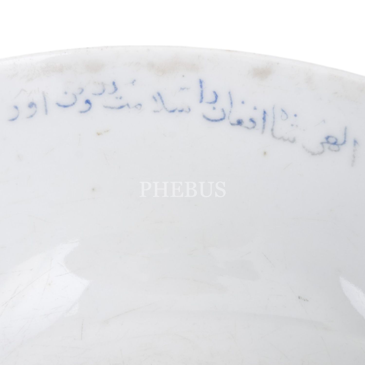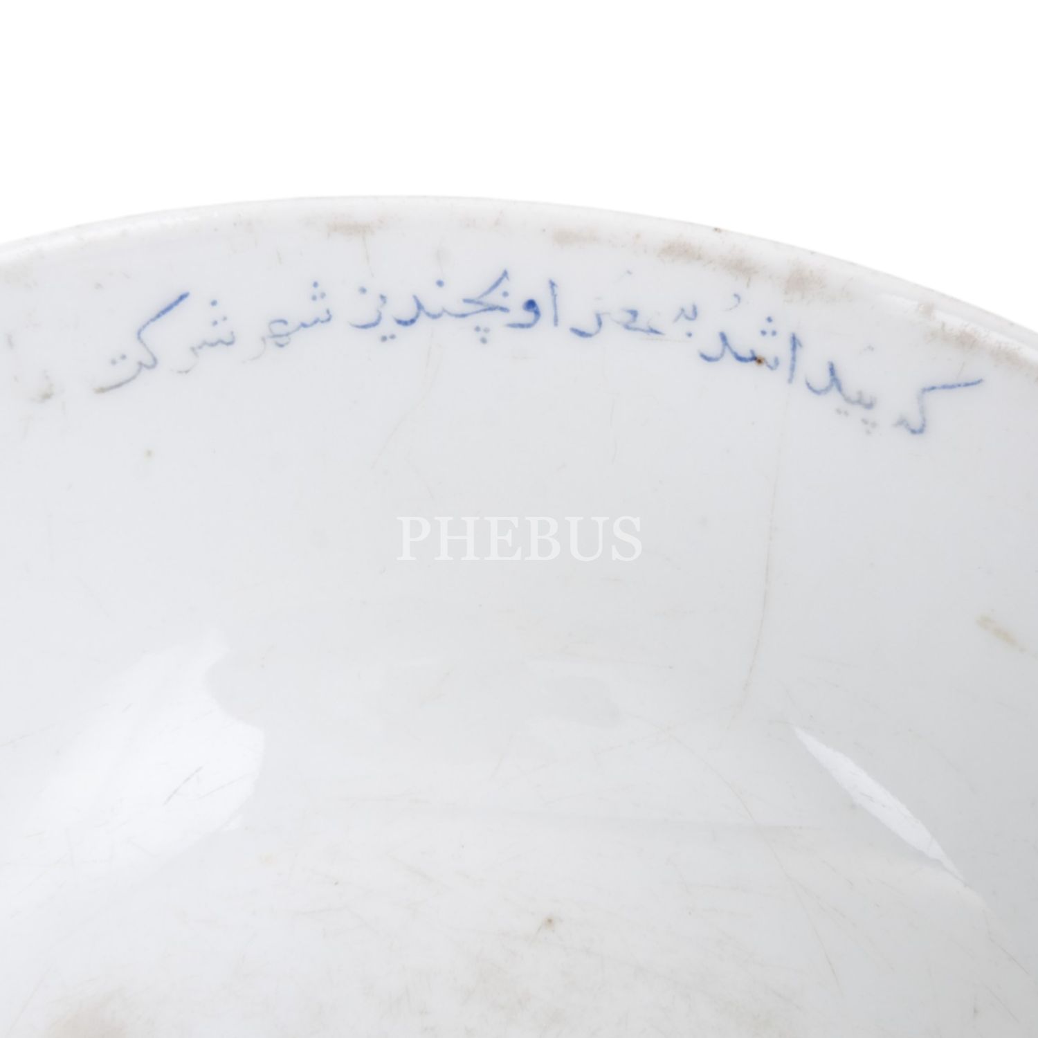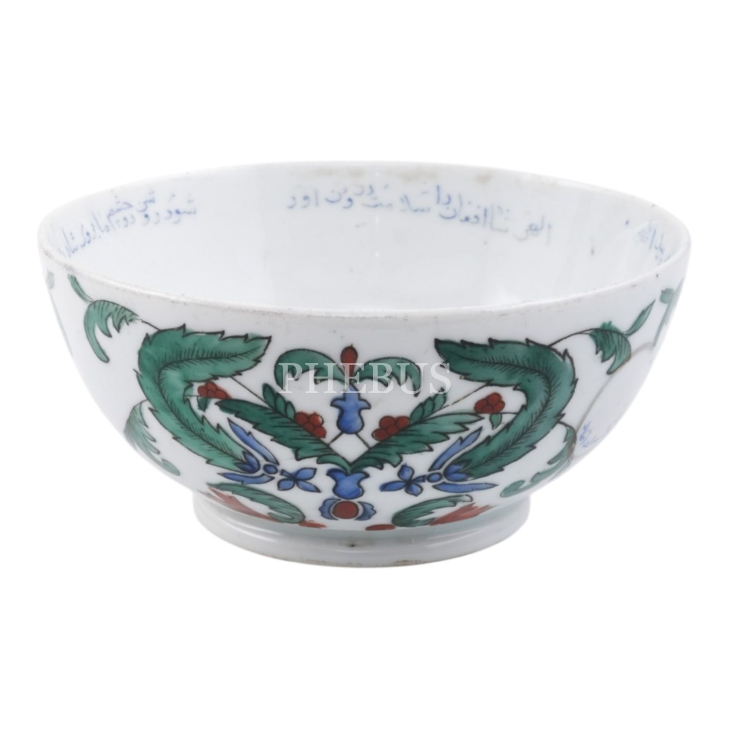 İç kenarında Frasça beyit yazılı, dış yüzeyi bitkisel motiflerle tezyin edilmiş porselen kase, 16x8 cm...