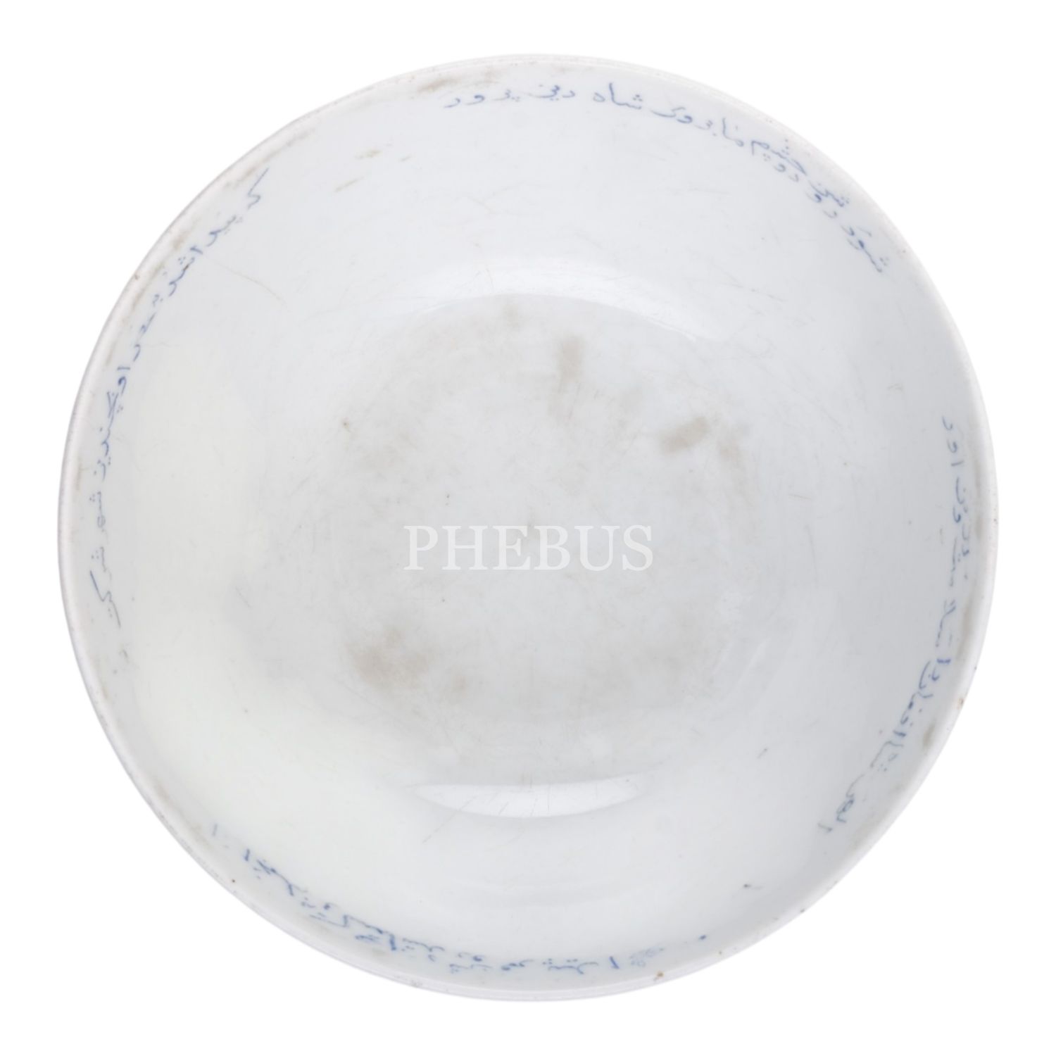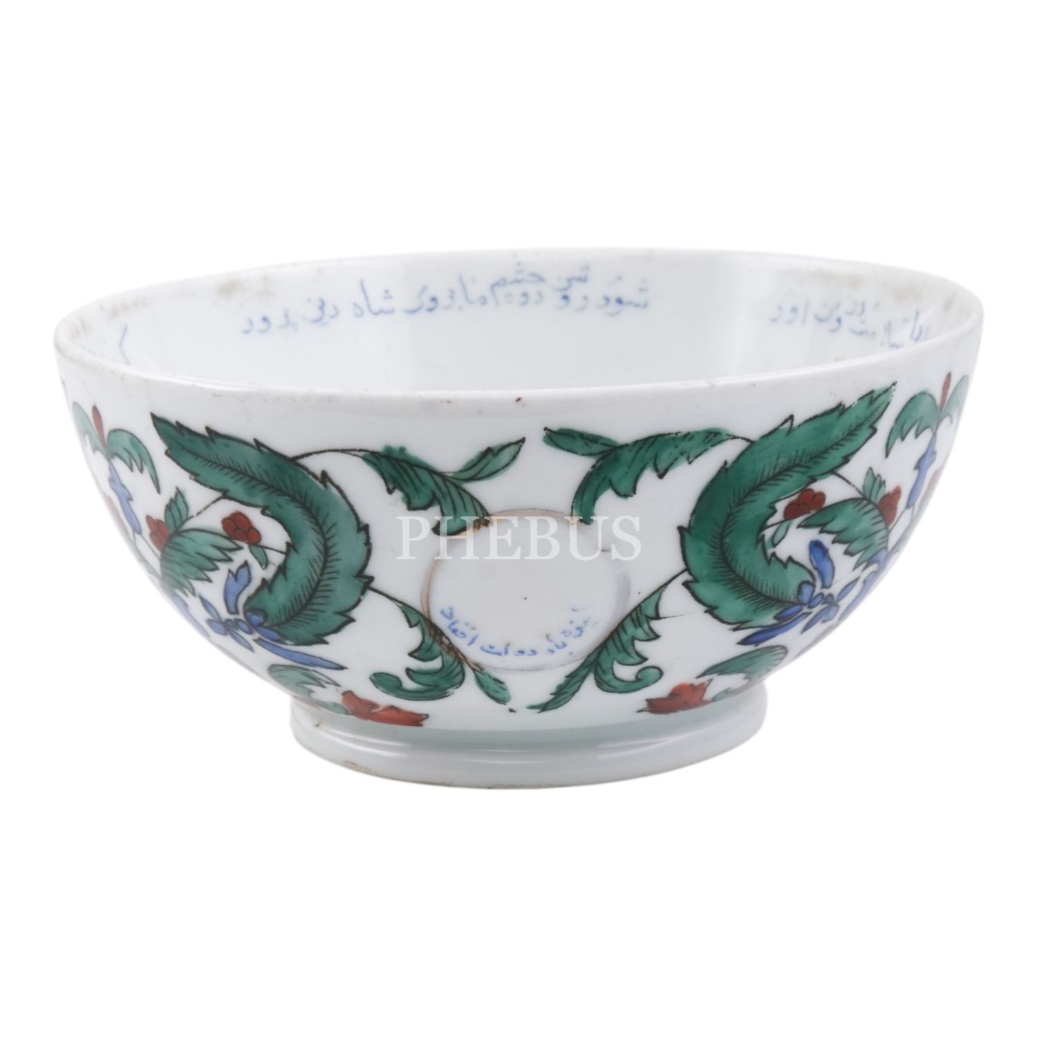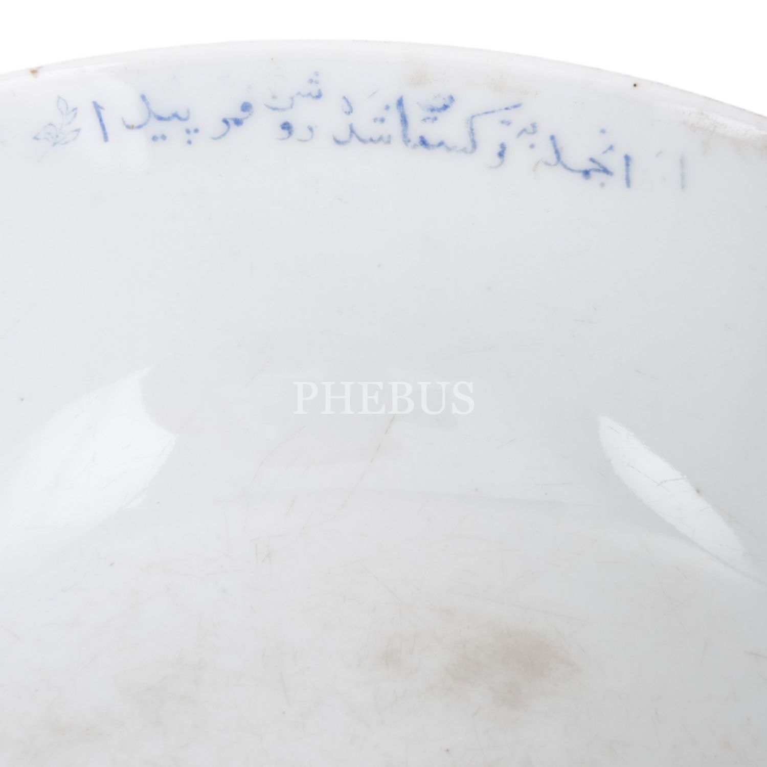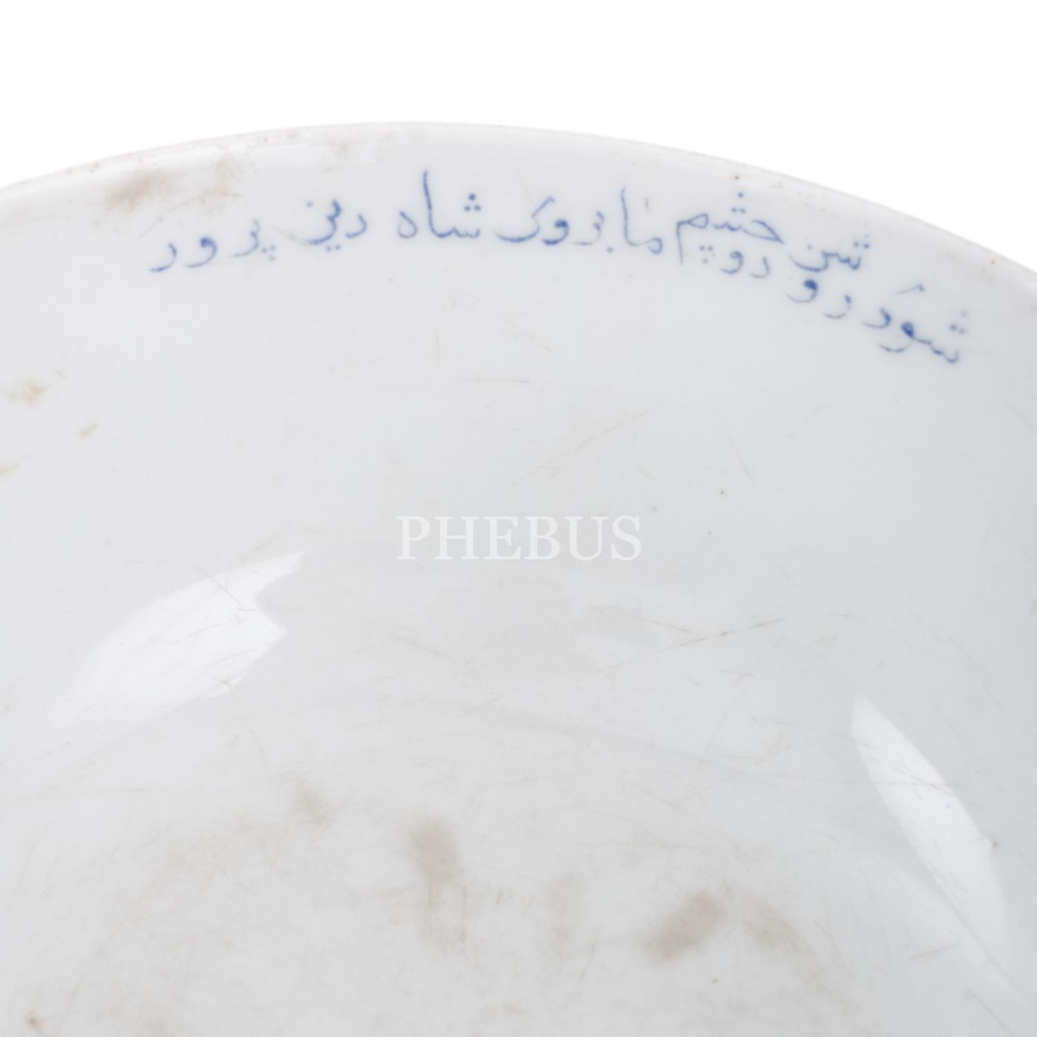 İç kenarında Frasça beyit yazılı, dış yüzeyi bitkisel motiflerle tezyin edilmiş porselen kase, 16x8 cm...
