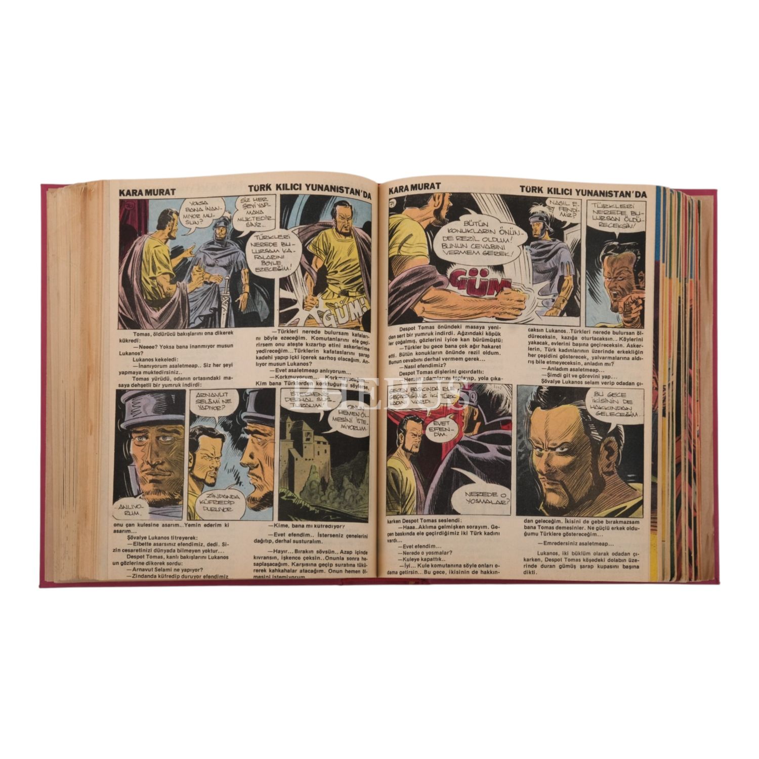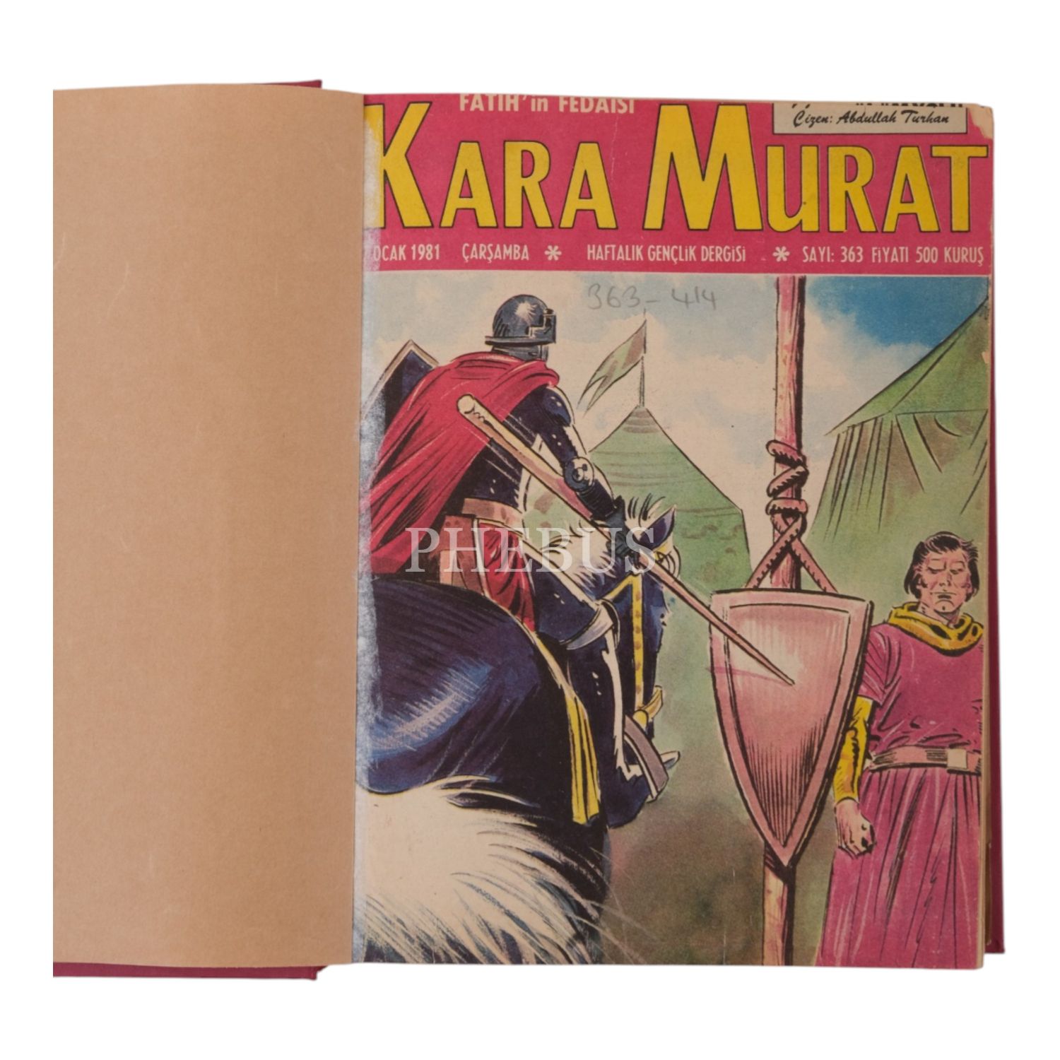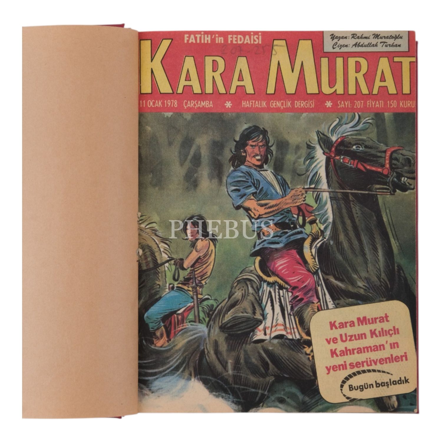 Lot içeriği: 1) "Kara Murat Cilt 6" başlıklı cilt içinde; 13 Aralık 1978 ilâ 24 Ekim 1979 tarihleri arasında yayımlanan 255-300 arası sayılar (261. sayı eksik) + Ocak 1980 tarihli 112. sayı. 2) "Kara Murat Cilt 7 1976" başlıklı cilt içinde; 22 Aralık 1976 ilâ 1 Haziran 1977 tarihleri arasında yayımlanan 152-175 arası sayılar (166. sayı sonradan ilave edilmiş). 3) "Kara Murat 207-256" başlıklı cilt içinde; 11 Ocak 1978 ilâ 20 Aralık 1978 tarihleri arasında yayımlanan 207-256 arası sayılar (229. sayı sonradan ilave edilmiş). 4) "Kara Murat 363-414" başlıklı cilt içinde; Ocak 1981 ilâ 30 Aralık 1981 tarihleri arasında yayımlanan 363-414 arası sayılar (401. ve 405. sayılar sonradan ilave edilmiş).