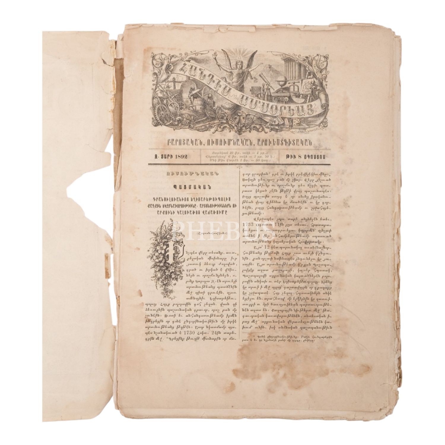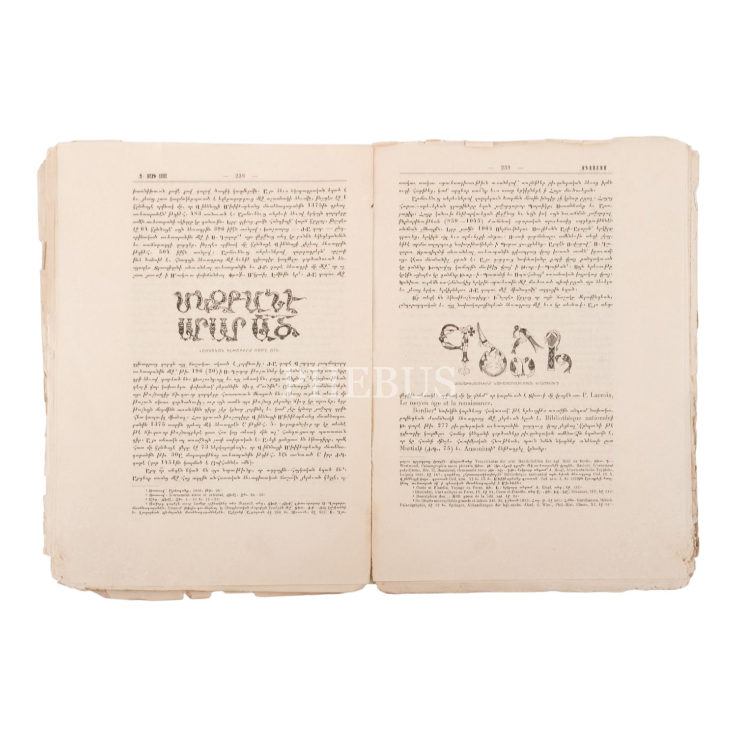 Hantes Amsorya (Aylık Mecmua), 5. sene, 1892 tarihli bir sayı, aynı derginin 1894 tarihli bir kapağı ve Hayrenik (Vatan), 1920, Boston: Hayrenik Matbaası, 3. Ek sayının ön ve arka kapağı, 24x32 cm...