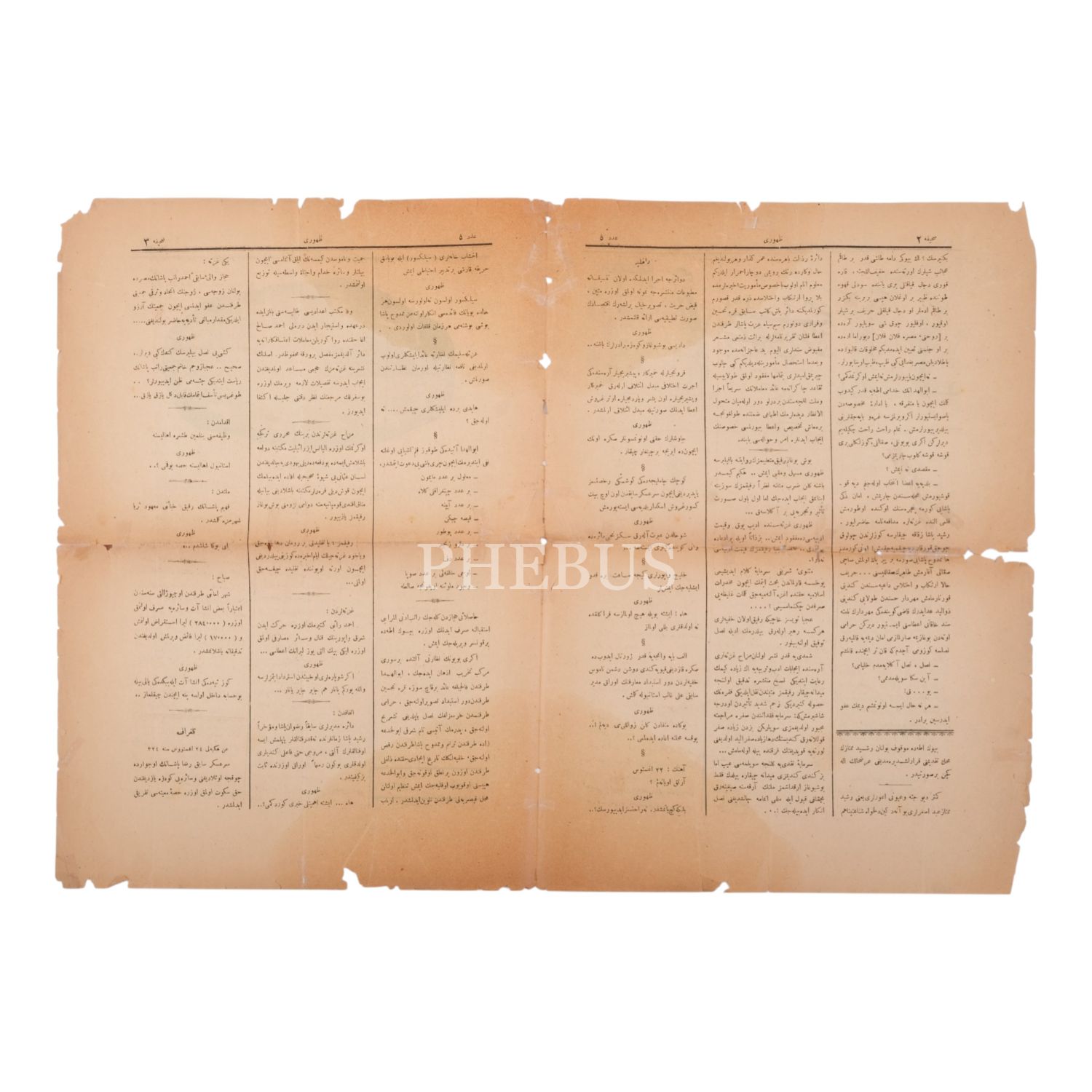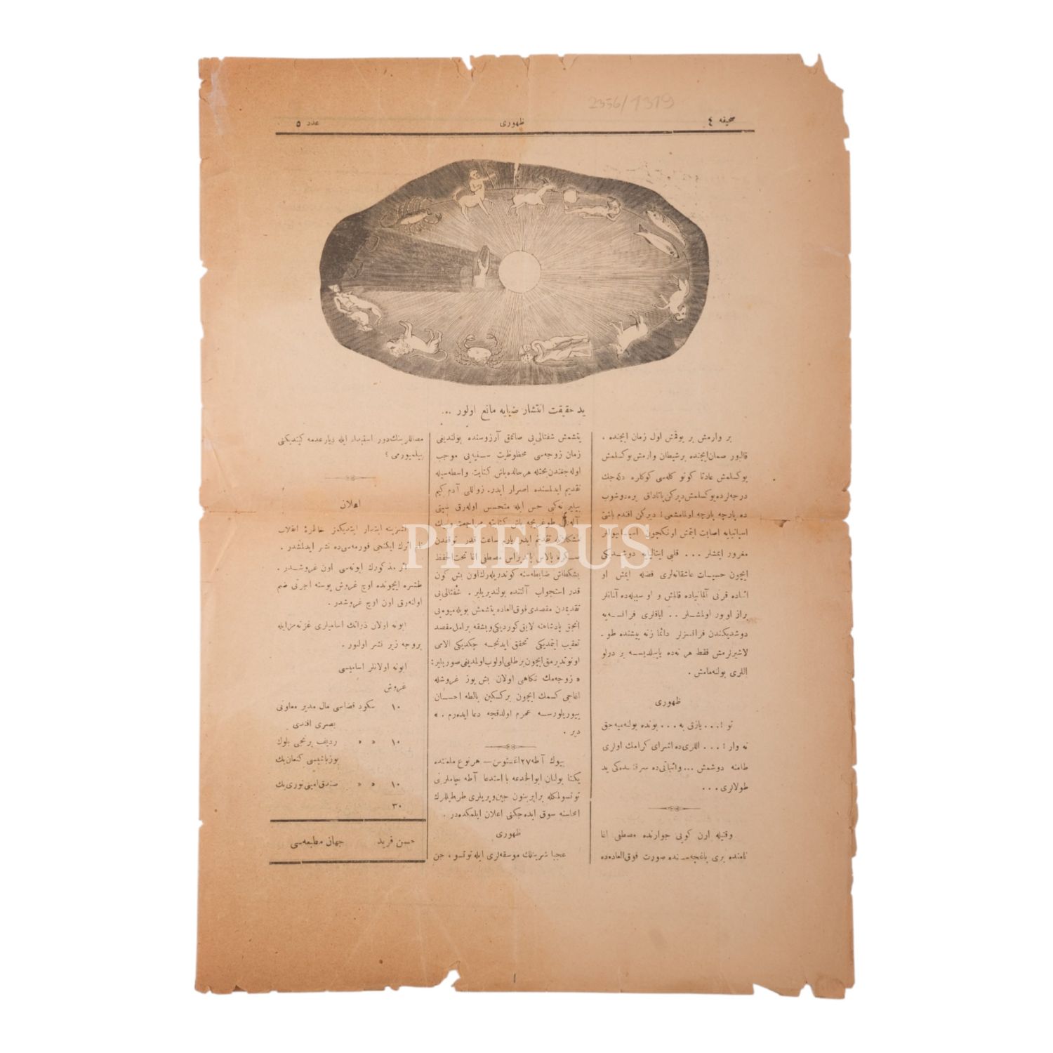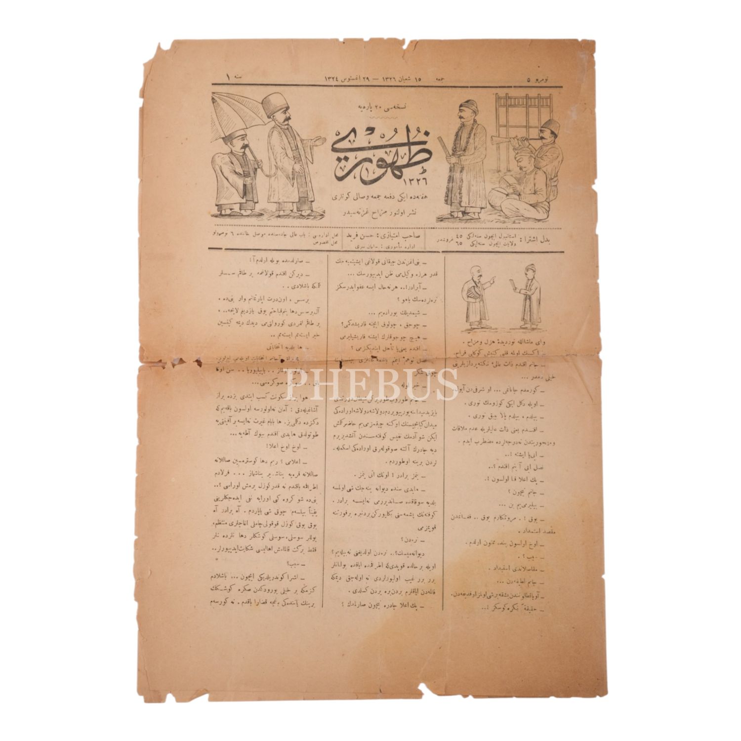 29 Ağustos 1324 tarihinde yayımlanan ZUHURİ mizah gazetesinin 5 numaralı sayısı, 4 sayfa, 29x42 cm...