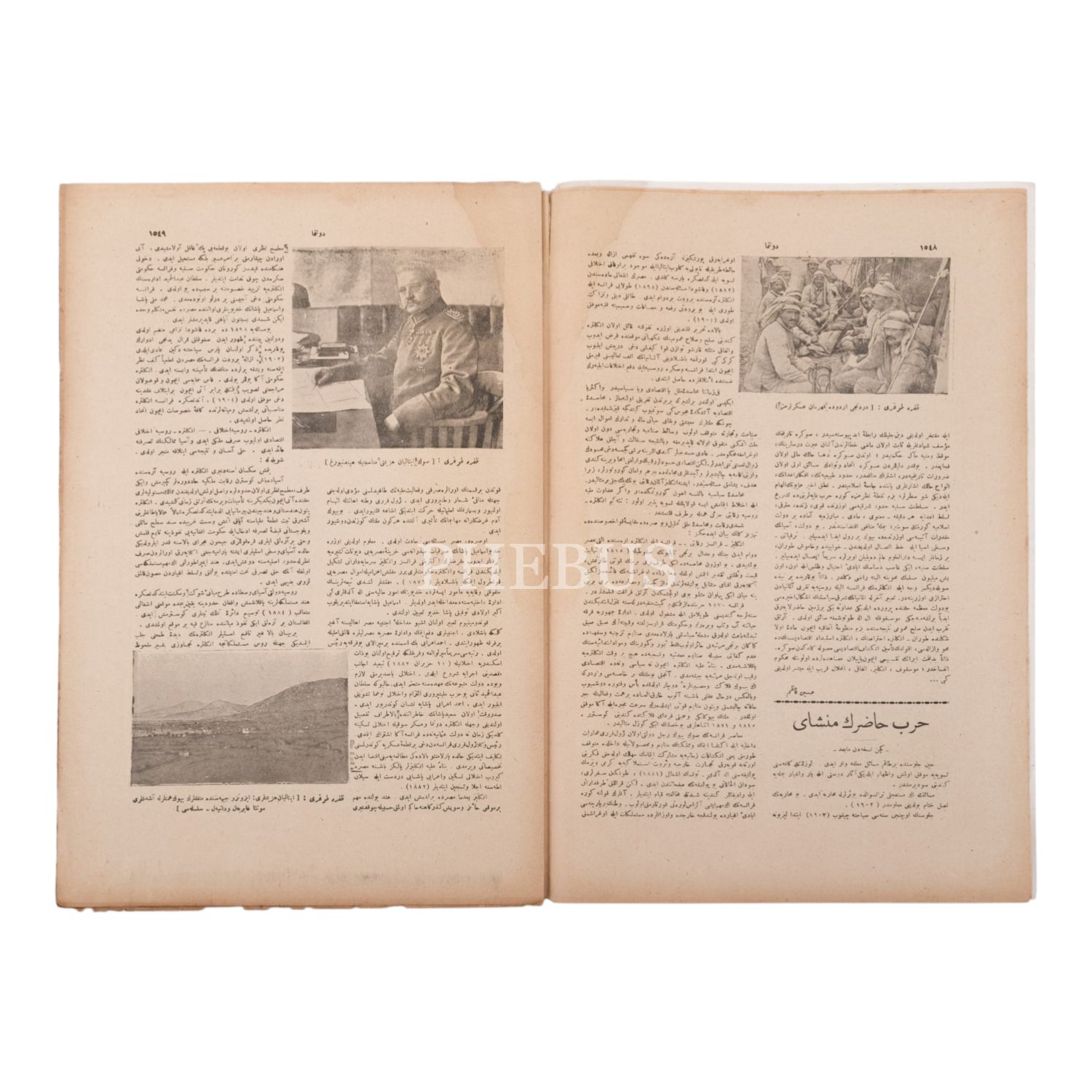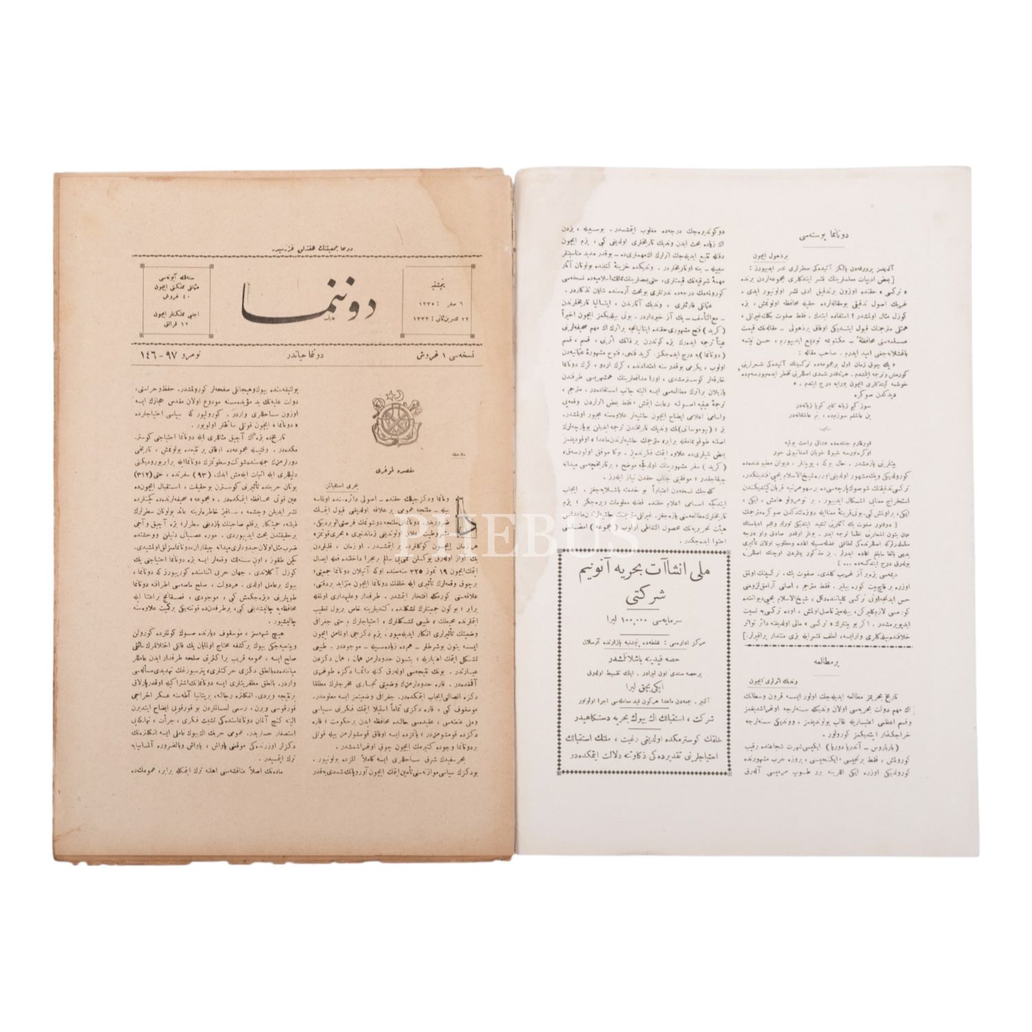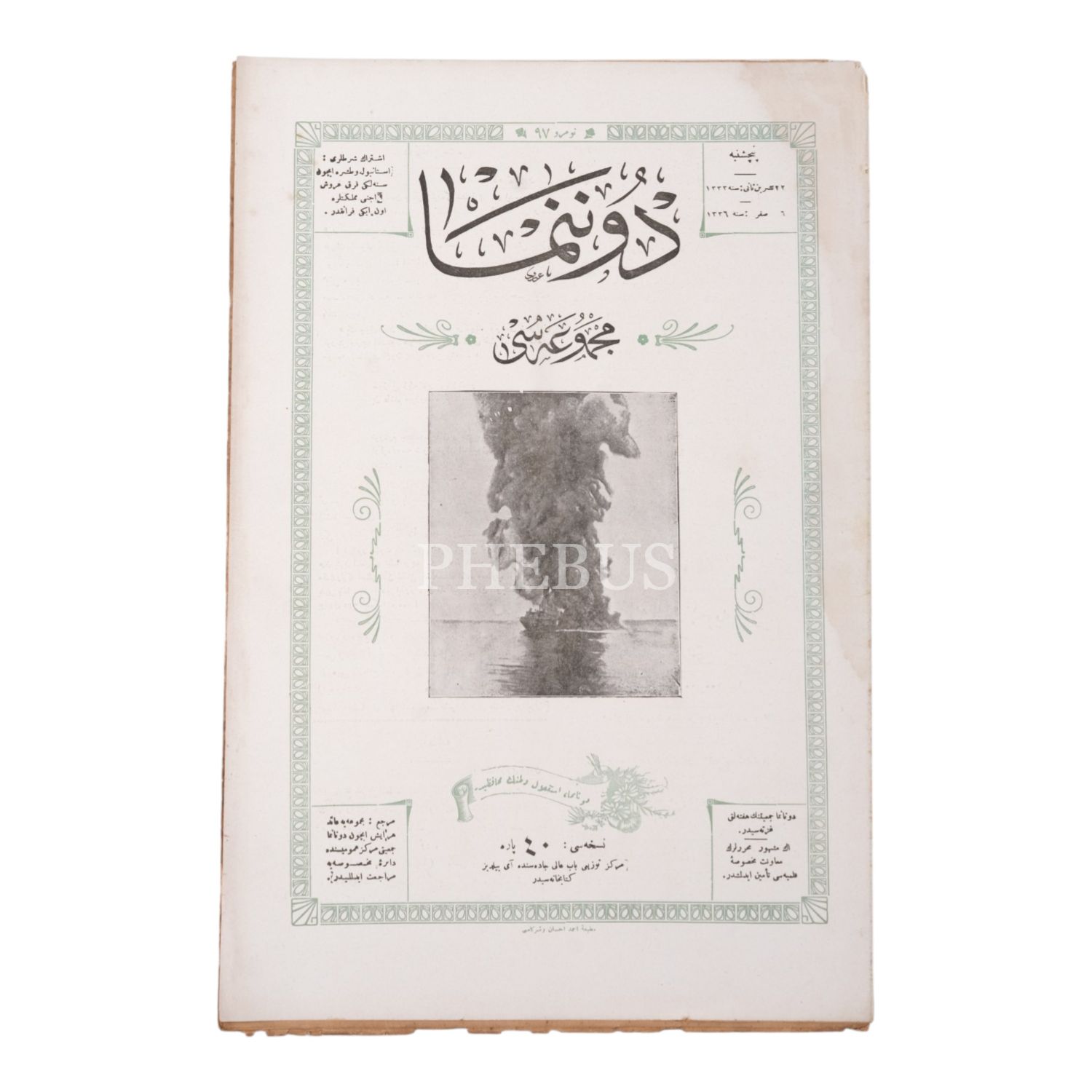 Birinci Dünya Savaşı´nda vurulan bir düşman zırhlısının fotoğrafına kapağında yer veren DONANMA MECMUASI´nın 22 Teşrinisani 1333 tarihli 97. sayısı, 16 sayfa, 25x38 cm....