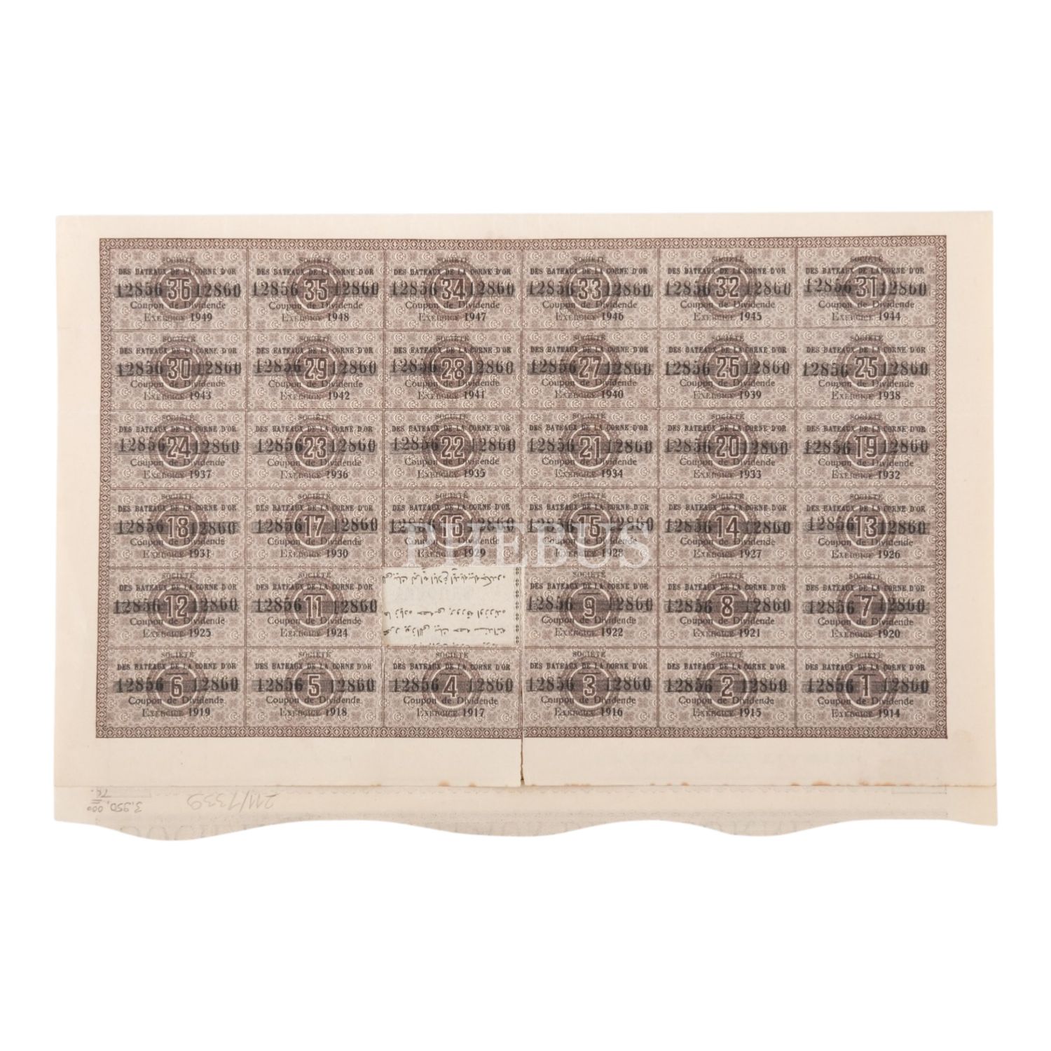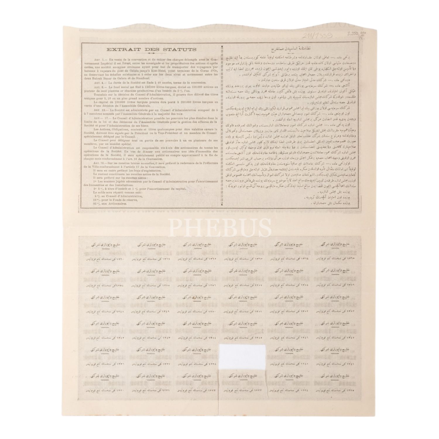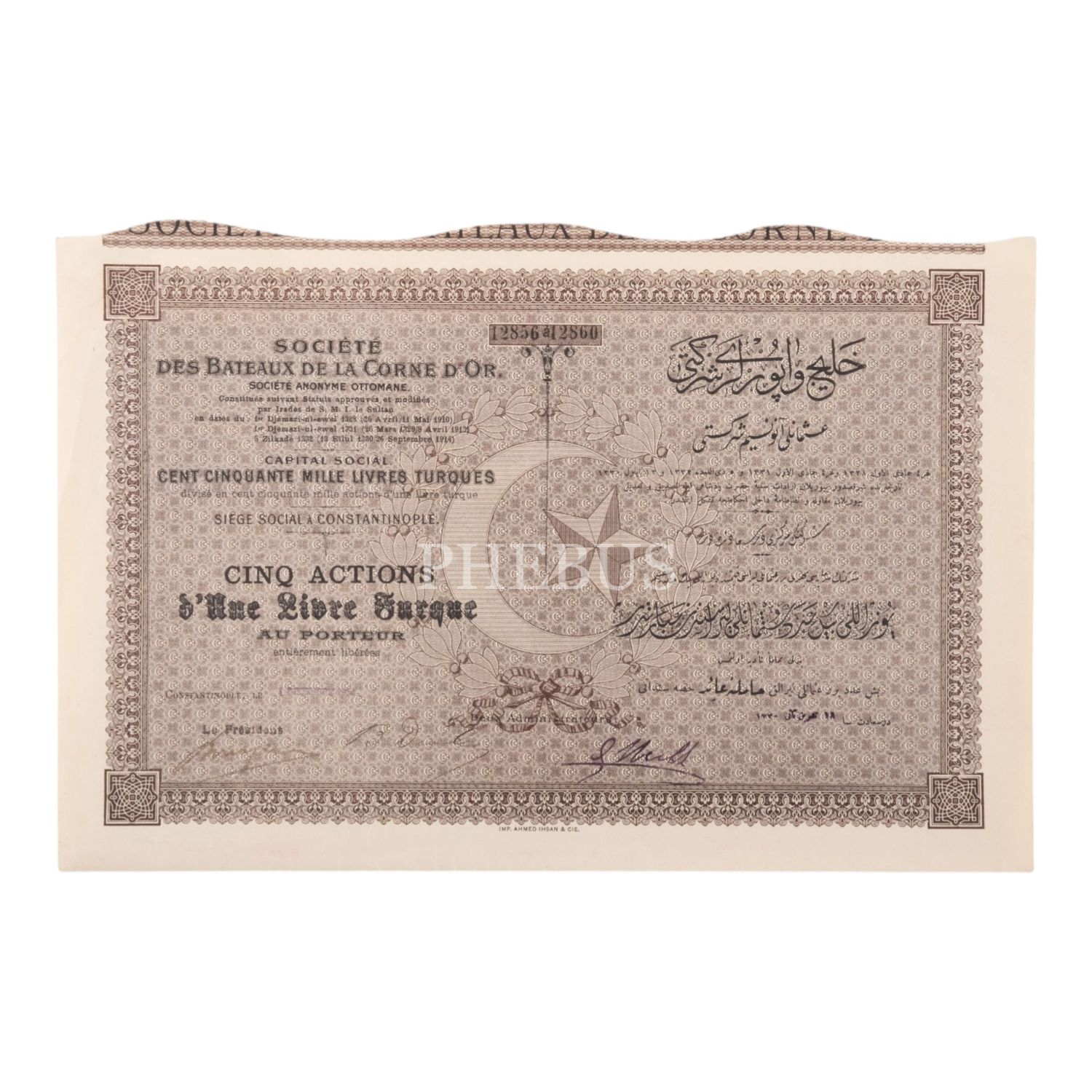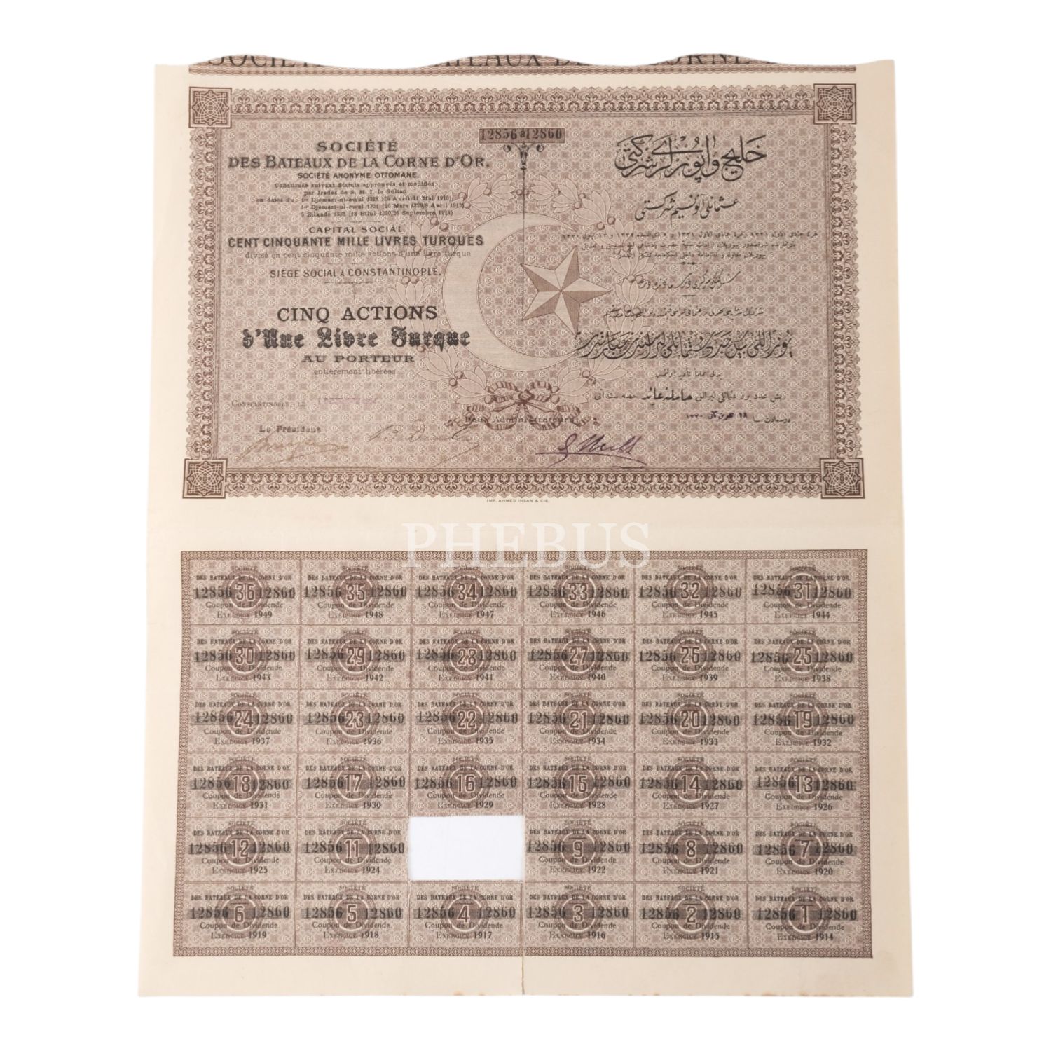 Haliç Vapurları Şirket-i Osmanlı Anonim Şirketi (Societe des Bateaux de la Corne d´Or Societe Anonyme Ottomane) hisse senedi, 1914, 37x47 cm...