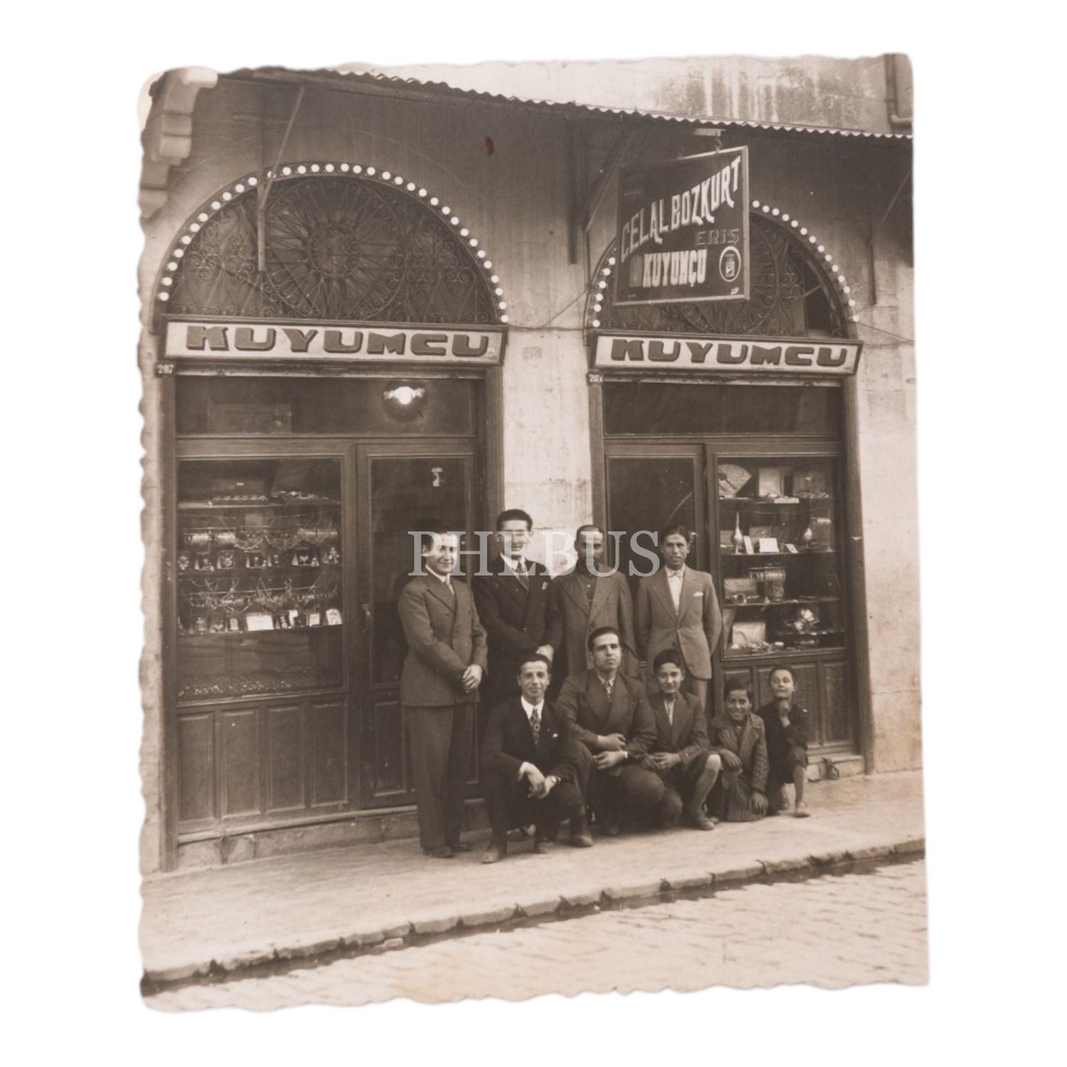 Gaziantep, Gaziler Caddesi´nde yer alan "Kuyumcu Celal Bozkurt Eriş" dükkânı önünde çekilmiş bir hatıra fotoğrafı, 7,5x9 cm...