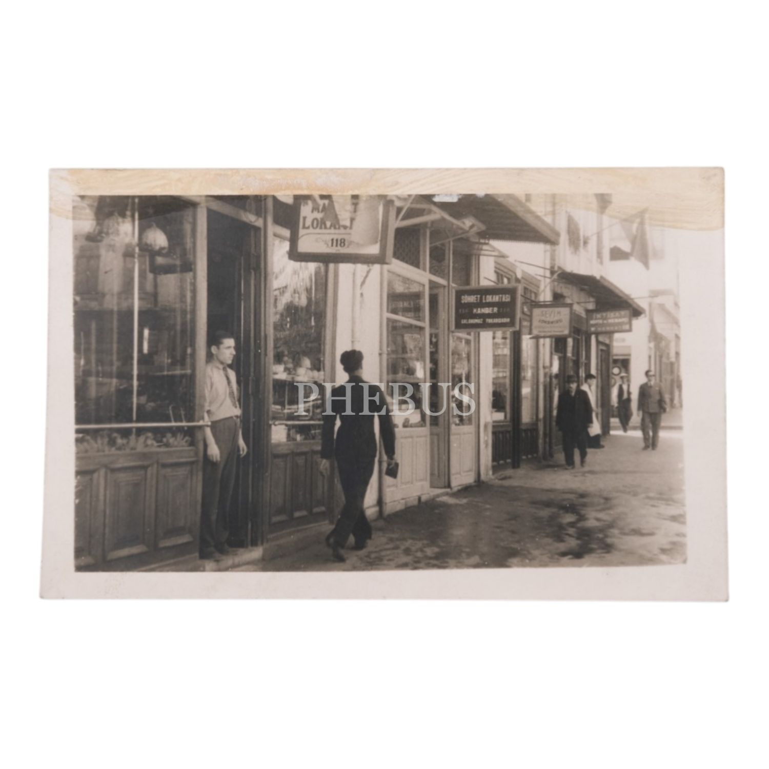 Yan yana sıralanmış lokantaların görüldüğü bir sokak enstantanesi, tabelası okunabilenler: Şöhret Lokantası - Sevim Lokantası - İktisat Köfte ve Kebapçı, 14x9 cm...