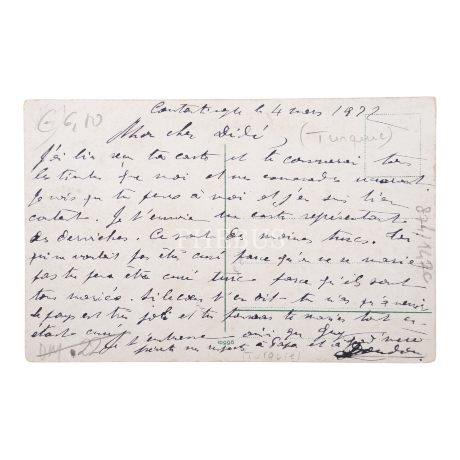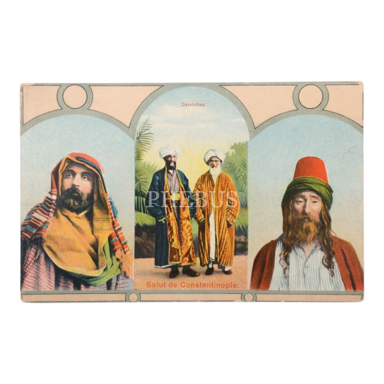 Dervişler görselli parçalı kartpostal, "Derviches - Salut de Constantinople", 14x9 cm...