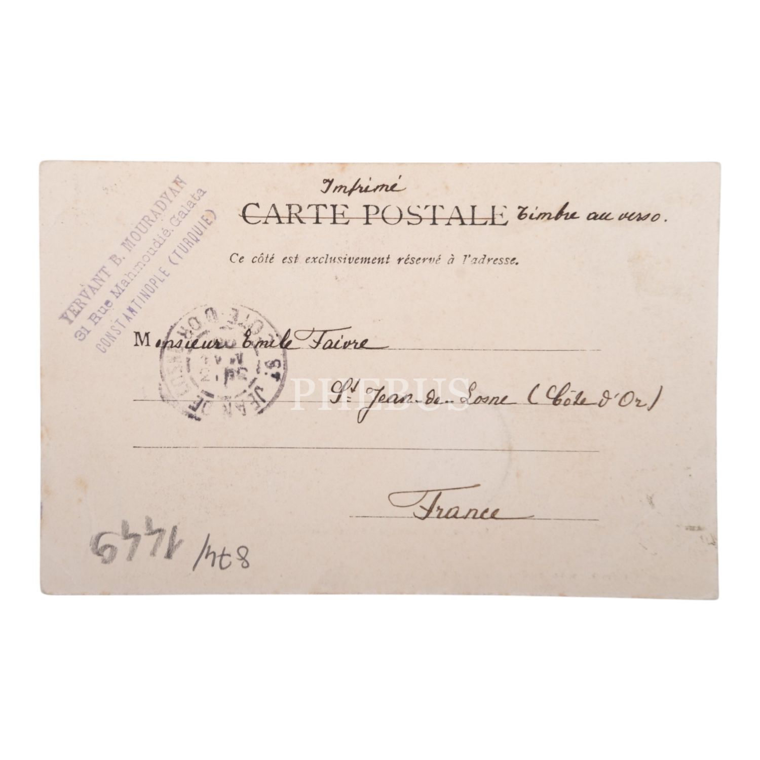 Postadan geçmiş. Arka yüzü "Yervant B. Mouradyan -31 Rue Mahmoudie Galata- Constantinople (Turquie)" damgalı.