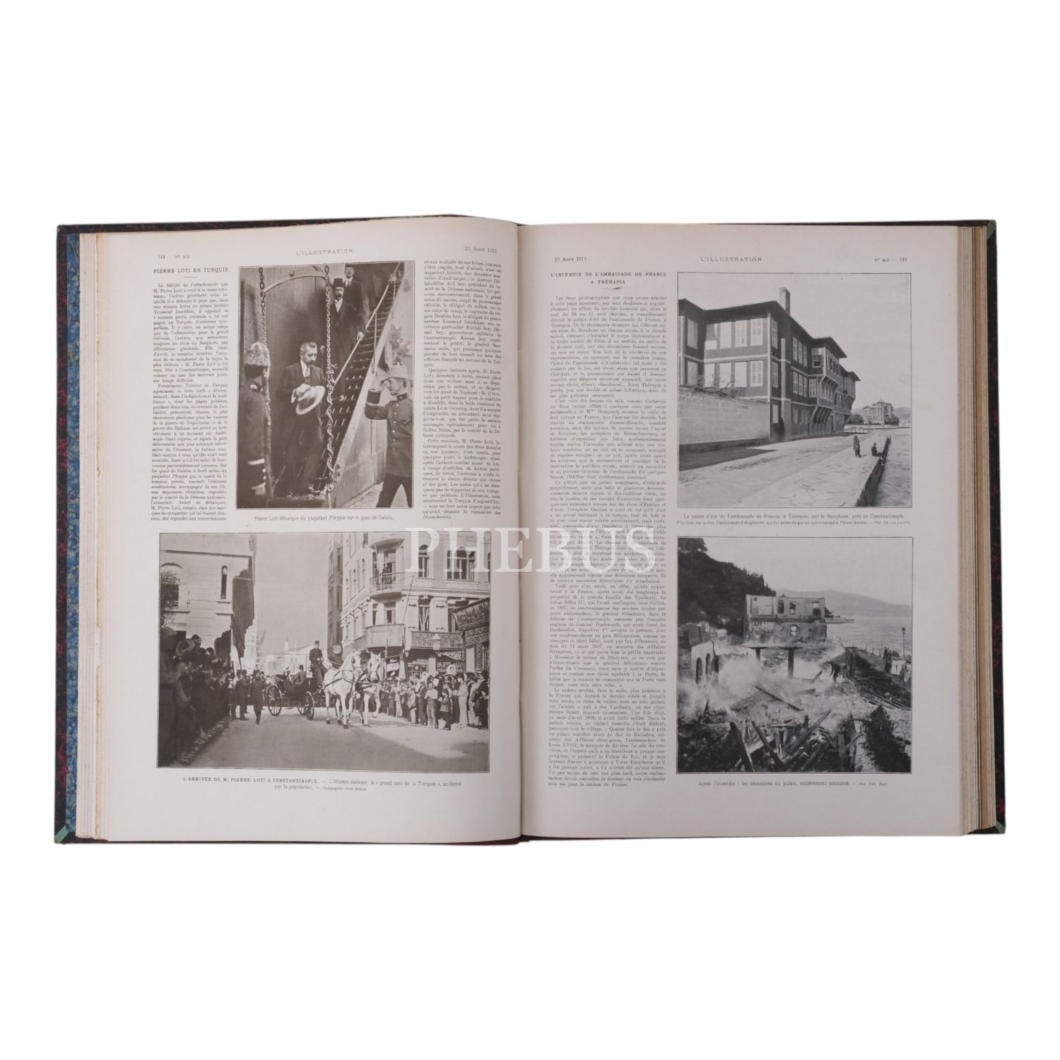 23 Ağustos sayısında Pierre Loti´nin İstanbul´a gelişini ve Batı Anadolu´ya gidişini gösteren iki fotoğraf, karşı sayfada da Fransa´nın Tarabya´daki yaz konsolosluk binasının sağlam hali ve yangın sonrası durumu görülüyor.