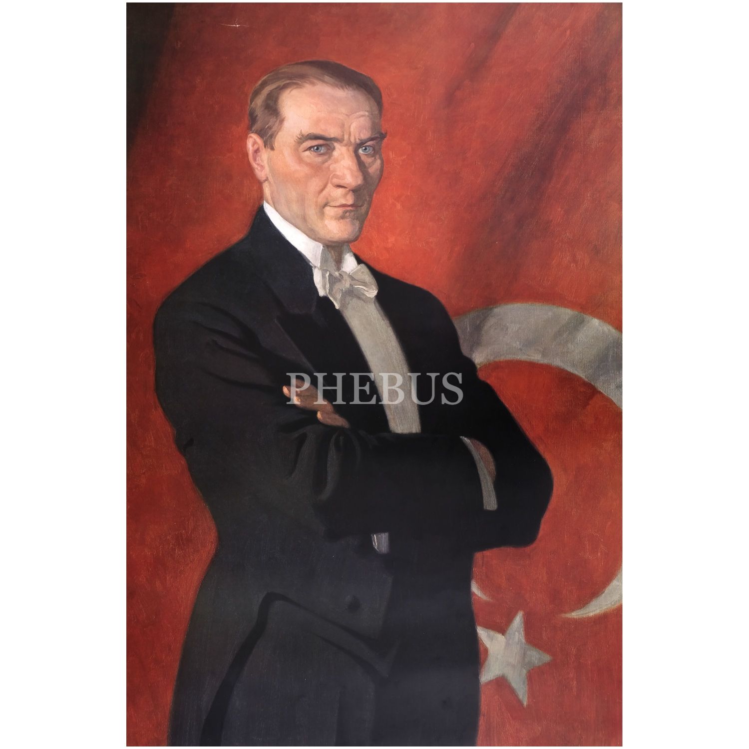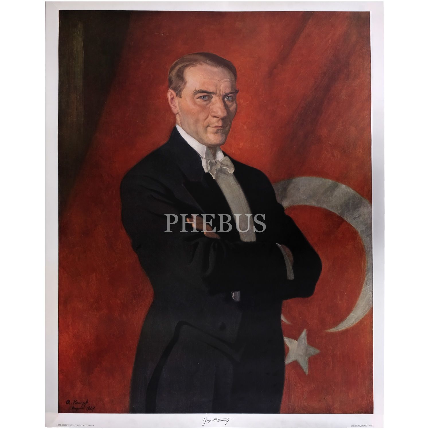 Mustafa Kemal Atatürk´ün, Alman ressam Arthur Kampf tarafından sivil kıyafetle resmedildiği tablonun, Türk Tayyare Cemiyeti´ne bağış sağlamak için 1927 yılında Viyana Hermes Matbaası´nda basılmış afişi, 87x109 cm...