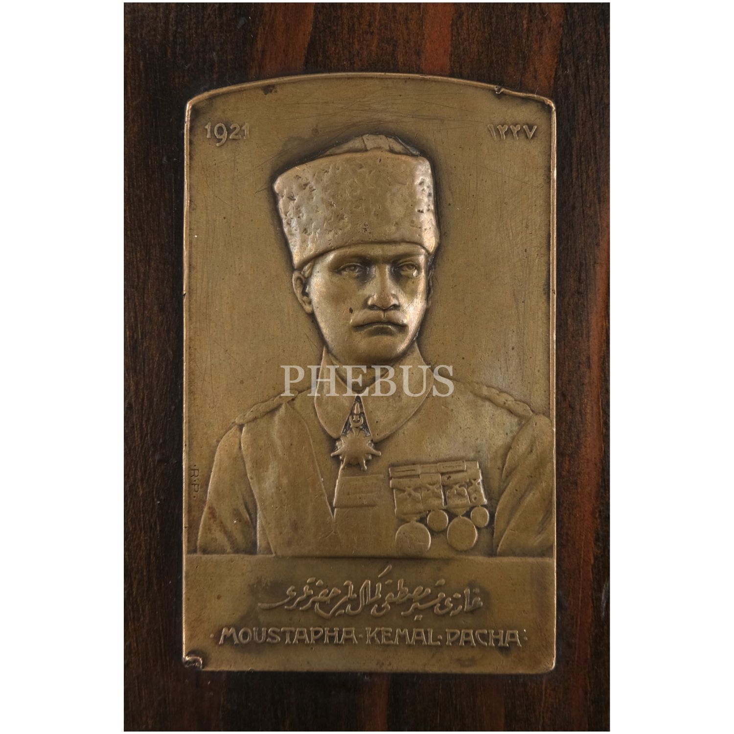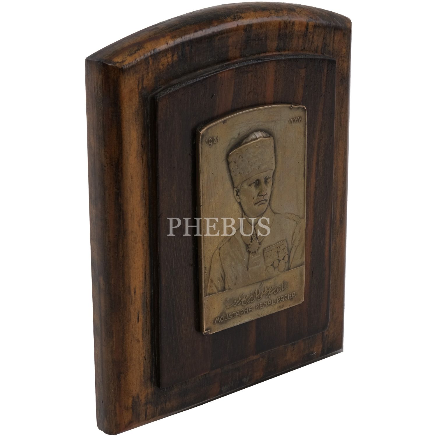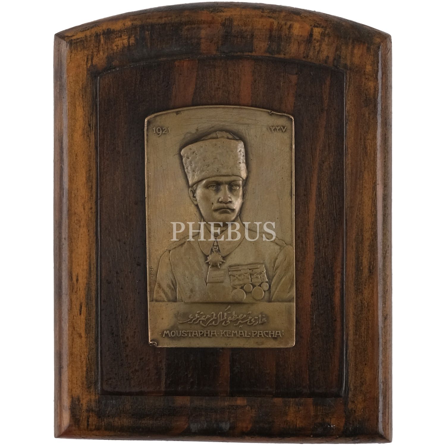 Osmanlıca "Gazi Mustafa Kemal Paşa Hazretleri" yazılı ve 1921 tarihli pirinç rölyef, ahşapa marufle, 5x7 cm...
