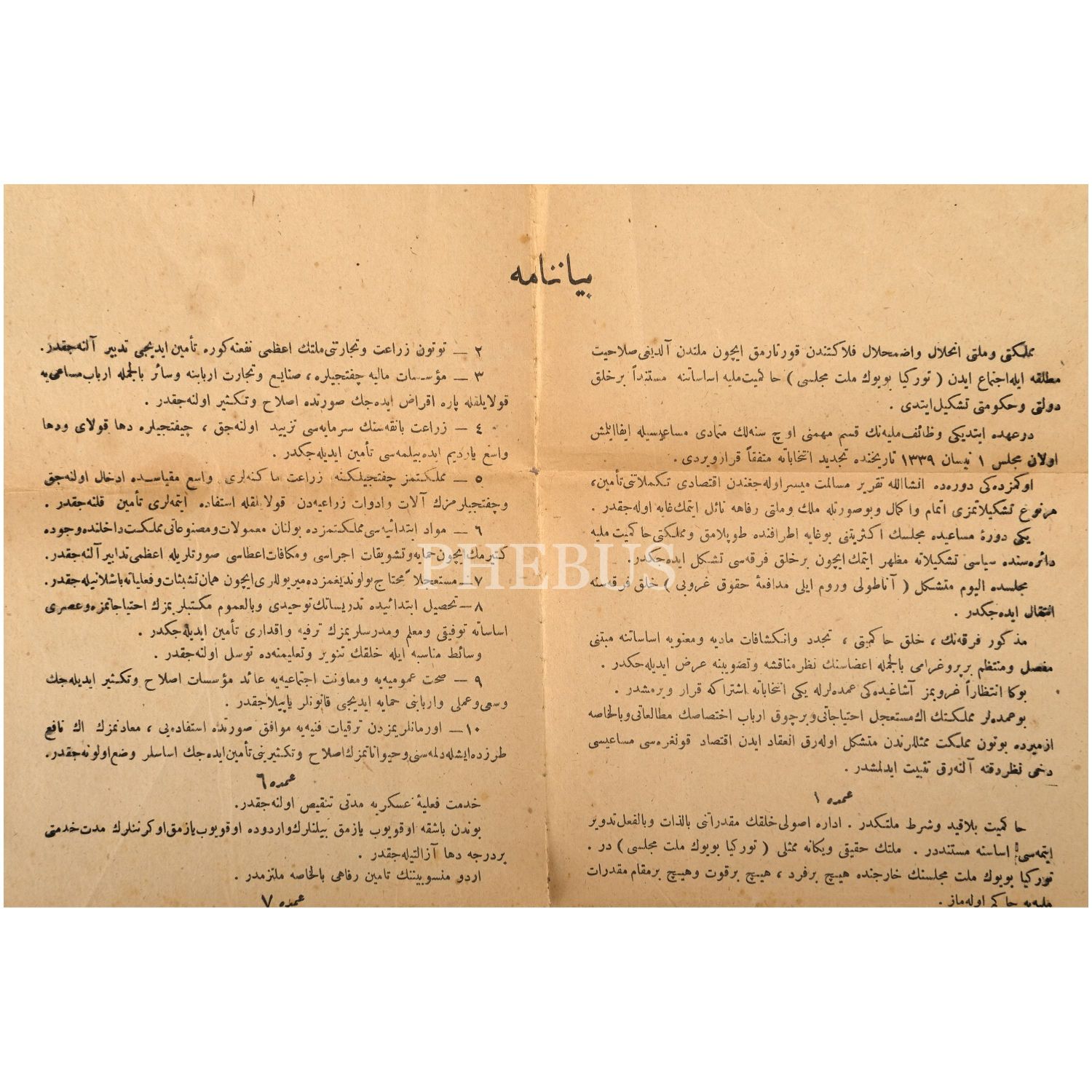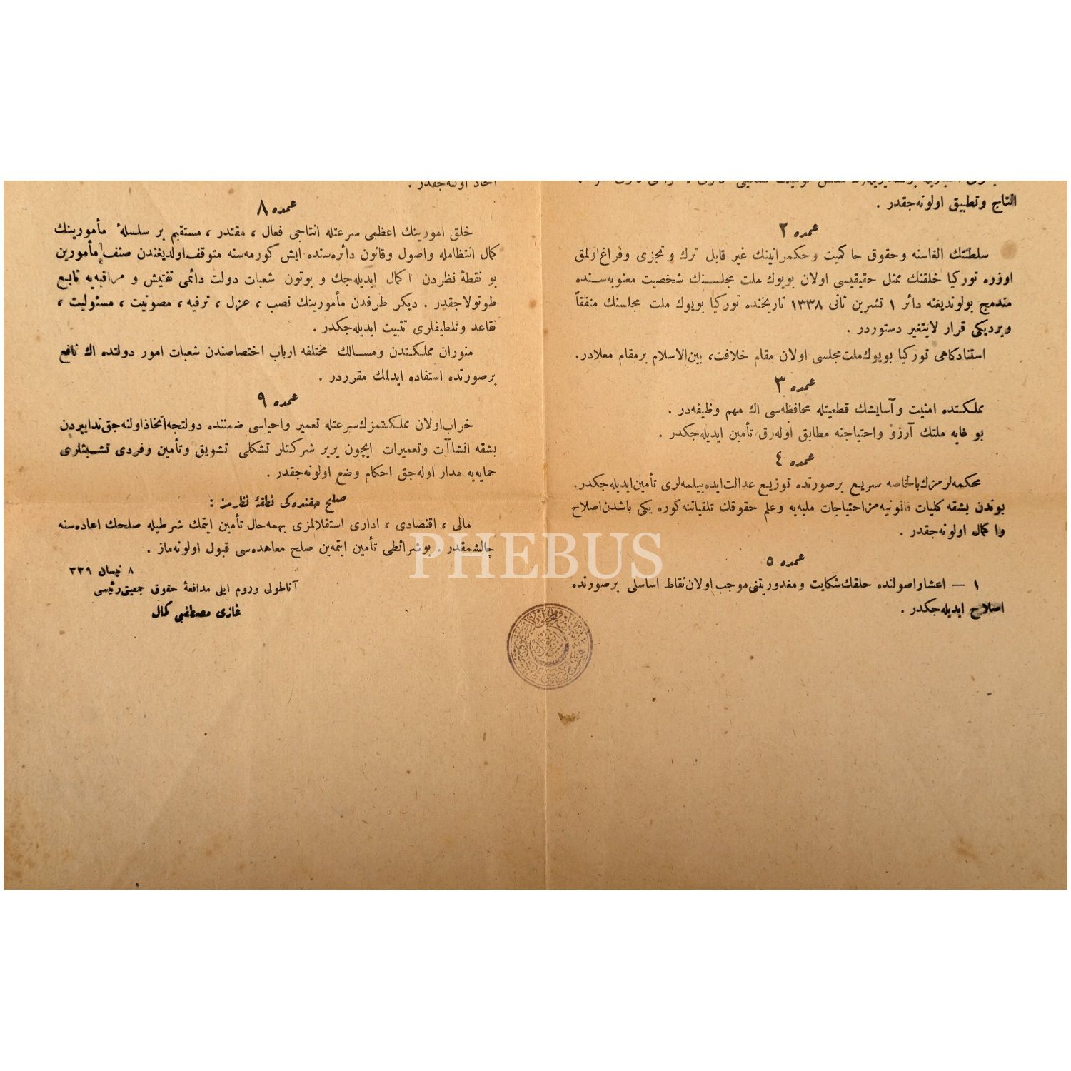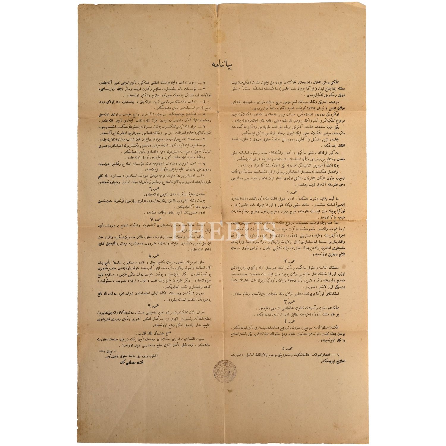 Mustafa Kemal Atatürk´ün, 8 Nisan 1923 tarihinde, Türkiye Büyük Millet Meclisi´nin birinci dönemi sona ermeden önce "Anadolu ve Rumeli Müdafaa-i Hukuk Cemiyeti Reisi Gazi Mustafa Kemal" imzasıyla yayımladığı 9 Umde ya da 9 İlke olarak bilinen beyannamesi, 31x47 cm...
