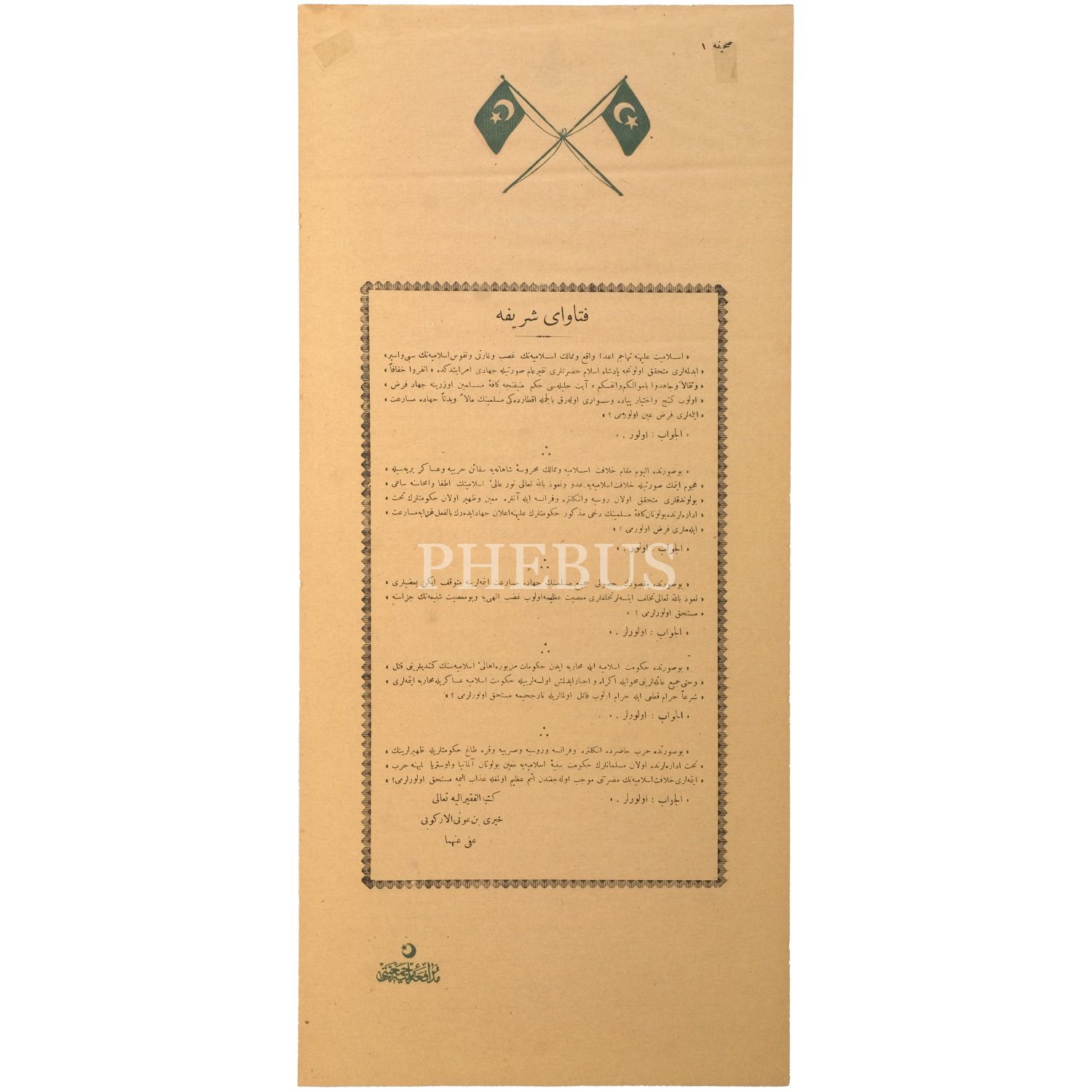 Kırmızı Bayraklı tarafta Sultan Mehmed Reşad Han ve Başkumandan Vekili Enver Paşa imzalı Beyanname İ Hümayun sureti vardır. Yeşil Bayraklı tarafta ise dönemin Şeyhülislamı Ürgüplü Hayri Efendi imzalı fetvayı şerif bulunmaktadır. 11 Kasım 1914 tarihinden itibaren 3 gün boyunca Fatih Camii avlusunda fetva emini Ali Haydar tarafından 3 gün boyunca halka okutulmuştur.