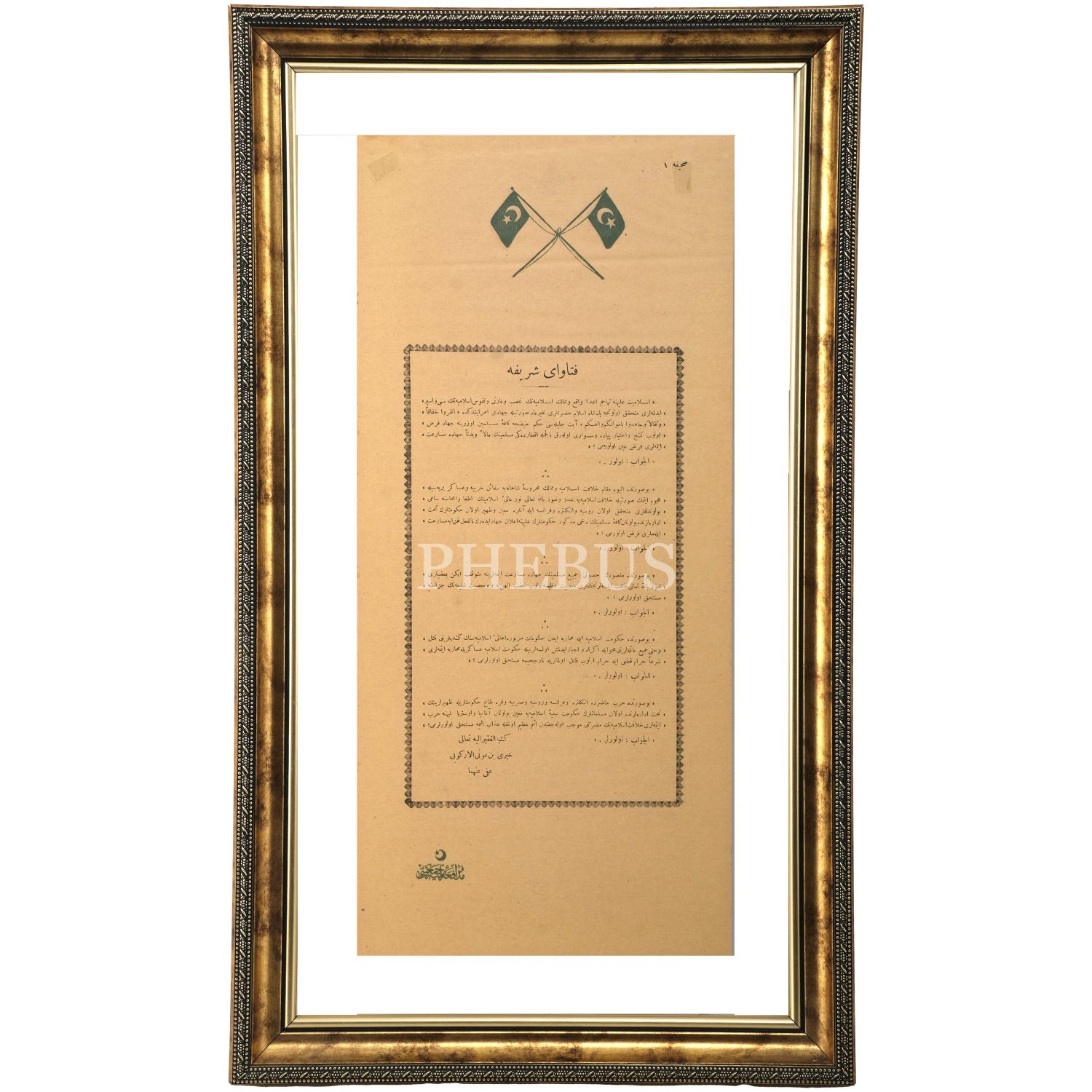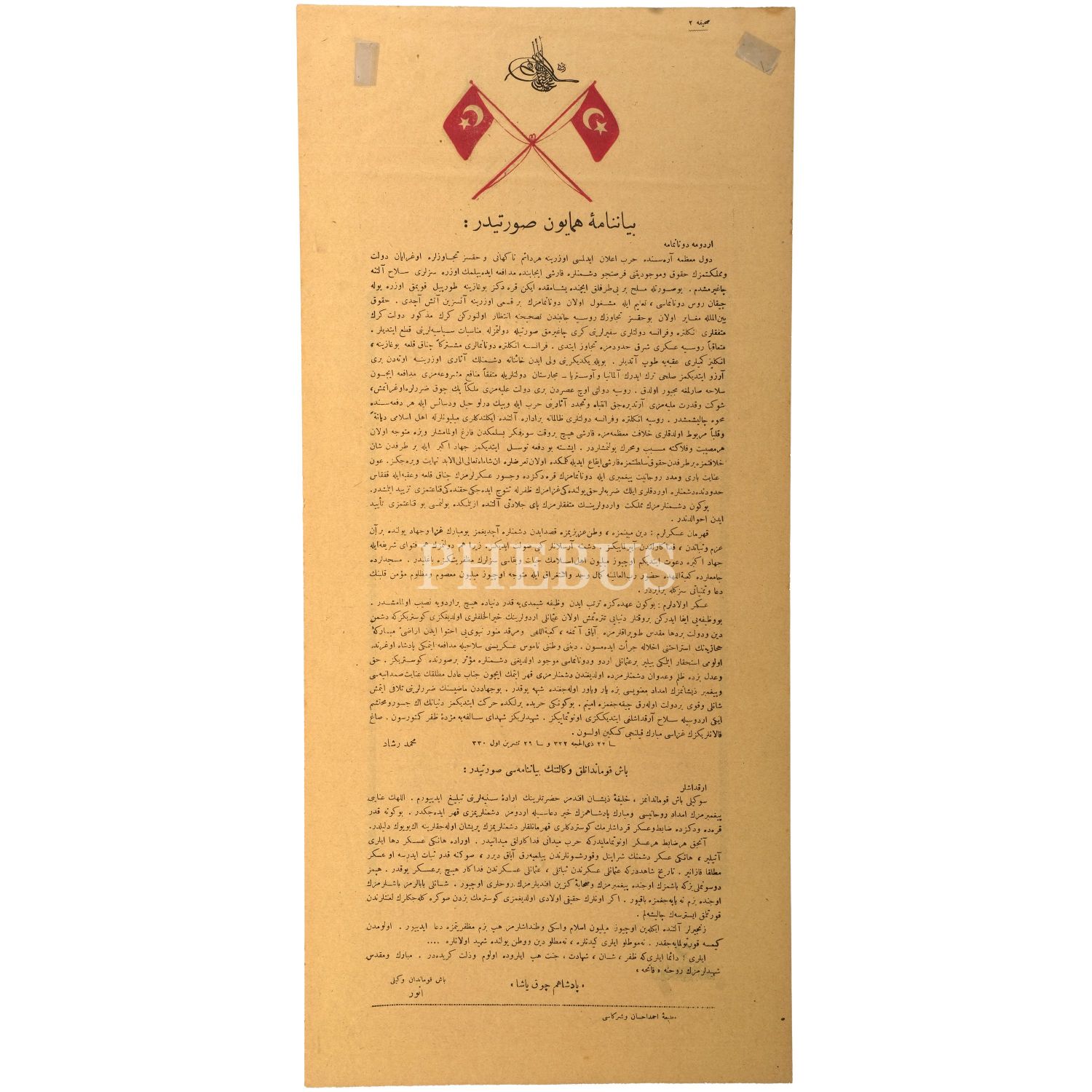 Osmanlı Devleti´nin 1332 (1914) senesinde Birinci Cihan Harbi´ne girmesi üzerine Padişah V. Mehmed Reşad´ın ve Başkumandan Vekili Enver Paşa´nın Osmanlı askerine hitaben kaleme aldığı beyanname, çerçevesiyle birlikte 54x27 cm...