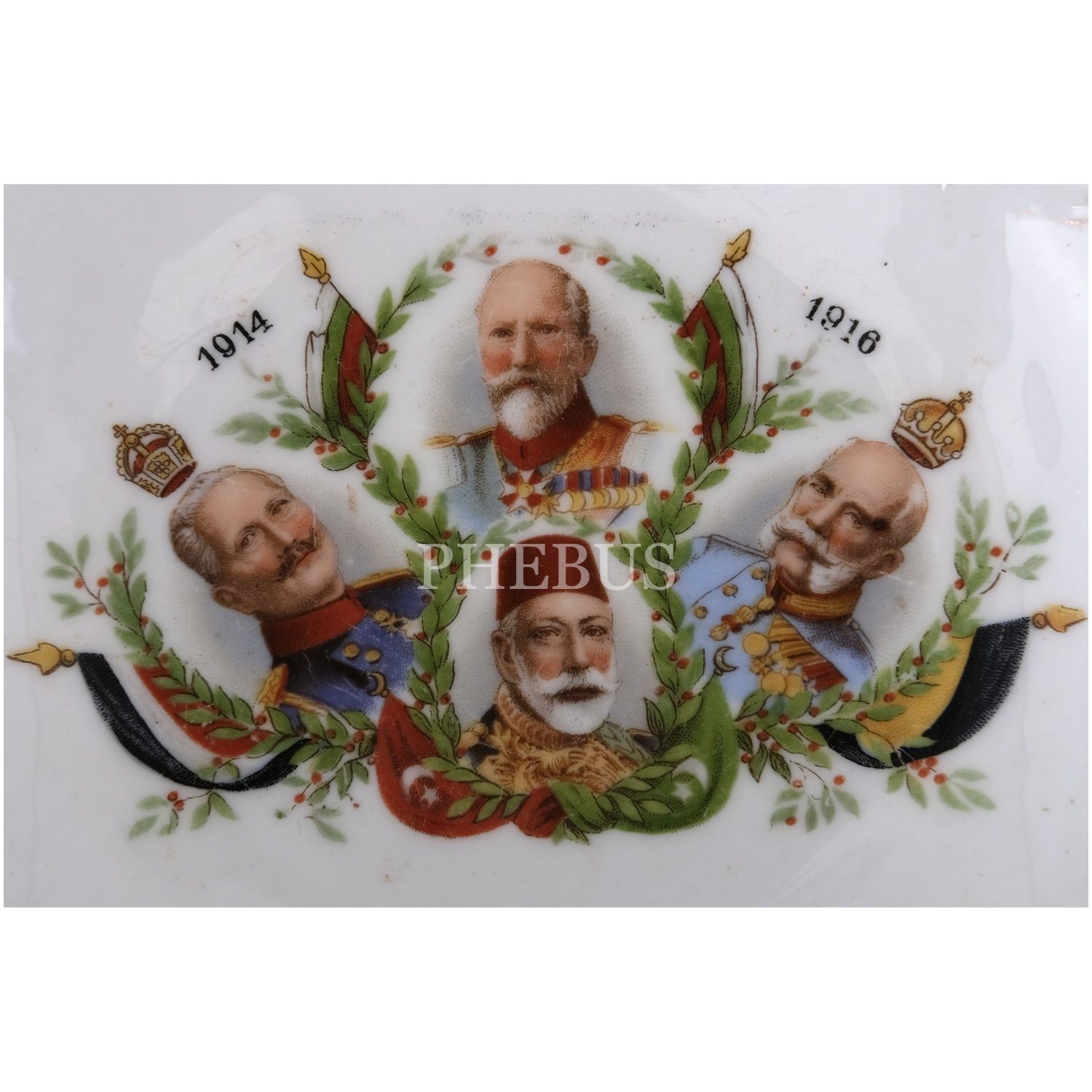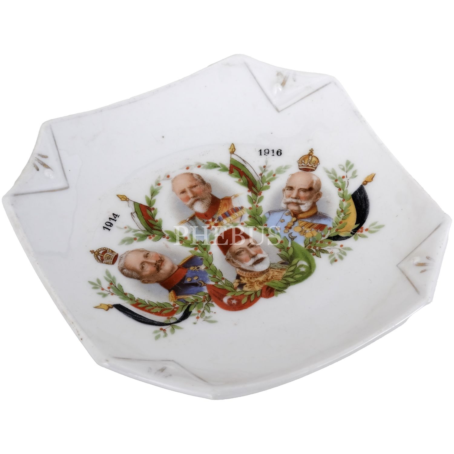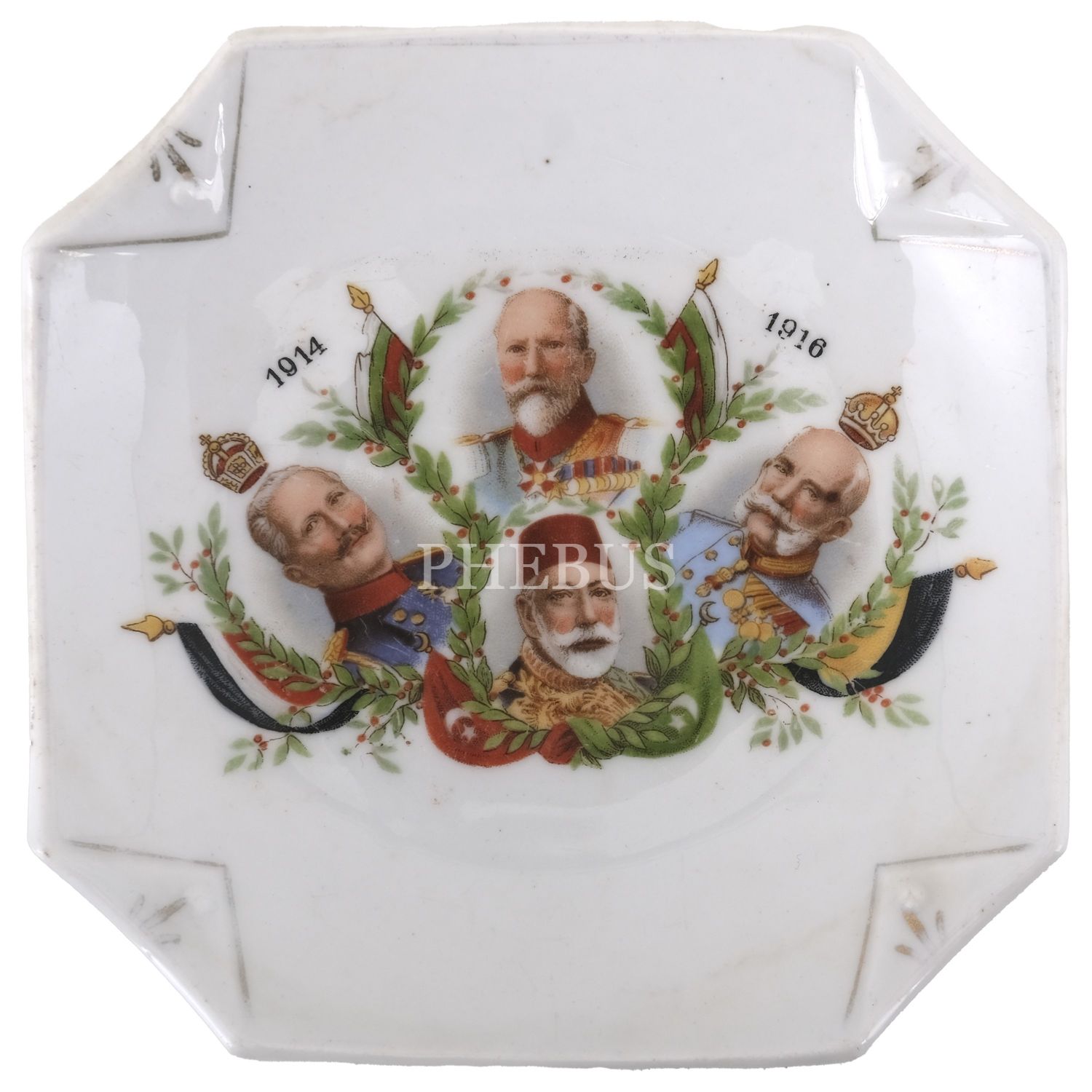 Birinci Dünya Savaşı yıllarından, merkezinde İttifak liderlerinin portre resimlerinin yer aldığı, "1914-1916” yazılı porselen küllük, 13,5x13,5 cm...