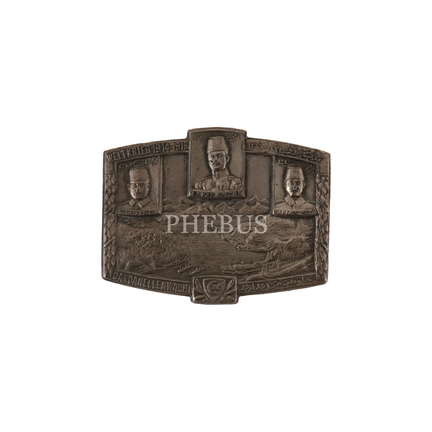 Enver Paşa, Cevat (Çobanlı) Paşa ve Liman von Sanders´in portreleriyle birlikte Çanakkale Boğazı´nın tasvirinin yer aldığı, Almanca ve Osmanlıca yazılı İttifak rozeti, 4x3 cm...