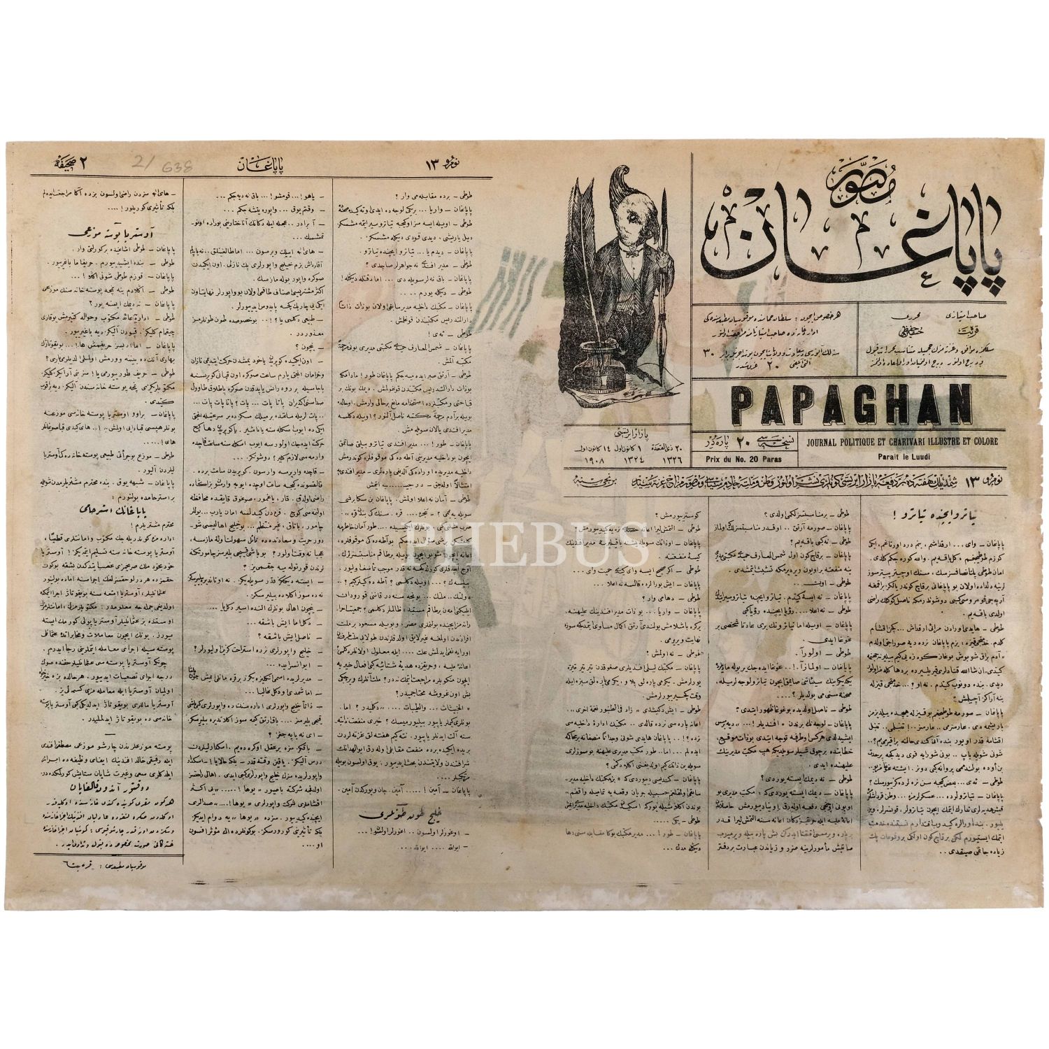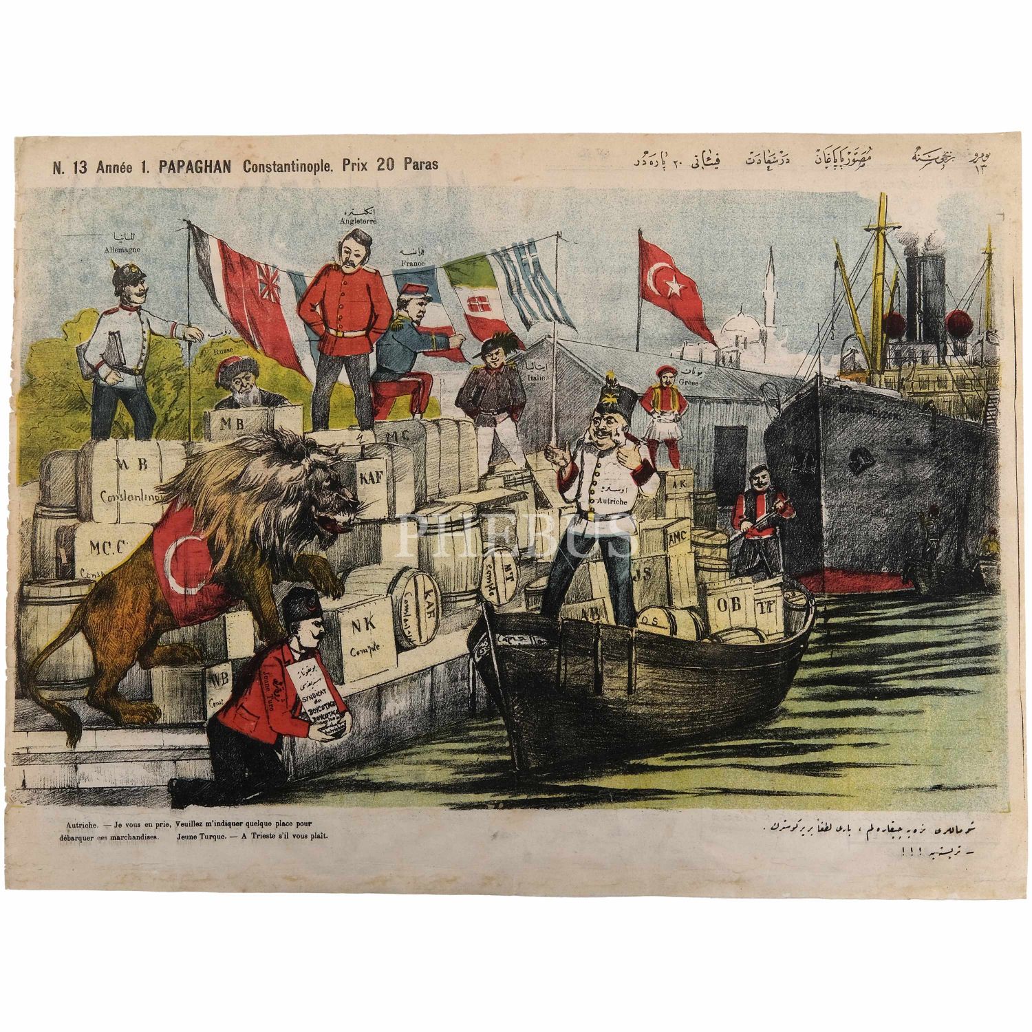 Avusturya-Macaristan İmparatorluğu´nun Bosna-Hersek´i ilhak etmesi üzerine Osmanlı halkının başlattığı, Türkiye tarihinin ilk organize boykot hareketini konu alan çizime yer verilen, Musavver Papağan dergisinin 13. sayısında yayımlanan afiş, 54x40 cm...