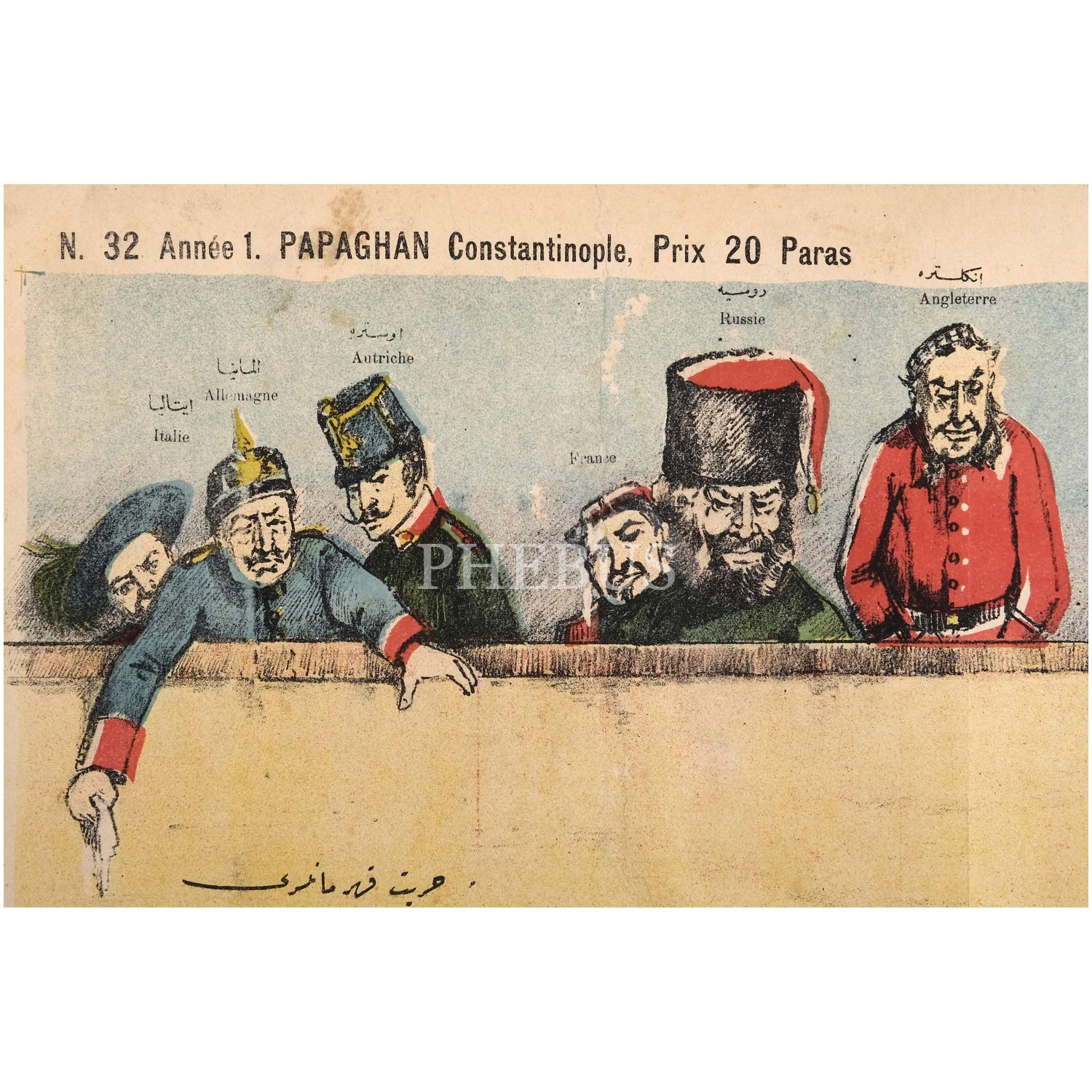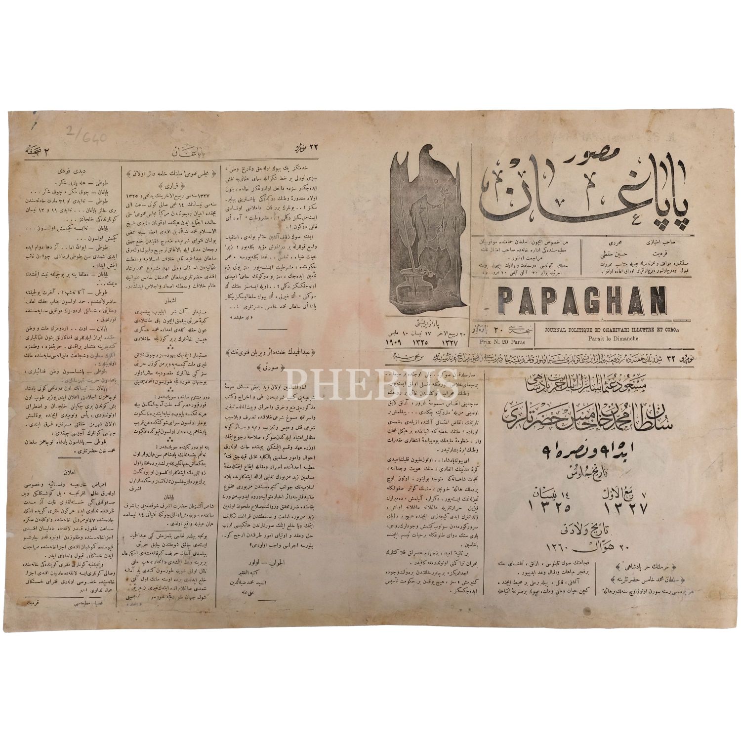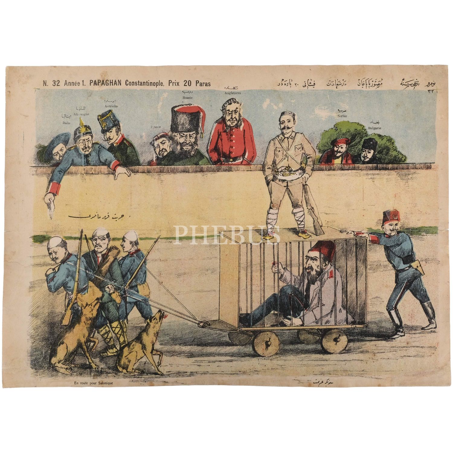 Sultan İkinci Abdülhamid´in tahttan indirilmesini konu alan çizime yer verilen, Musavver Papağan dergisinin 32. sayısı, 54x40 cm...