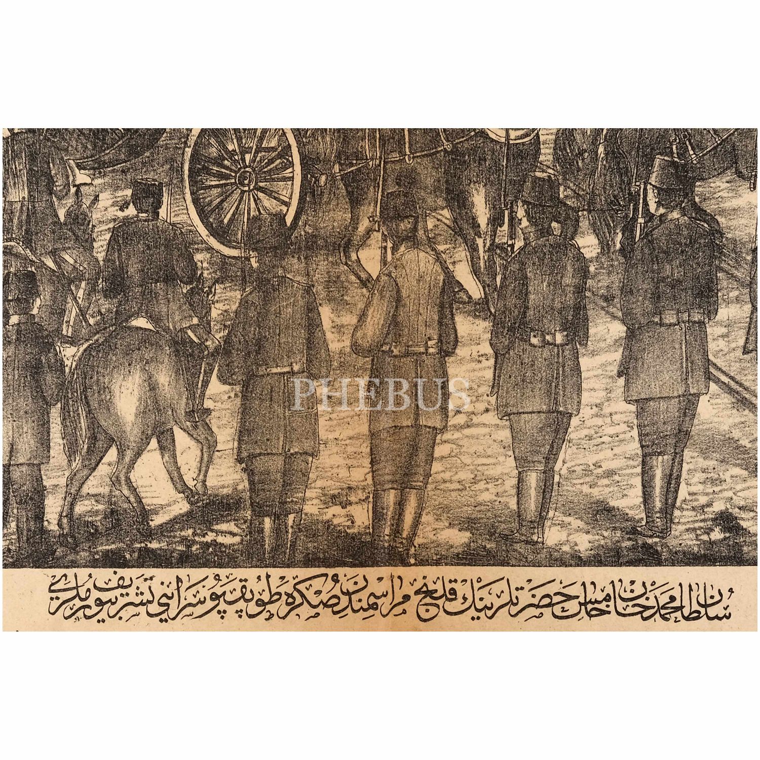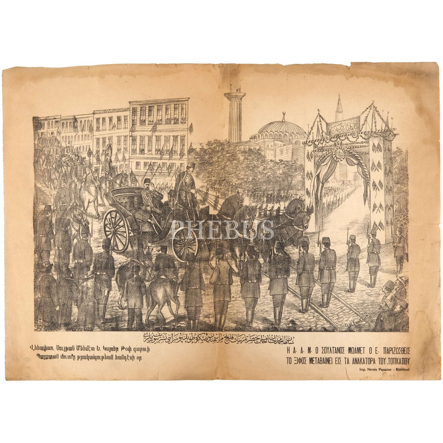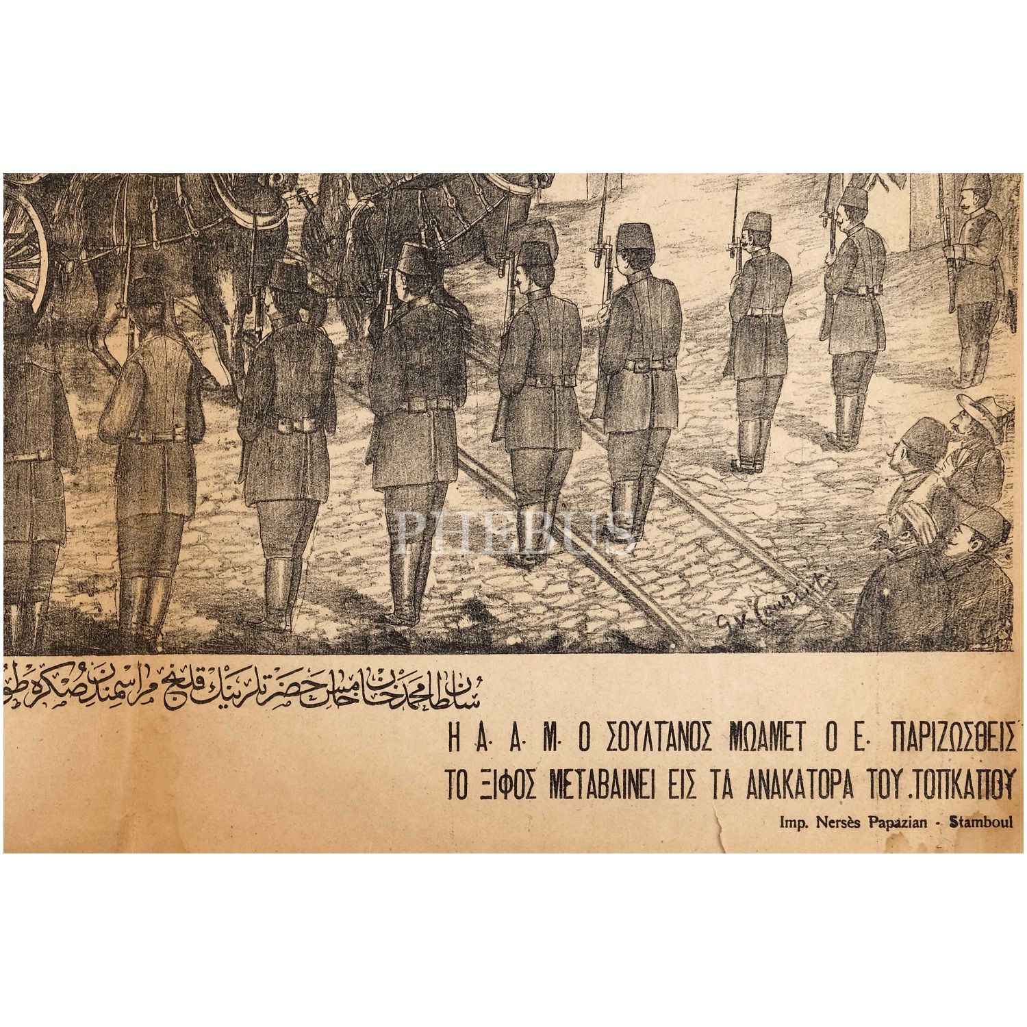 Sultan Mehmed Reşad´ın, Kılıç Kuşanma Merasimi´nden sonra Topkapı Sarayı´na girişinin resmedildiği, Osmanlıca, Rumca ve Ermenice "Sultan Mehmed Han Hamis Hazretlerinin Kılınç Merasiminden Sonra Topkapı Sarayı´nı Teşrif Buyurmaları" alt başlıklı afiş, Nerses Papazyan Matbaası, 57x41 cm..