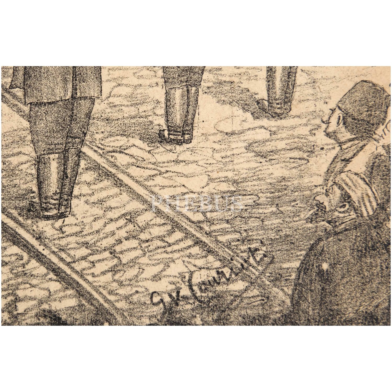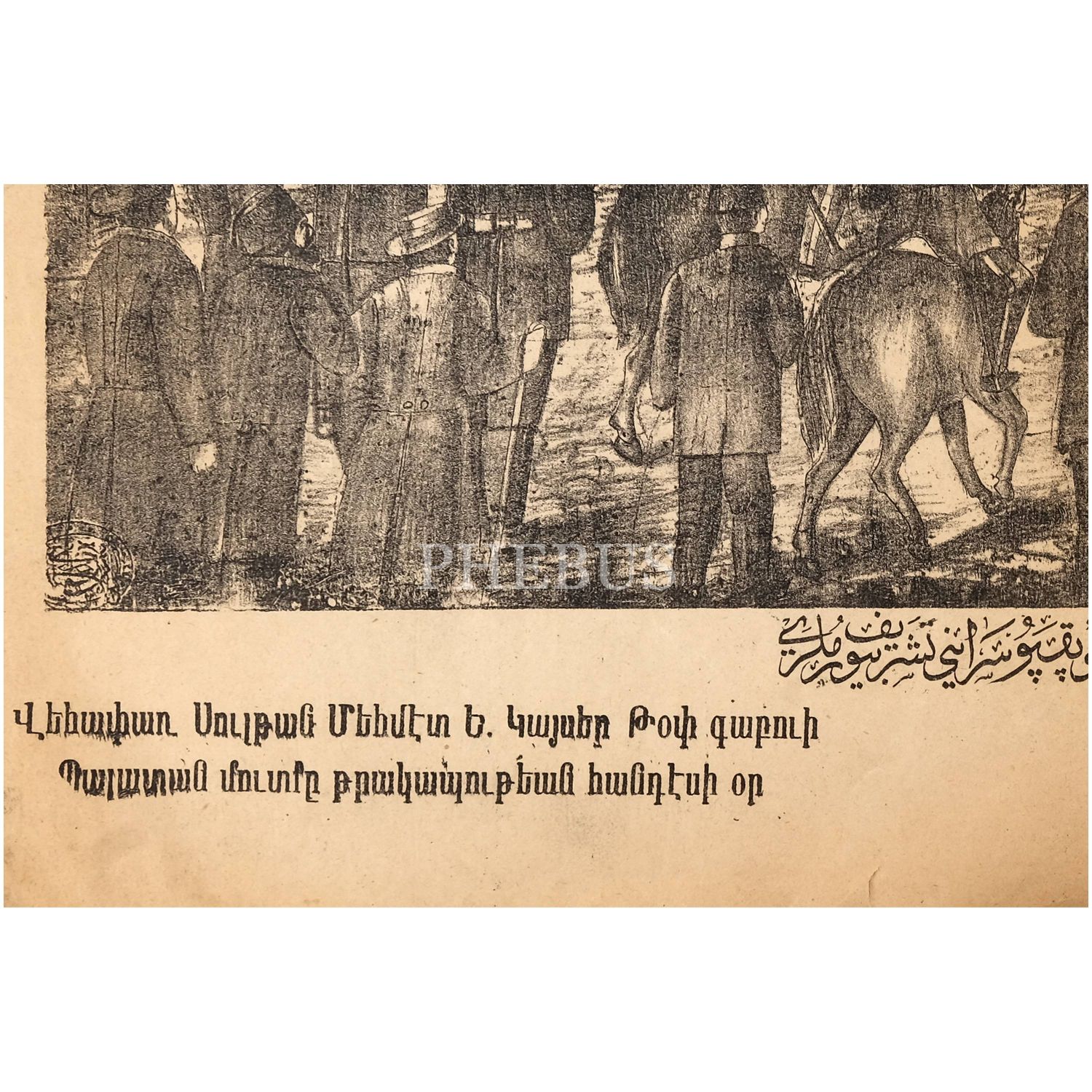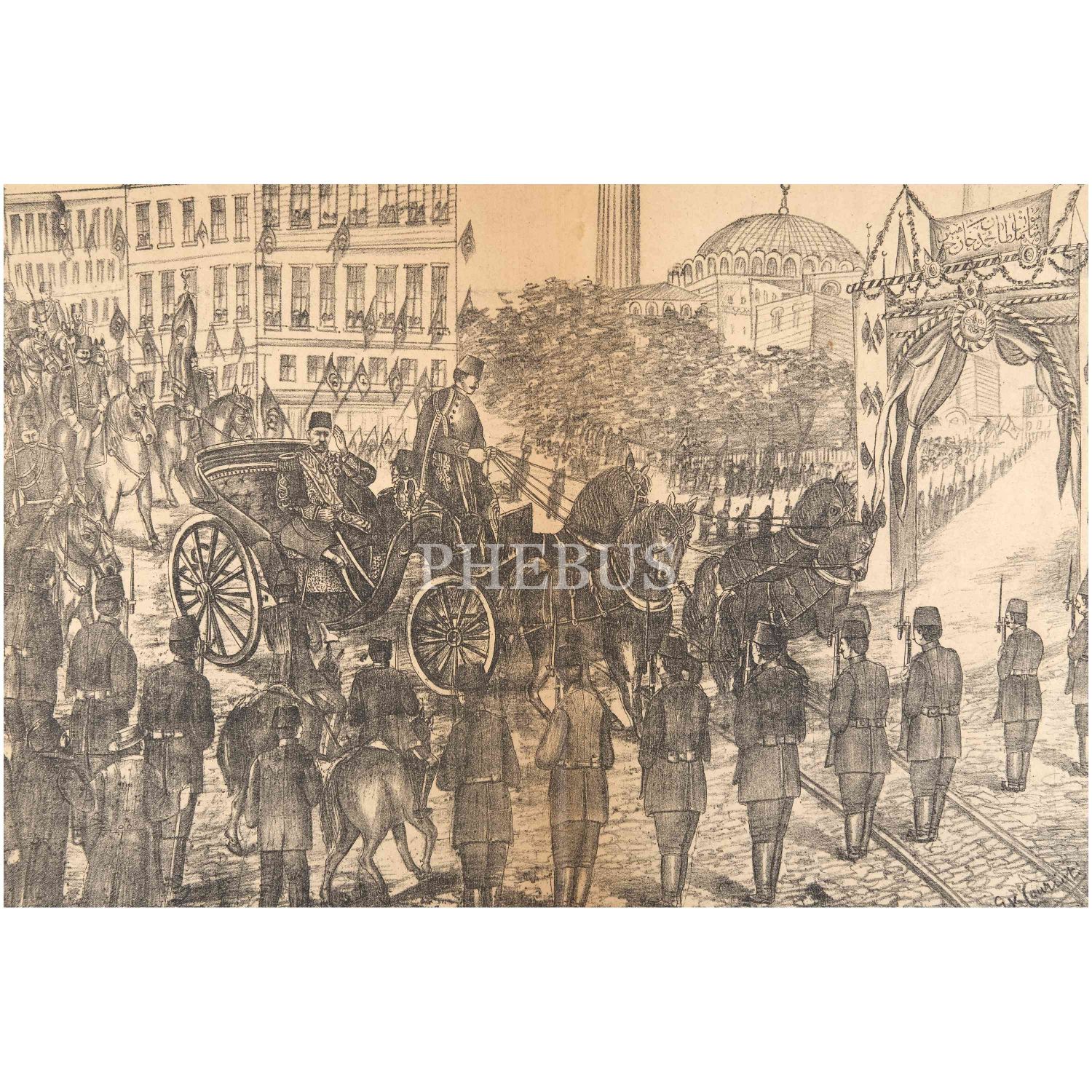 Sultan Mehmed Reşad´ın, Kılıç Kuşanma Merasimi´nden sonra Topkapı Sarayı´na girişinin resmedildiği, Osmanlıca, Rumca ve Ermenice "Sultan Mehmed Han Hamis Hazretlerinin Kılınç Merasiminden Sonra Topkapı Sarayı´nı Teşrif Buyurmaları" alt başlıklı afiş, Nerses Papazyan Matbaası, 57x41 cm..