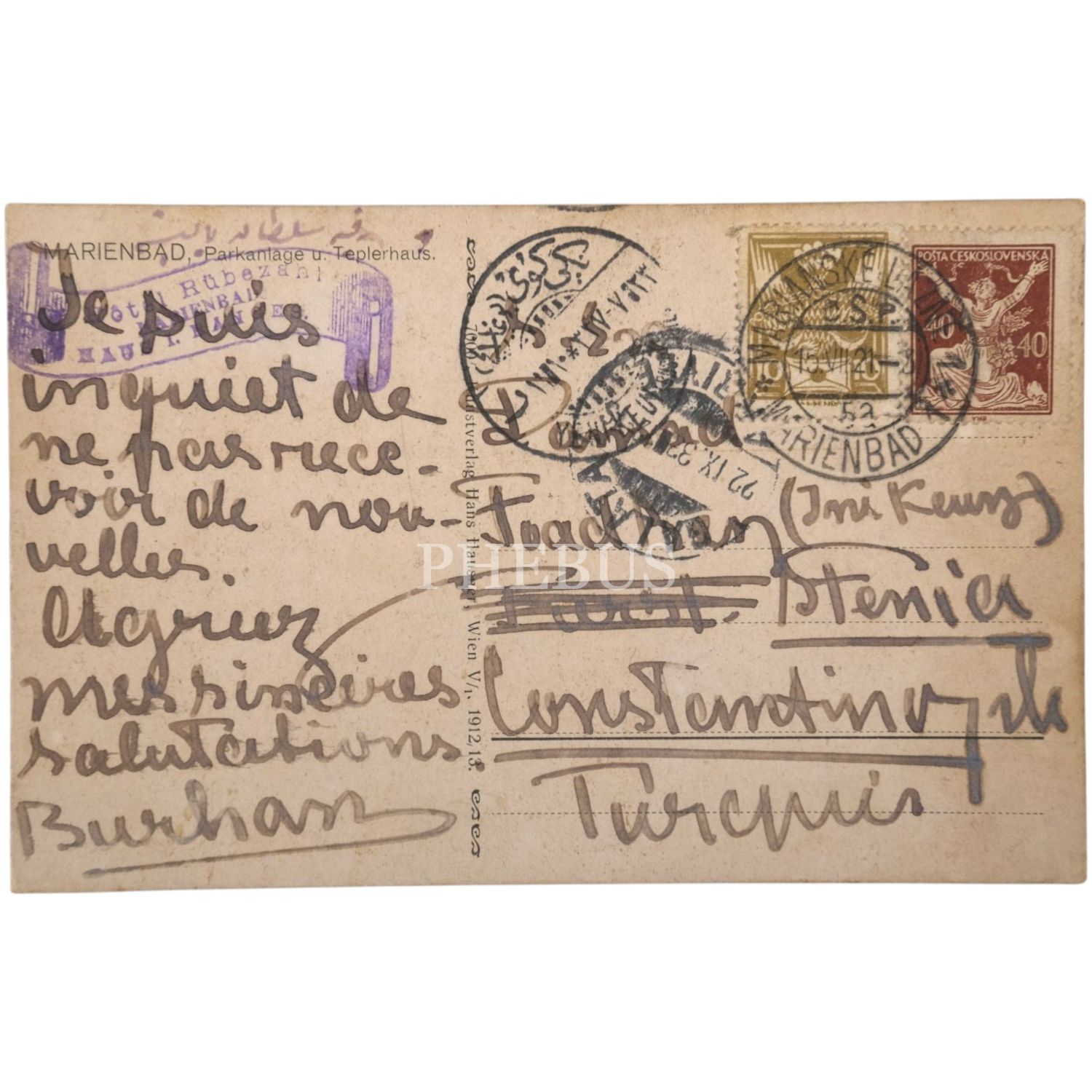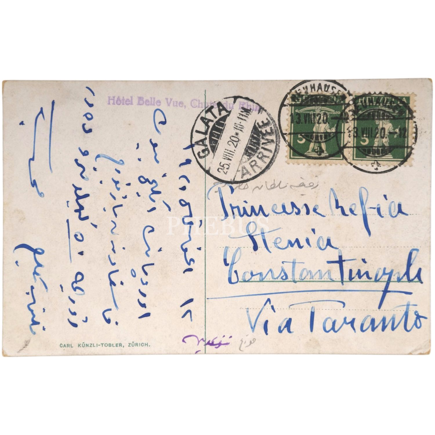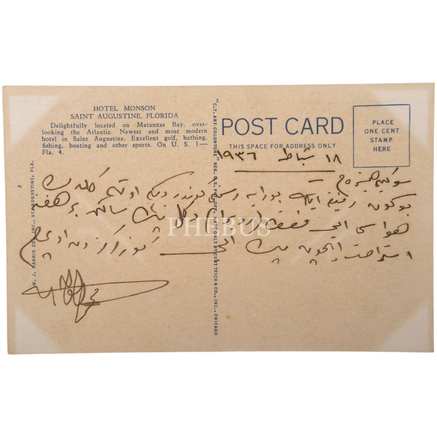 "Bugün refikamla buraya resmini gönderdiğim otele geldik. Havası iyi fakat (Riviera) değil pek sakin bir hafta istirahat için pek iyi gözlerinizden öperim."