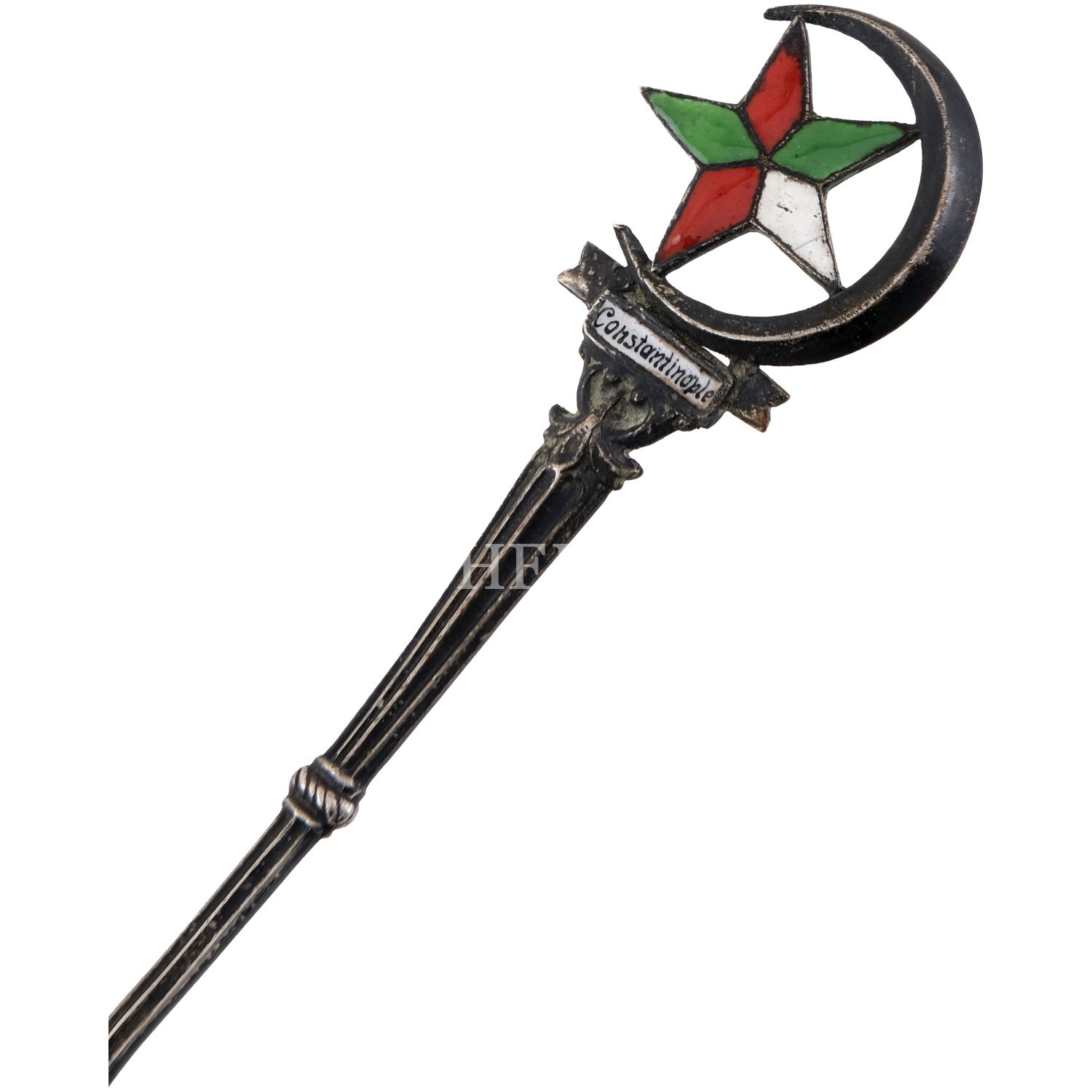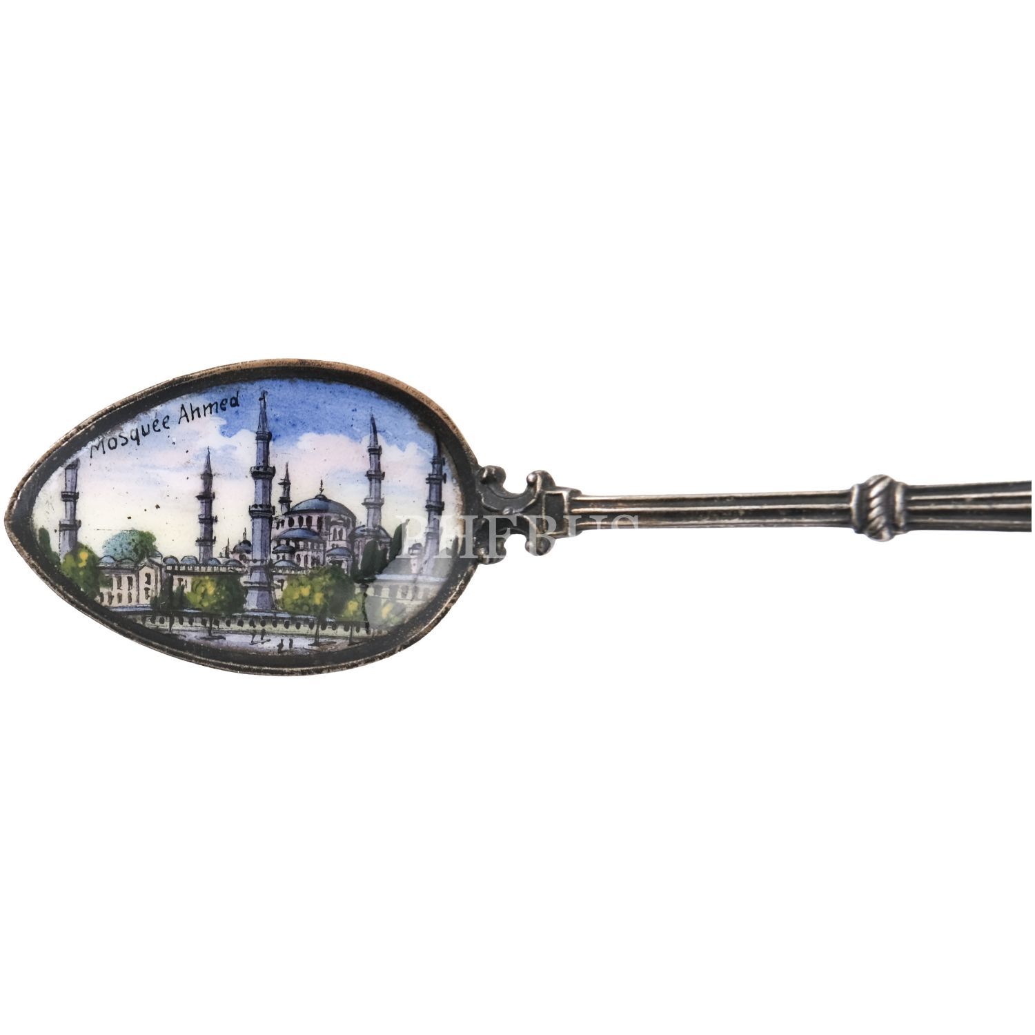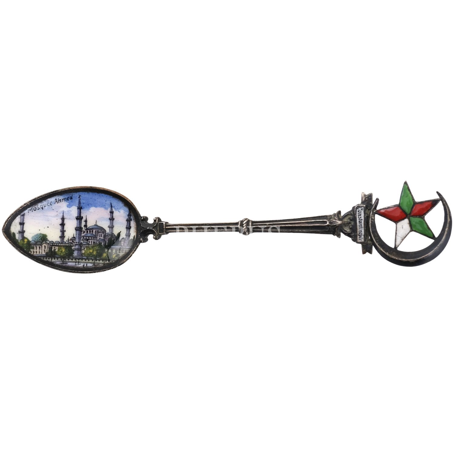 Merkezi Sultanahmet Camii görselli ve "Mosquee Ahmed" başlıklı, sapı ay-yıldız motifli ve "Constantinople" başlıklı mineli kaşık, 13 cm...