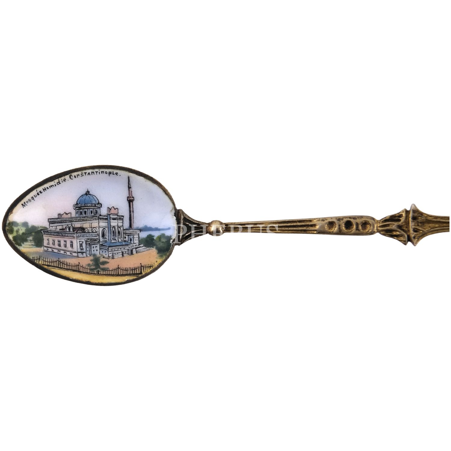 Merkezi Yıldız Hamidiye Camii görselli ve "Mosquee Hamidie - Constantinople" başlıklı, sapı tuğra motifli kaşık, 11,5 cm...